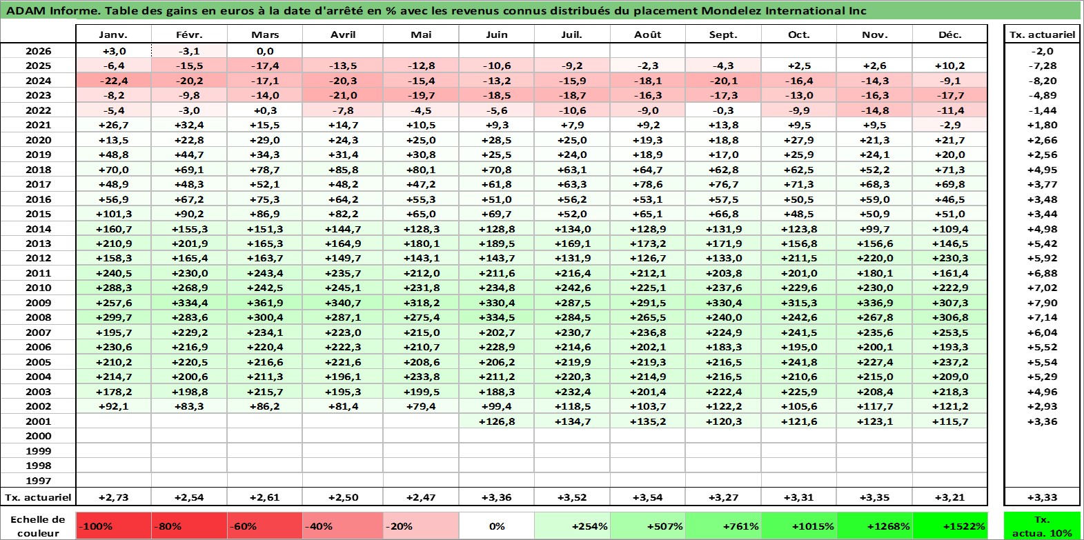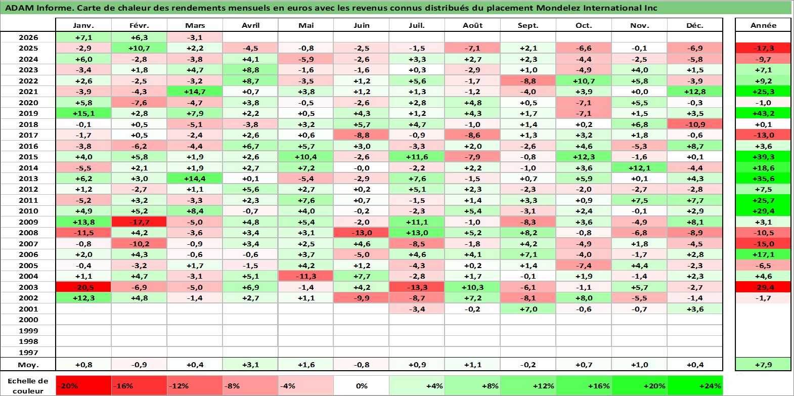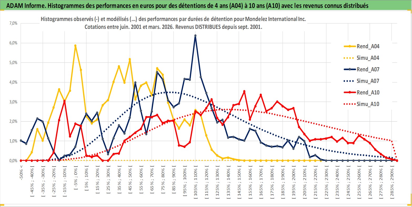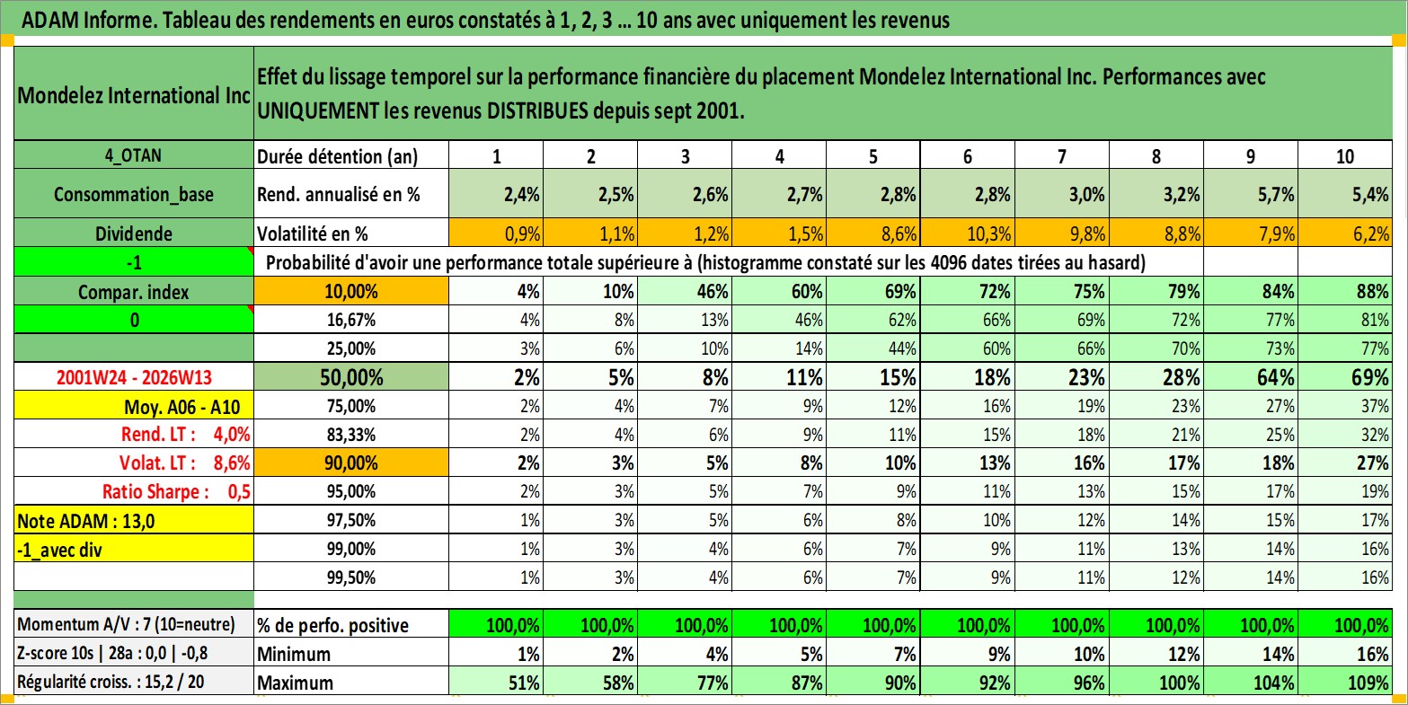 Site dédié aux investisseursPage dédiée sur site financeAnalyse des valorisations hebdomadaires de l'action Mondelez International Inc. Cet actif est cote en USD. Les valorisations sont en contrevaleur EURO et couvrent les semaines 2001W24 a 2026W13. Les revenus de cet actif financier sont pris en compte depuis la semaine 2001W37. La note globale ESG de cet actif est estimee a 8.0 (apres rebasage entre 0 et 20).