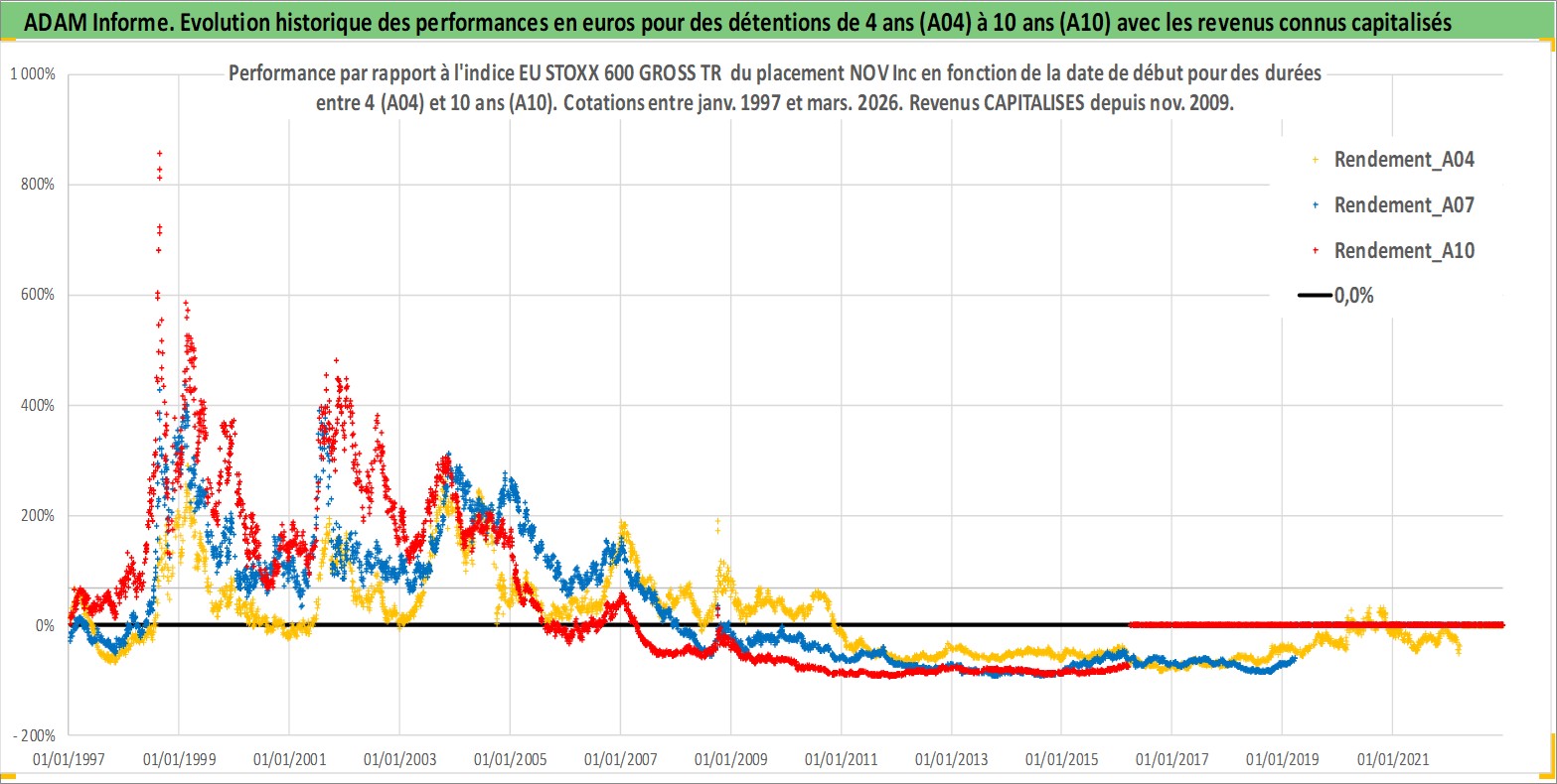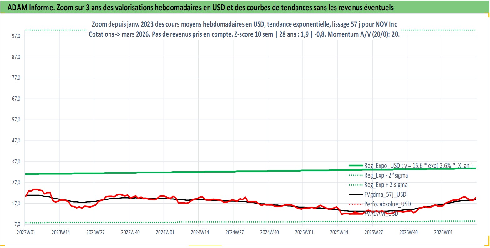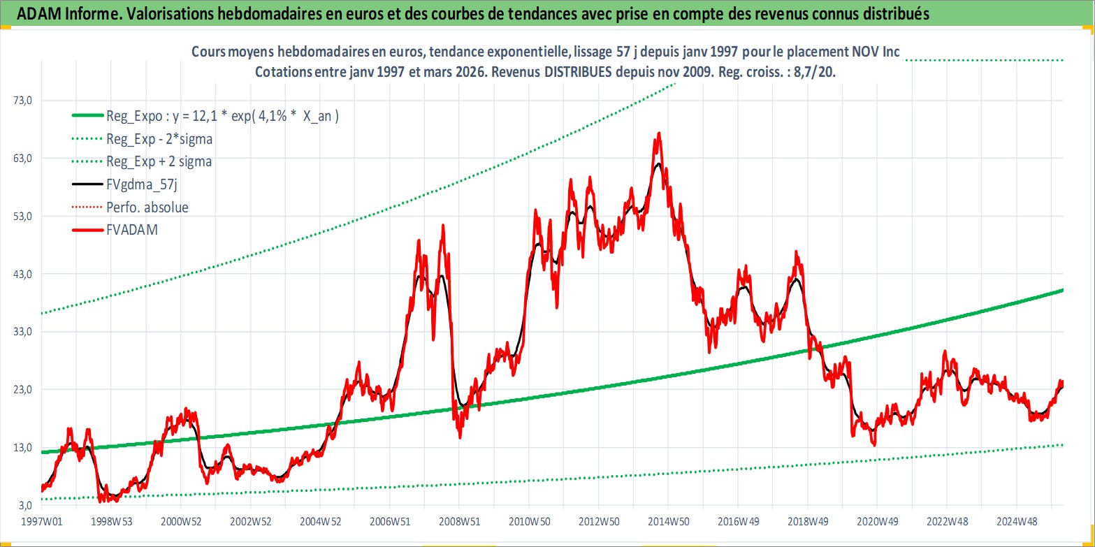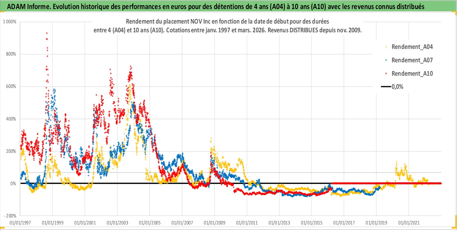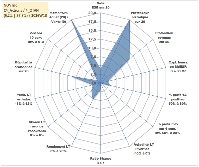 Site dédié aux investisseursPage dédiée sur site financeAnalyse des valorisations hebdomadaires de l'action NOV Inc. Cet actif est cote en USD. Les valorisations sont en contrevaleur EURO et couvrent les semaines 1997W01 a 2026W13. Les revenus de cet actif financier sont pris en compte depuis la semaine 2009W49. La note globale ESG de cet actif est estimee a 4.0 (apres rebasage entre 0 et 20).