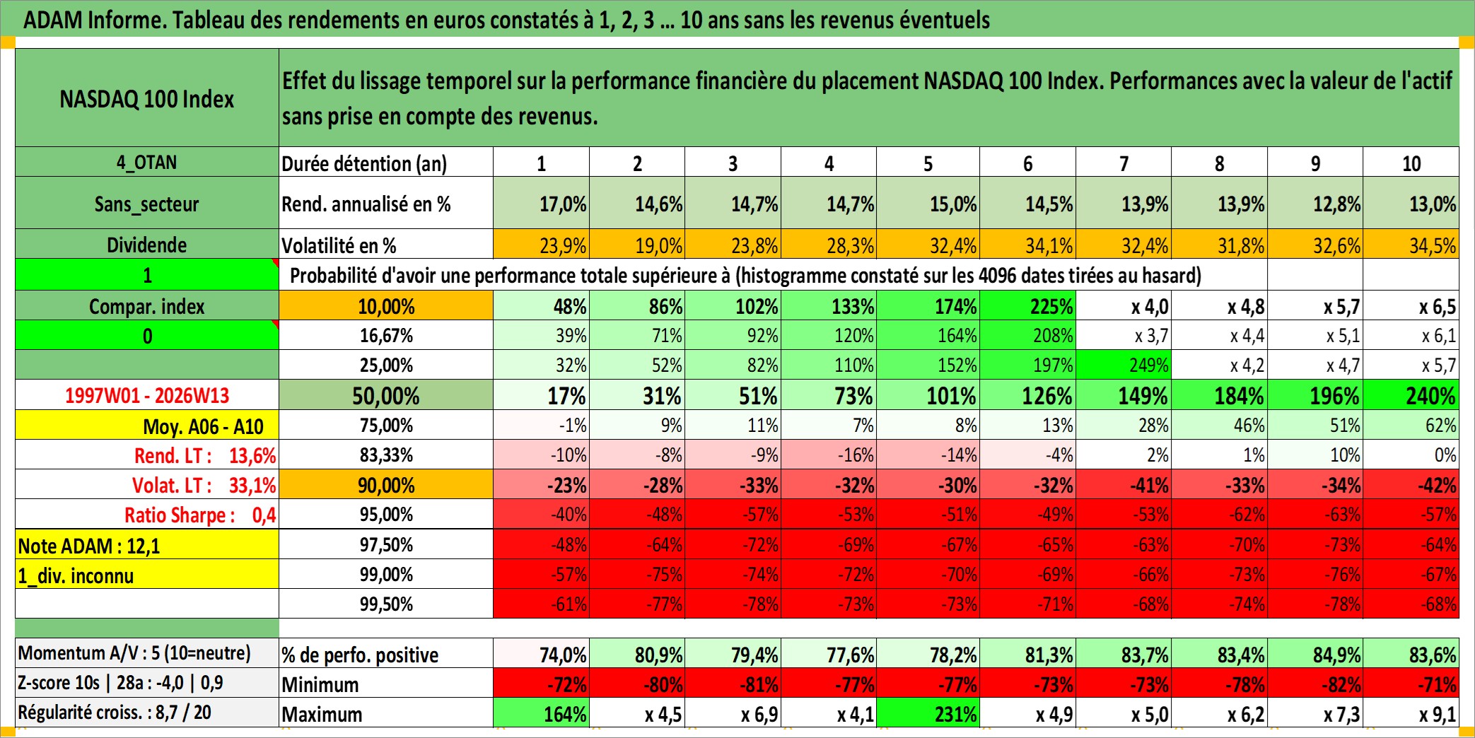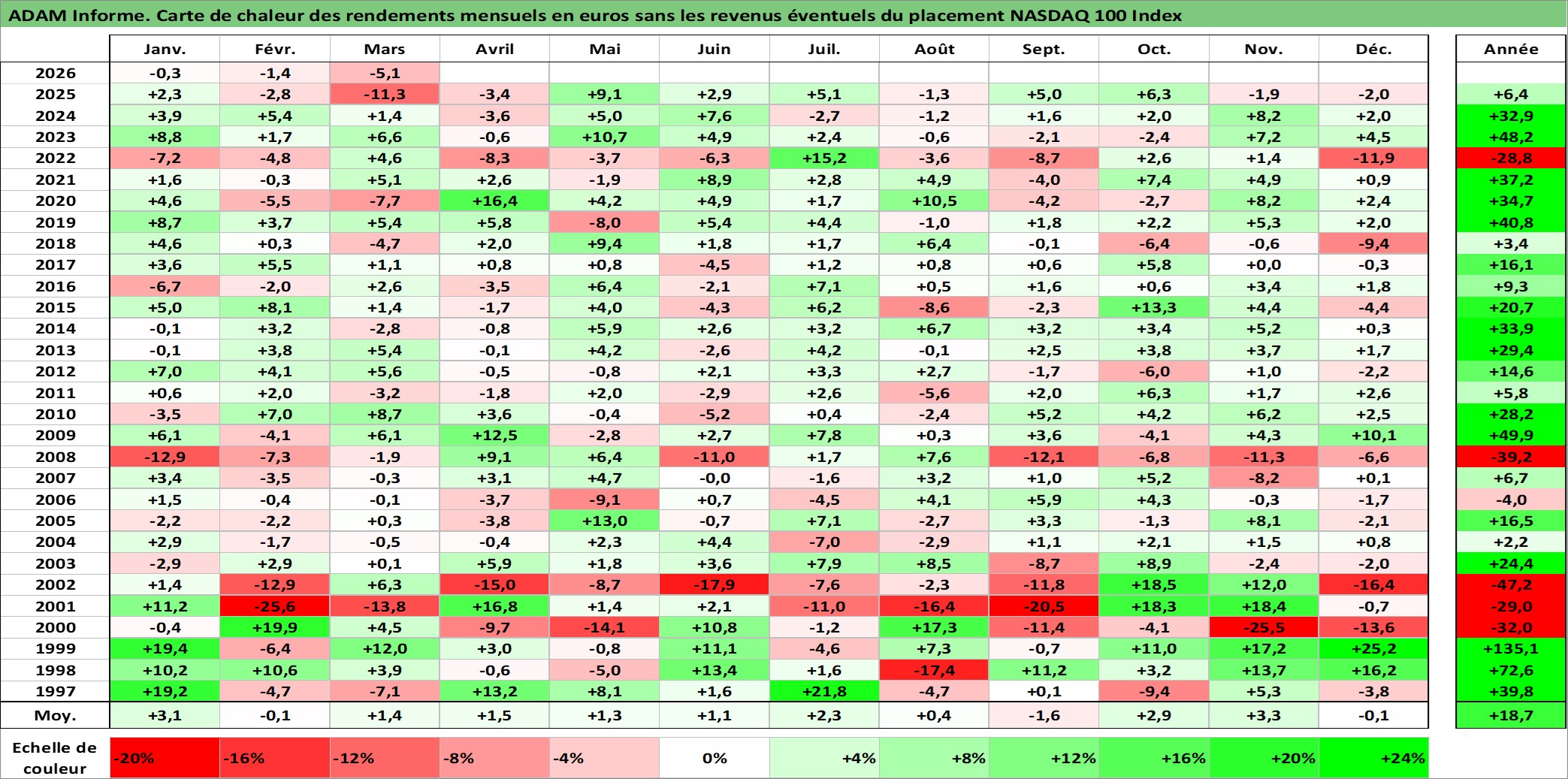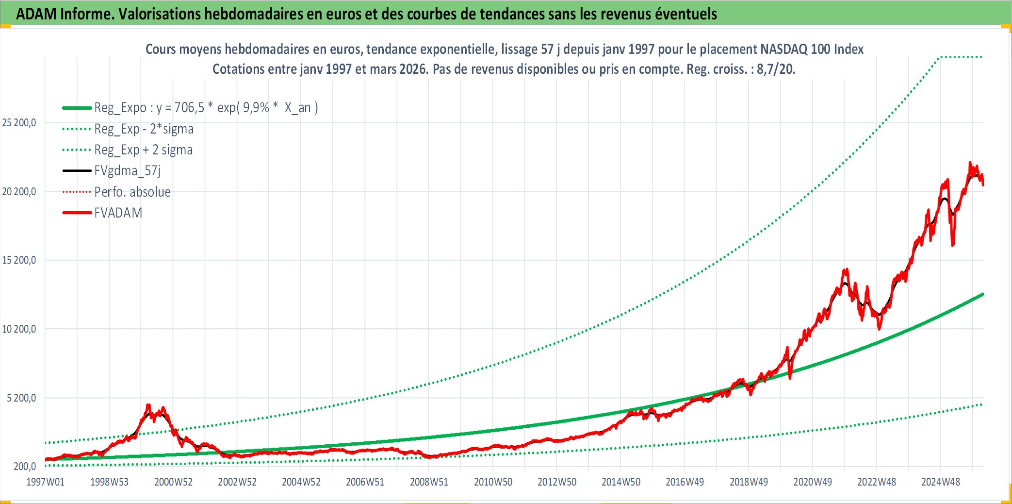 Site dédié aux investisseursPage dédiée sur site financeAnalyse des valorisations hebdomadaires de l'actif NASDAQ 100 Index. Cet actif est cote en USD. Les valorisations sont en contrevaleur EURO et couvrent les semaines 1997W01 a 2026W13. Les revenus de cet actif financier ne sont pas connus car non existants ou non disponibles sur le site Yahoo Finance. La note ESG de cet actif n'est pas connue.