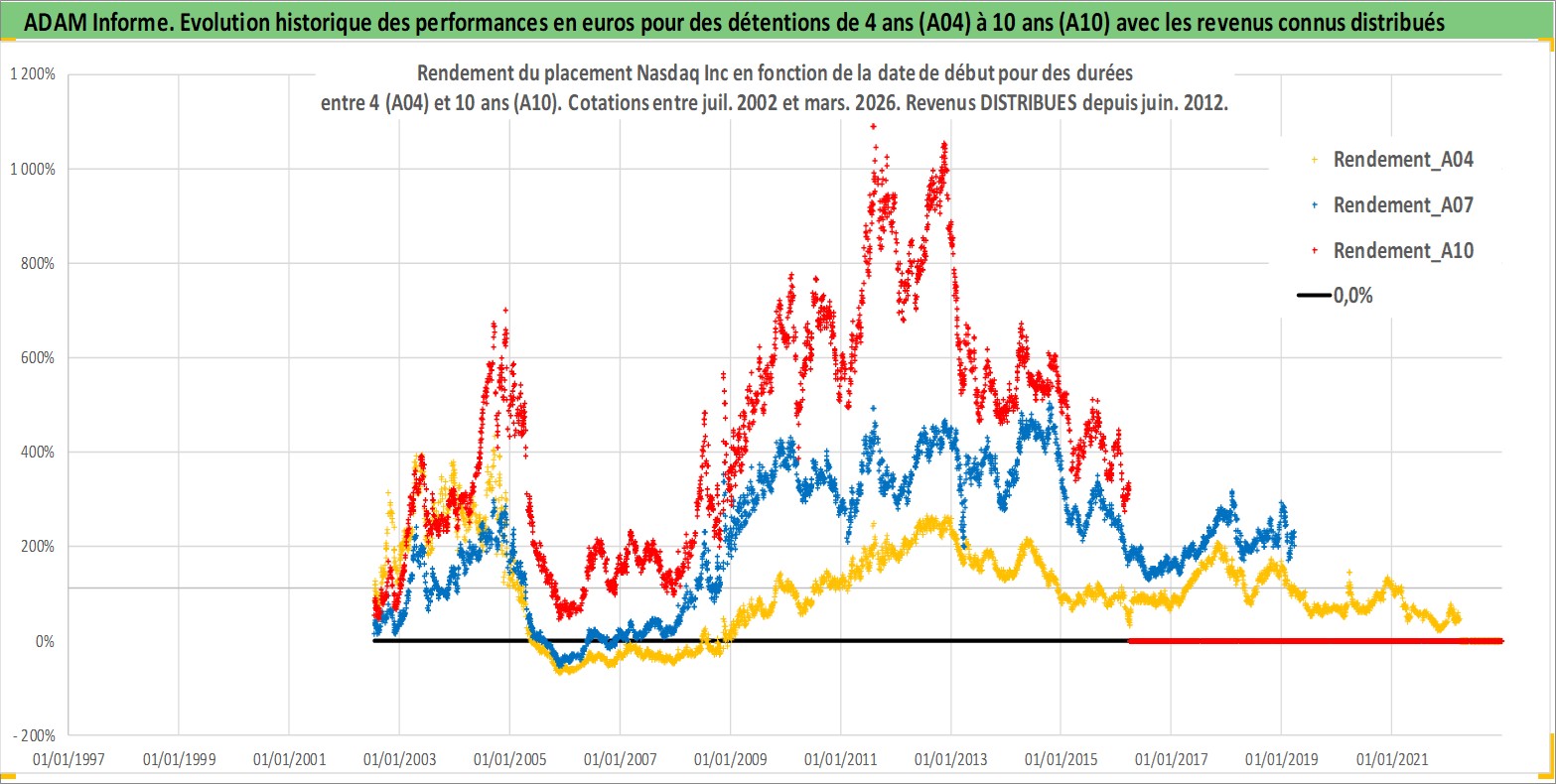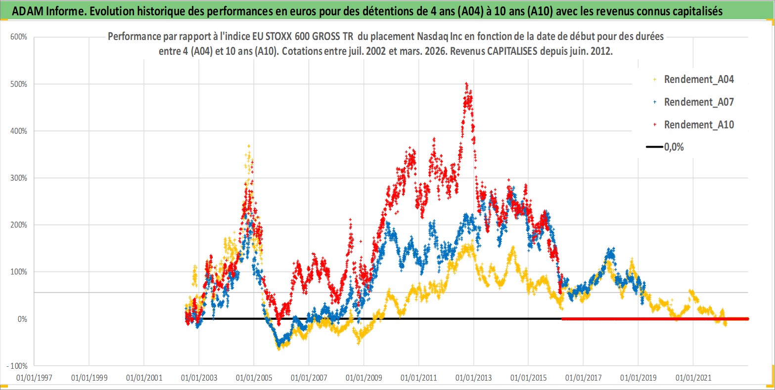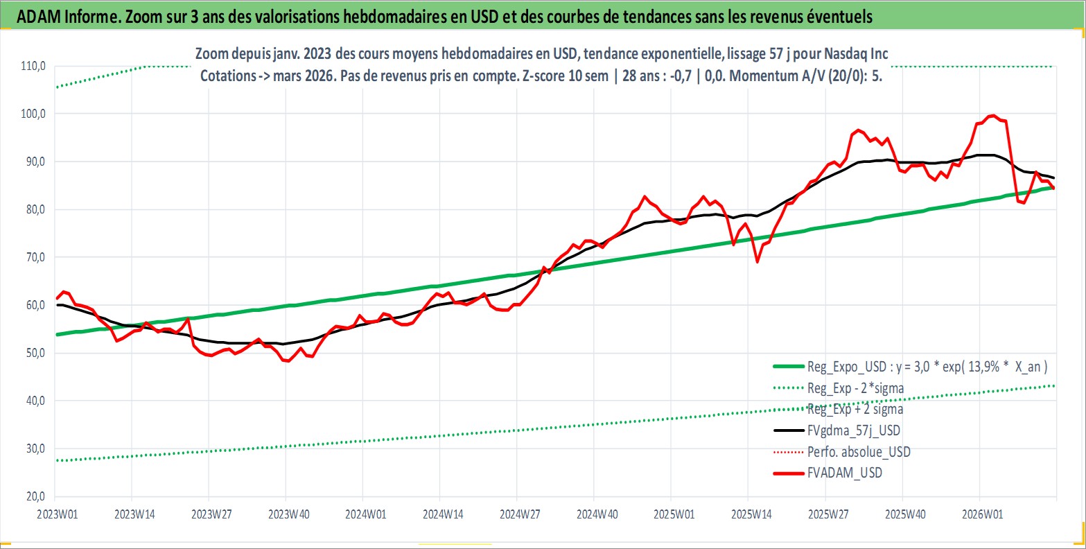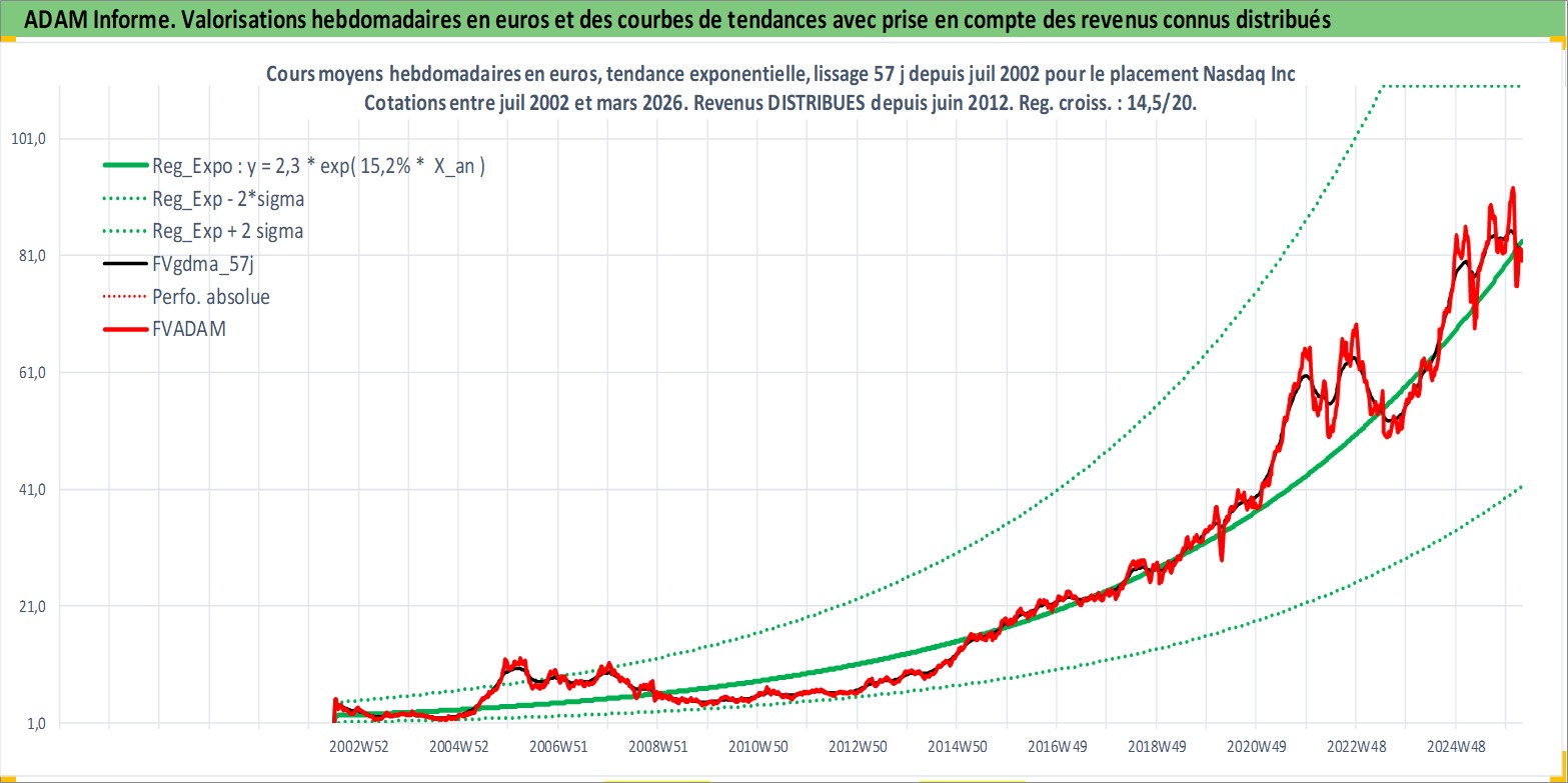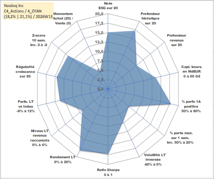 Site dédié aux investisseursPage dédiée sur site financeAnalyse des valorisations hebdomadaires de l'action Nasdaq Inc. Cet actif est cote en USD. Les valorisations sont en contrevaleur EURO et couvrent les semaines 2002W27 a 2026W13. Les revenus de cet actif financier sont pris en compte depuis la semaine 2012W24. La note globale ESG de cet actif est estimee a 15.0 (apres rebasage entre 0 et 20).