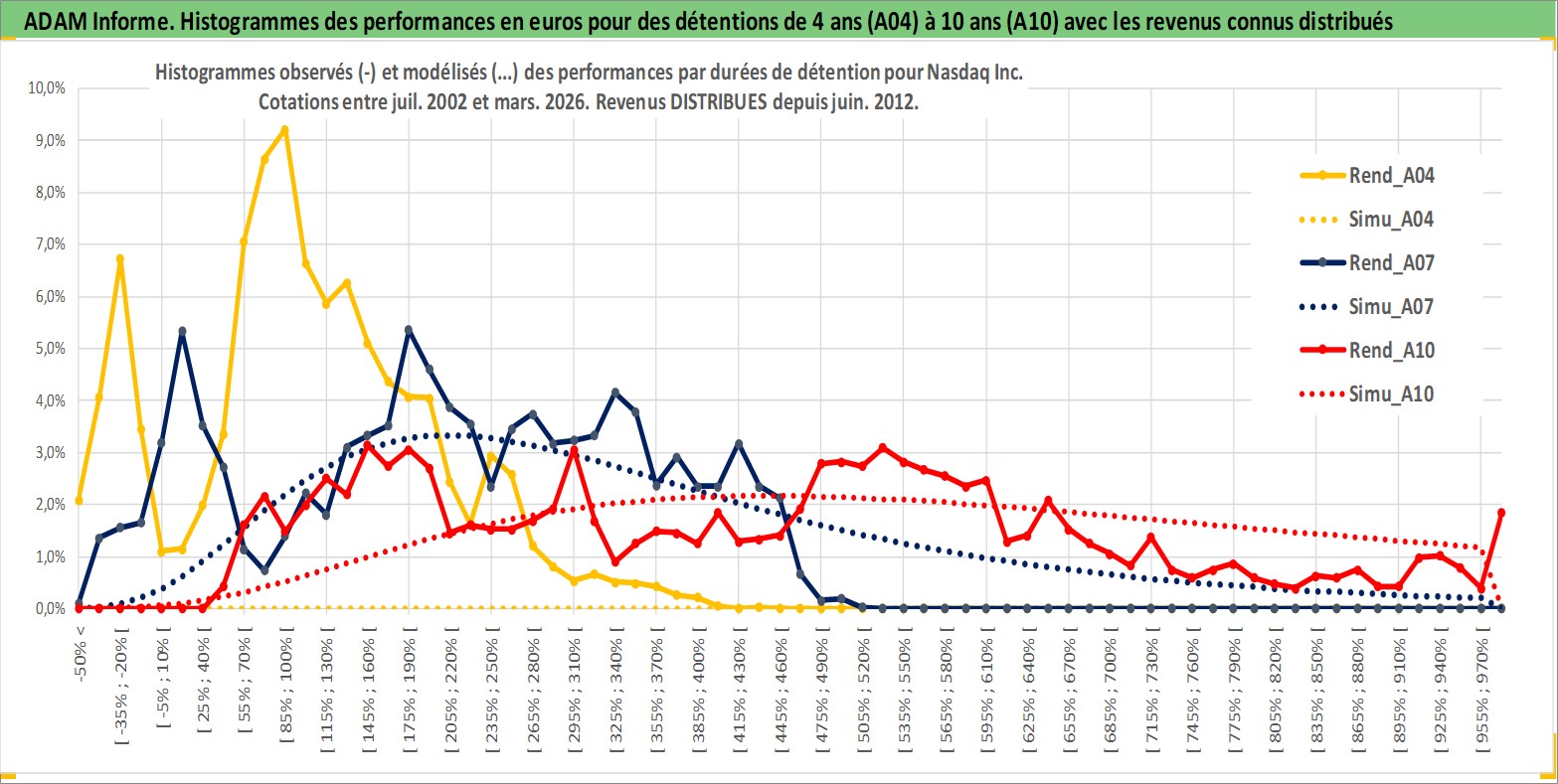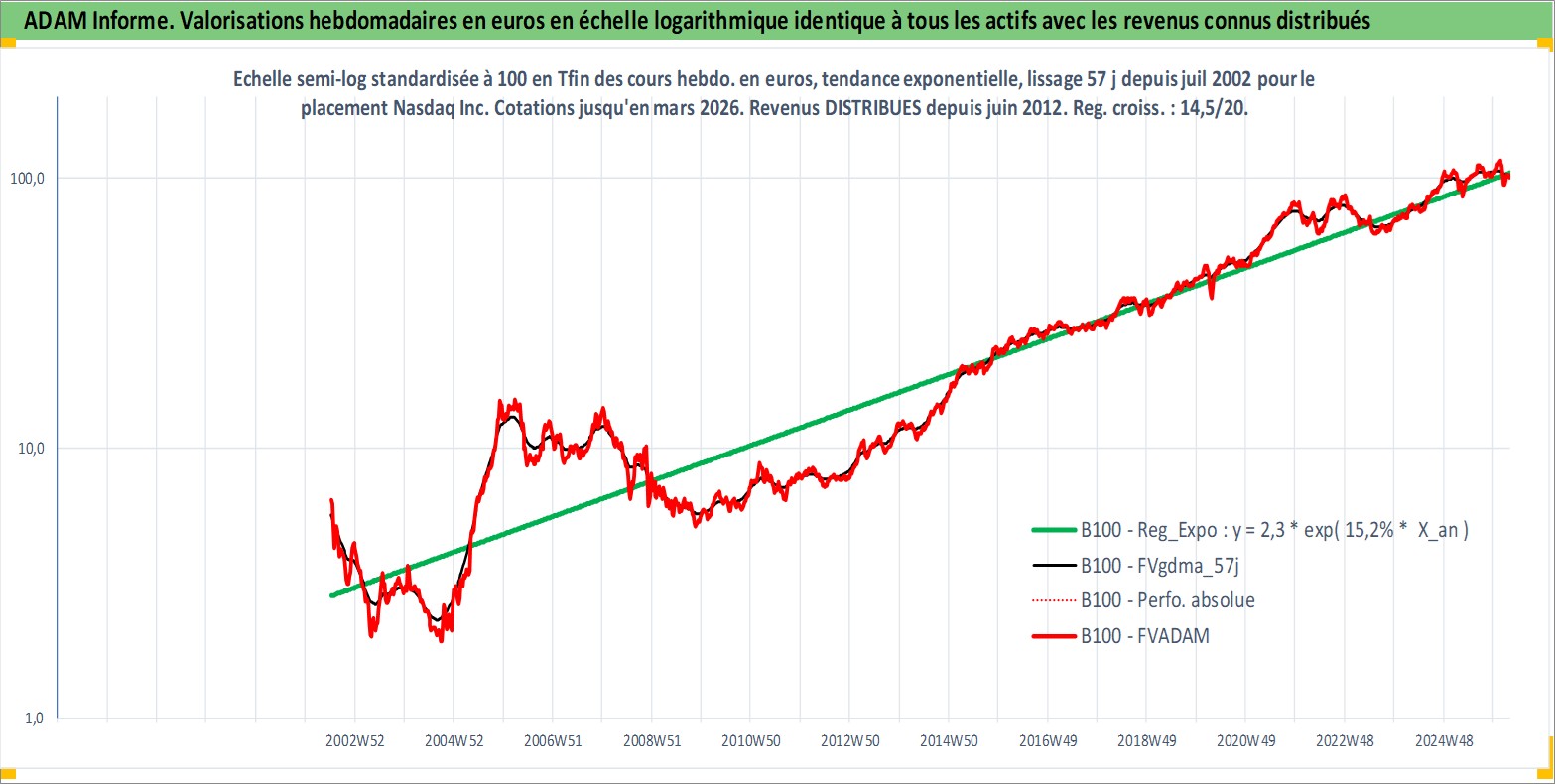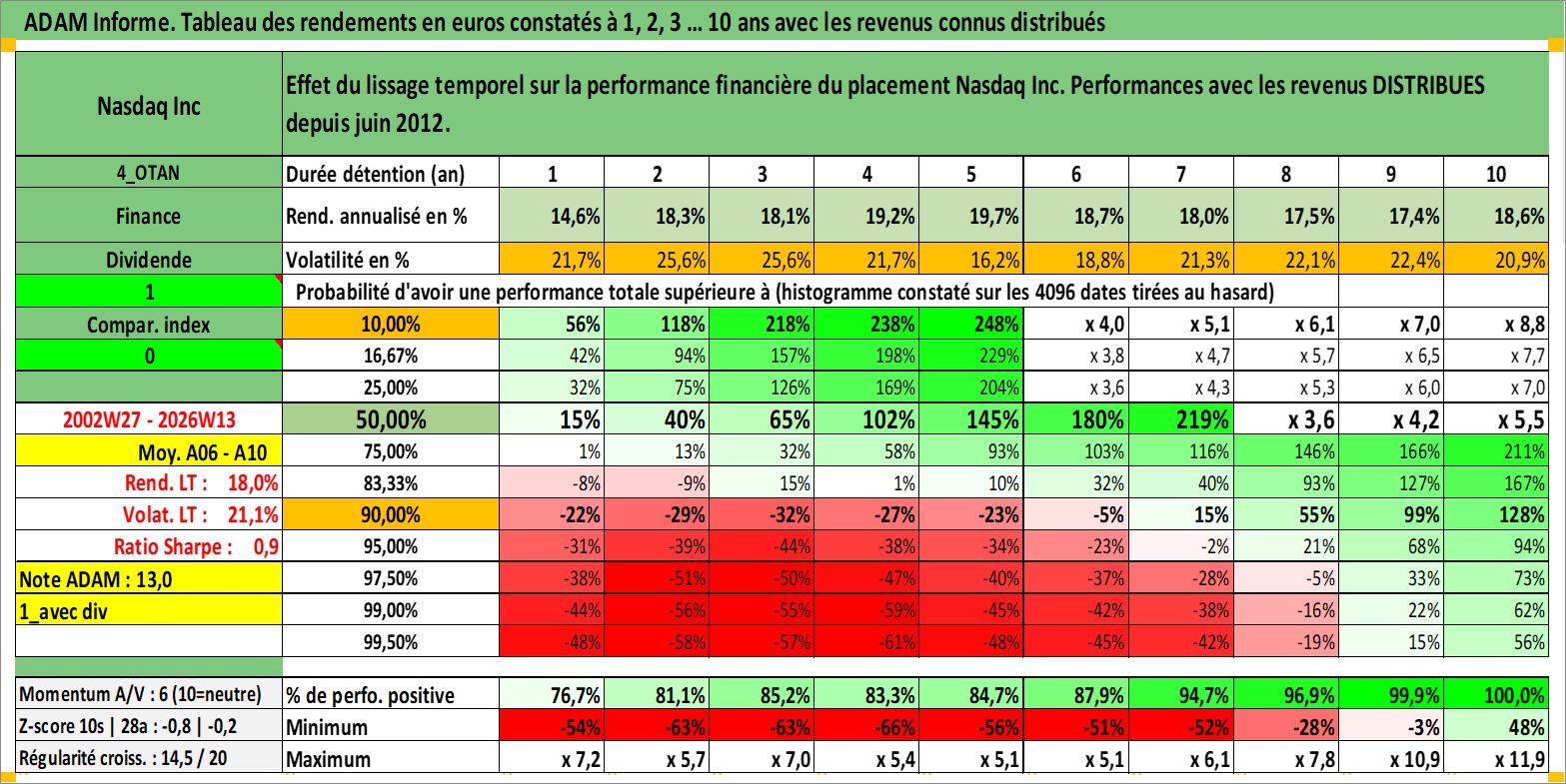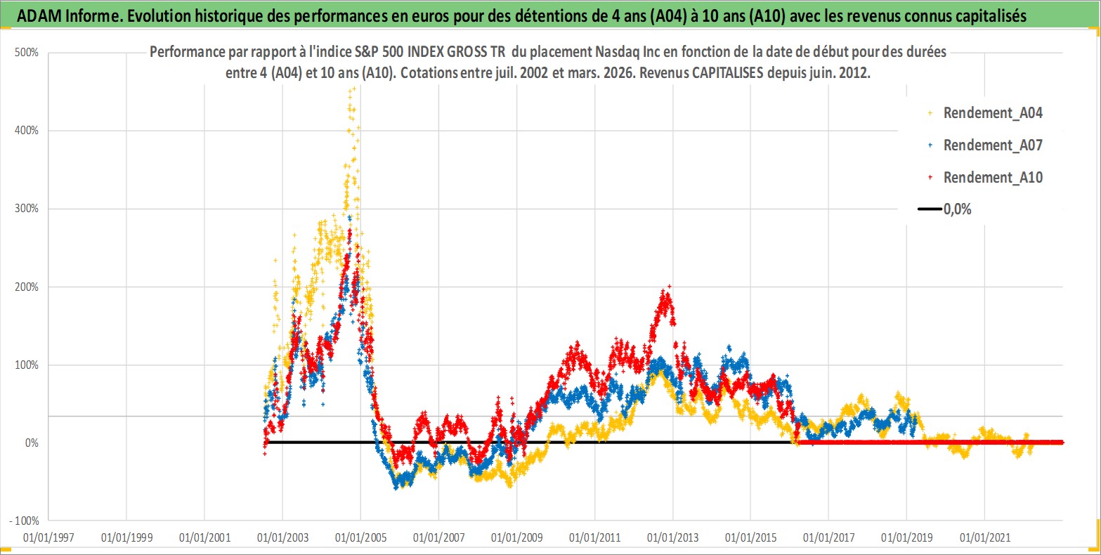 Site dédié aux investisseursPage dédiée sur site financeAnalyse des valorisations hebdomadaires de l'action Nasdaq Inc. Cet actif est cote en USD. Les valorisations sont en contrevaleur EURO et couvrent les semaines 2002W27 a 2026W13. Les revenus de cet actif financier sont pris en compte depuis la semaine 2012W24. La note globale ESG de cet actif est estimee a 15.0 (apres rebasage entre 0 et 20).