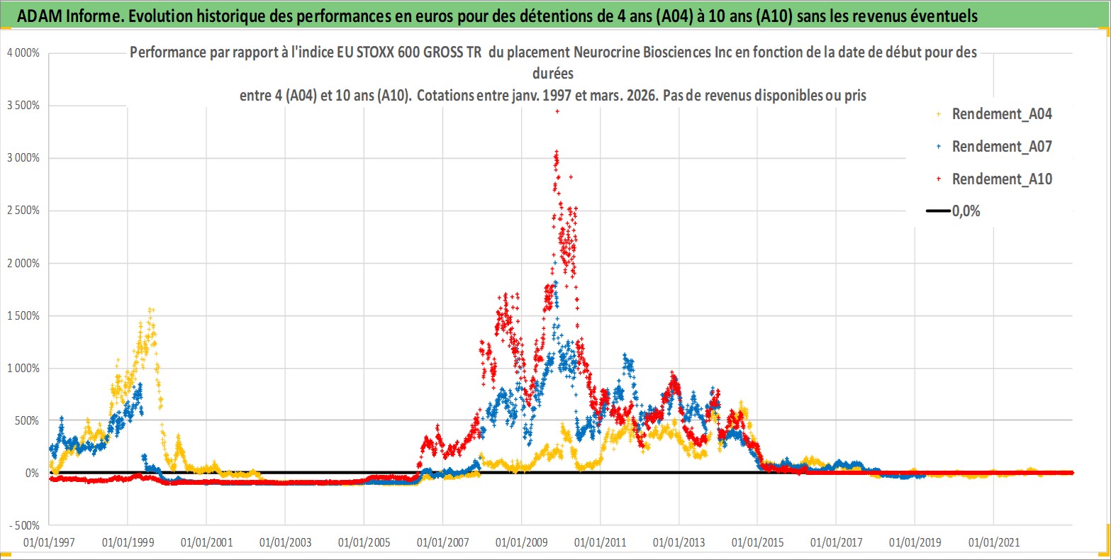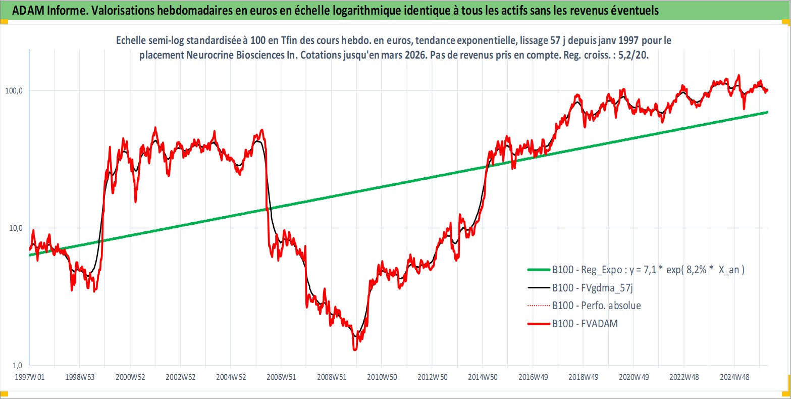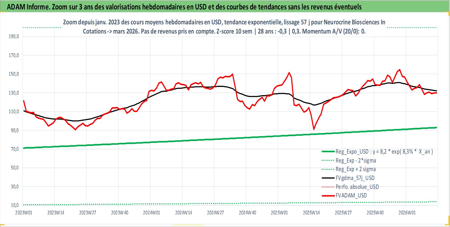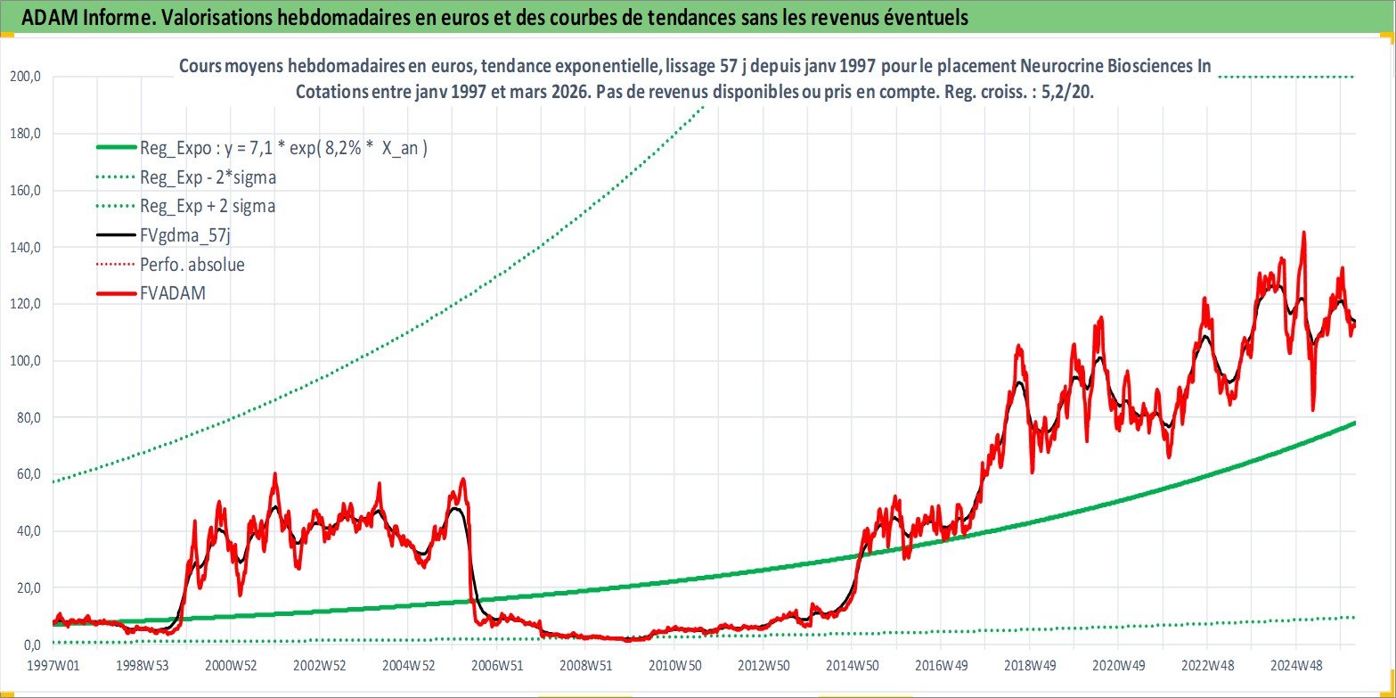 Site dédié aux investisseursPage dédiée sur site financeAnalyse des valorisations hebdomadaires de l'action Neurocrine Biosciences Inc. Cet actif est cote en USD. Les valorisations sont en contrevaleur EURO et couvrent les semaines 1997W01 a 2026W13. Les revenus de cet actif financier ne sont pas connus car non existants ou non disponibles sur le site Yahoo Finance. La note ESG de cet actif n'est pas connue.