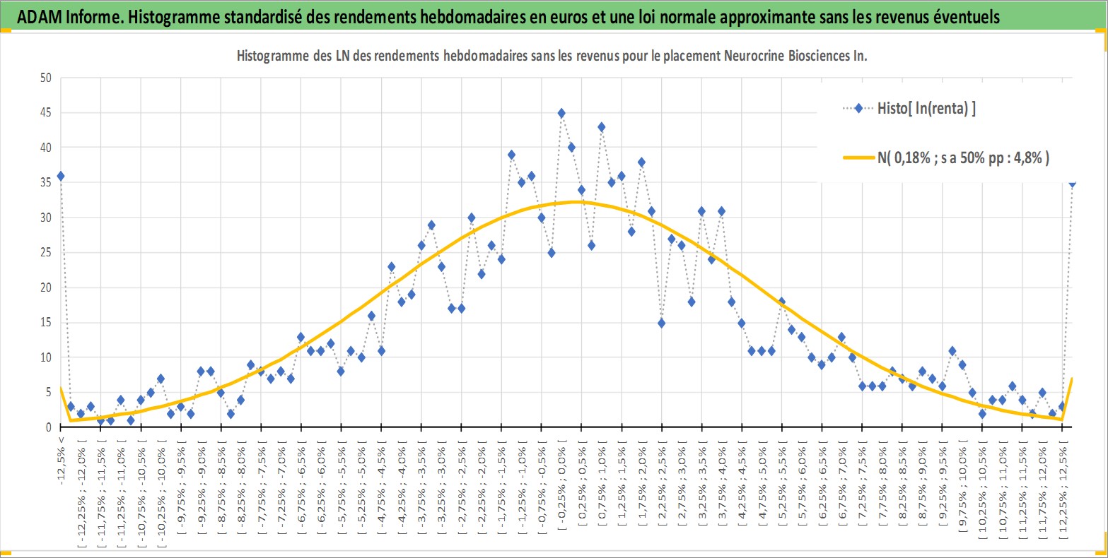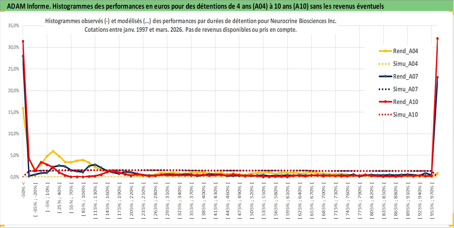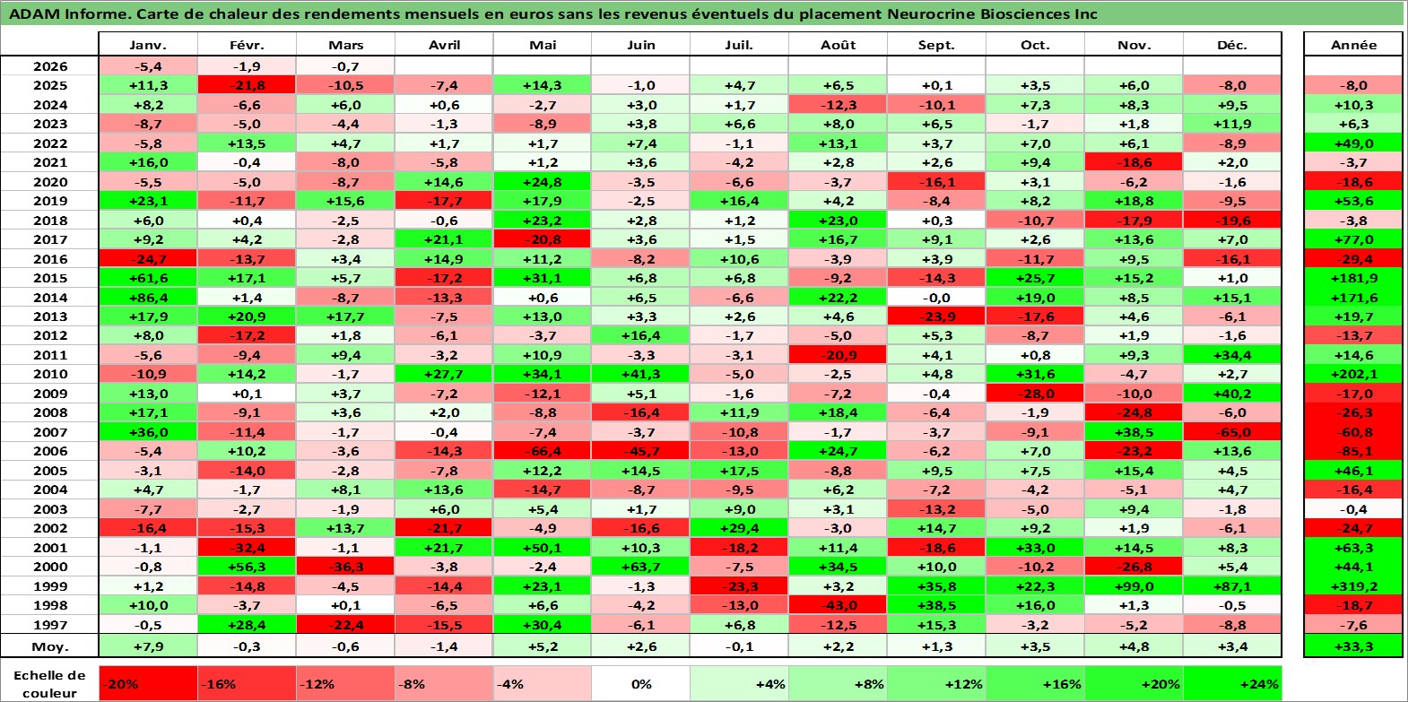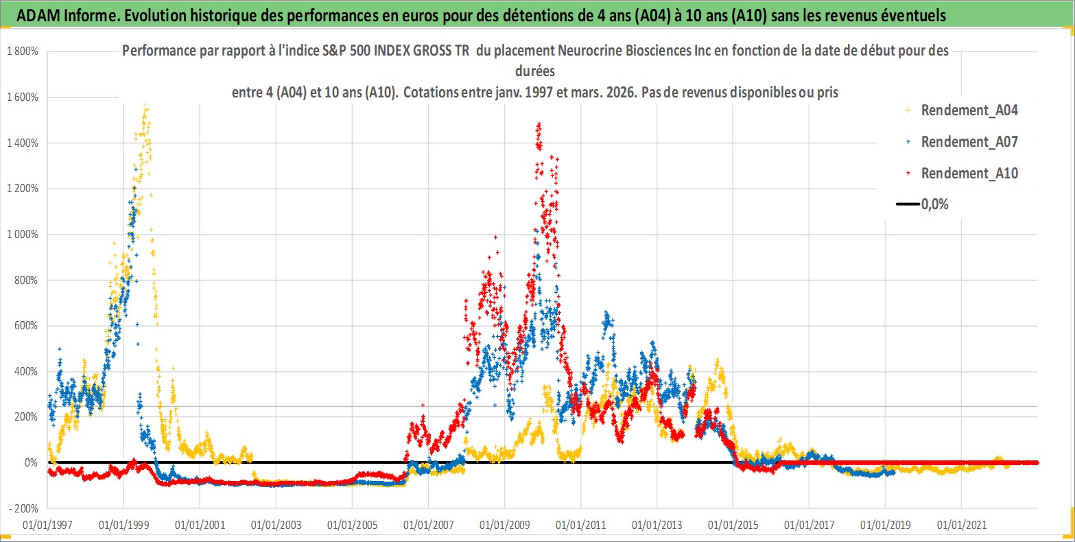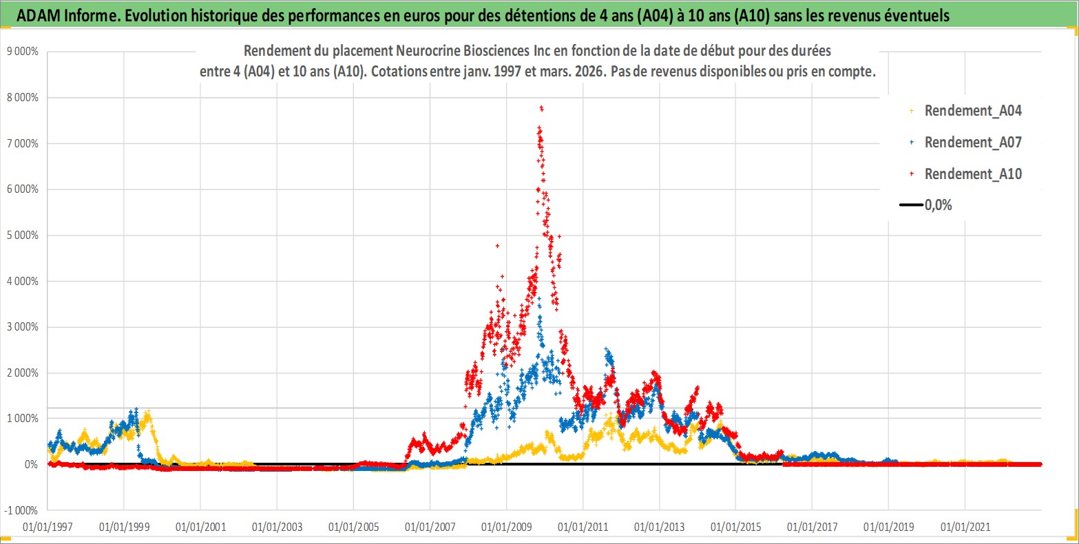 Site dédié aux investisseursPage dédiée sur site financeAnalyse des valorisations hebdomadaires de l'action Neurocrine Biosciences Inc. Cet actif est cote en USD. Les valorisations sont en contrevaleur EURO et couvrent les semaines 1997W01 a 2026W13. Les revenus de cet actif financier ne sont pas connus car non existants ou non disponibles sur le site Yahoo Finance. La note ESG de cet actif n'est pas connue.