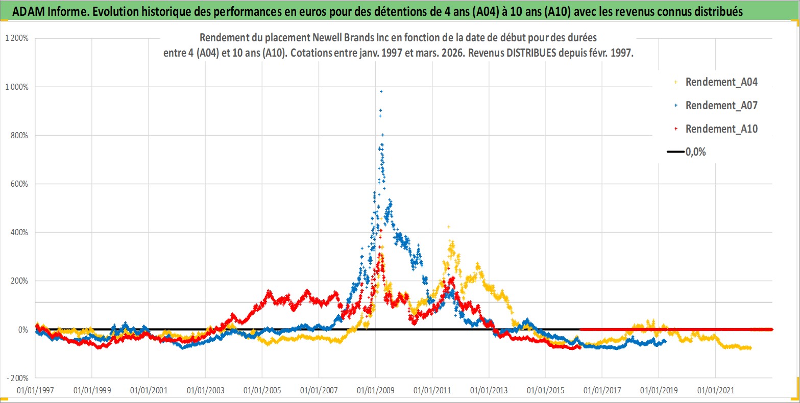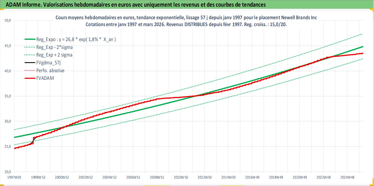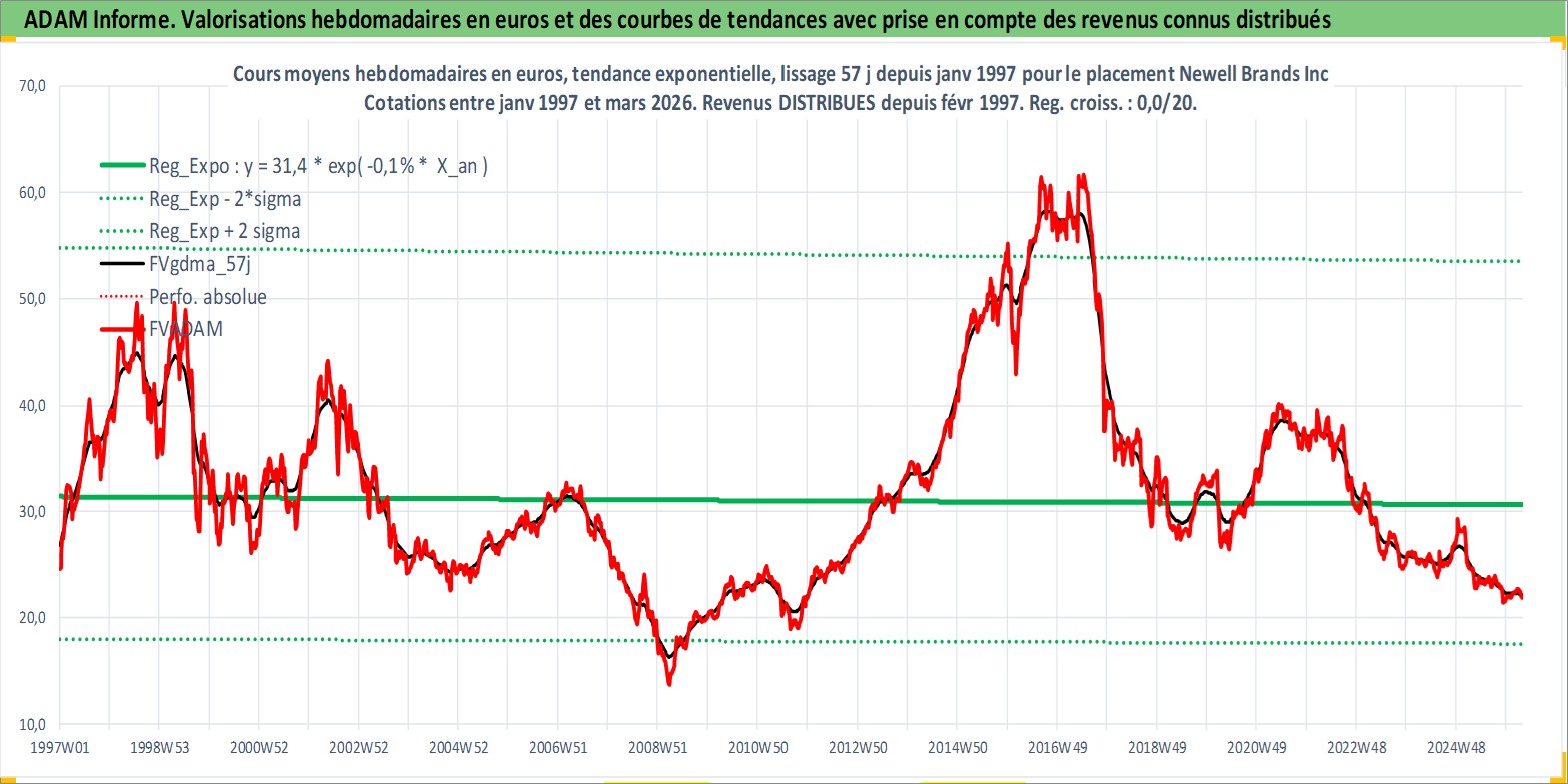 Site dédié aux investisseursPage dédiée sur site financeAnalyse des valorisations hebdomadaires de l'action Newell Brands Inc. Cet actif est cote en USD. Les valorisations sont en contrevaleur EURO et couvrent les semaines 1997W01 a 2026W13. Les revenus de cet actif financier sont pris en compte depuis la semaine 1997W08. La note globale ESG de cet actif est estimee a 14.0 (apres rebasage entre 0 et 20).