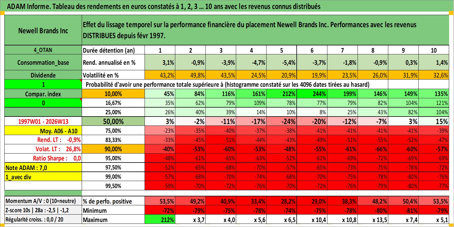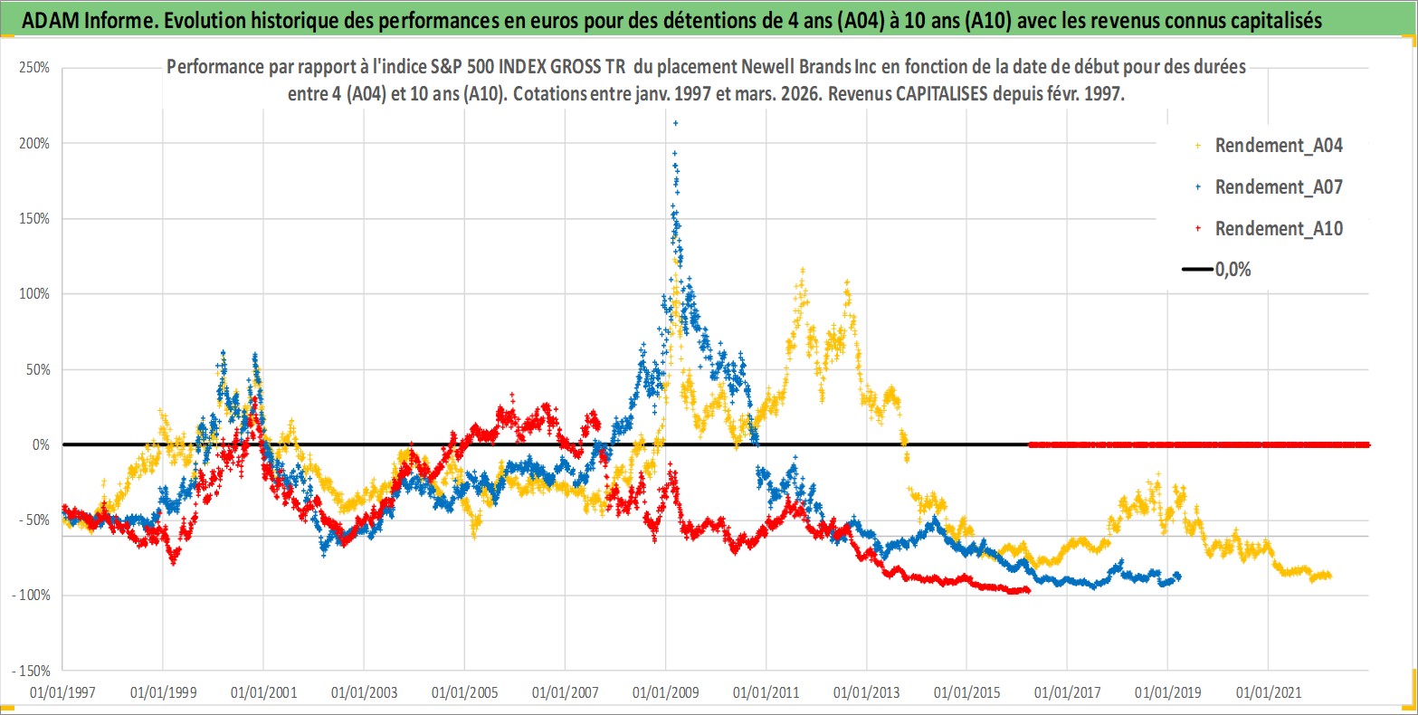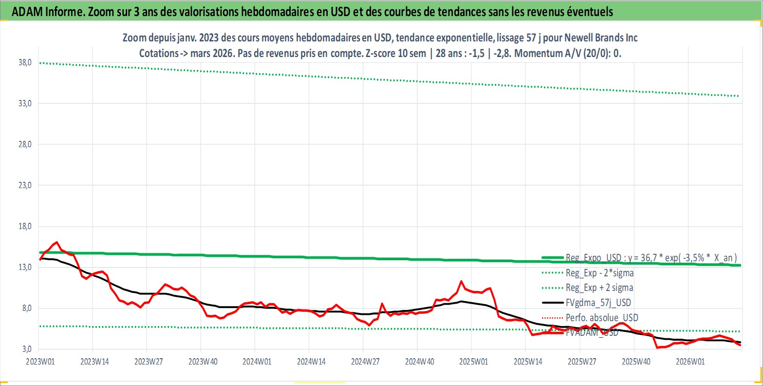Site dédié aux investisseursPage dédiée sur site financeAnalyse des valorisations hebdomadaires de l'action Newell Brands Inc. Cet actif est cote en USD. Les valorisations sont en contrevaleur EURO et couvrent les semaines 1997W01 a 2026W13. Les revenus de cet actif financier sont pris en compte depuis la semaine 1997W08. La note globale ESG de cet actif est estimee a 14.0 (apres rebasage entre 0 et 20).