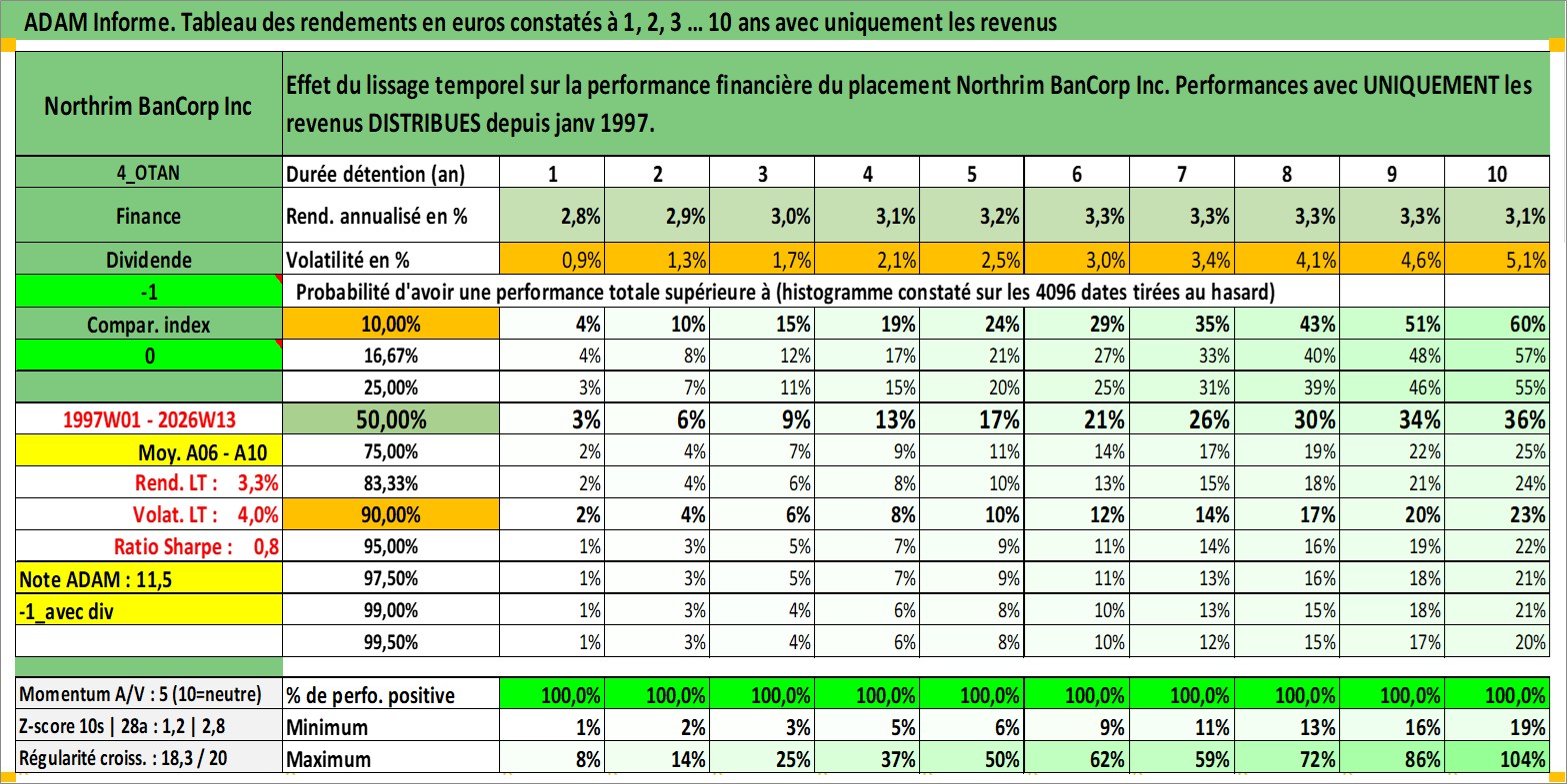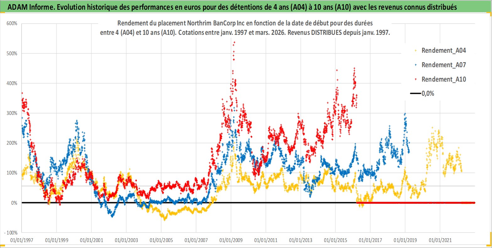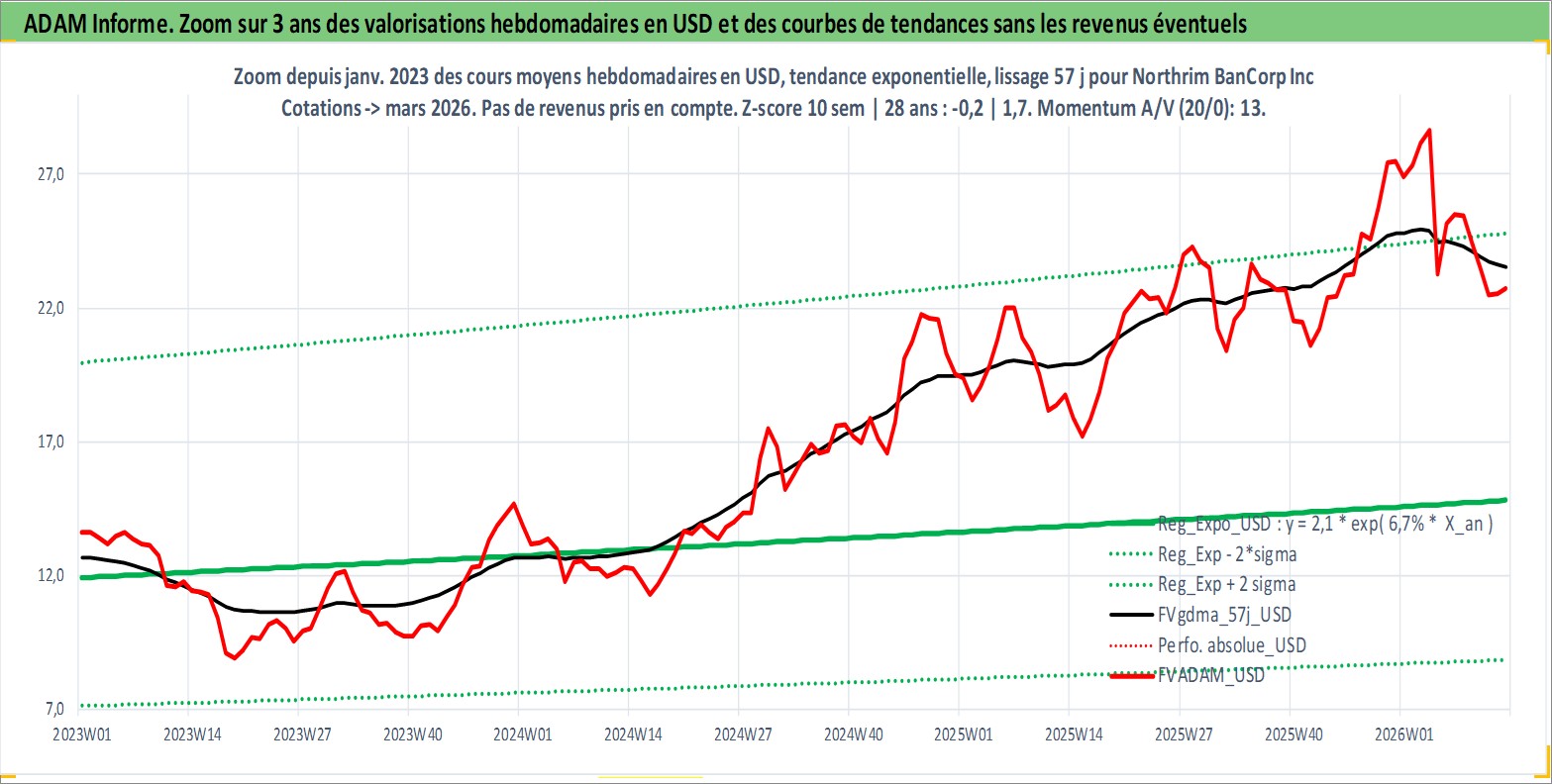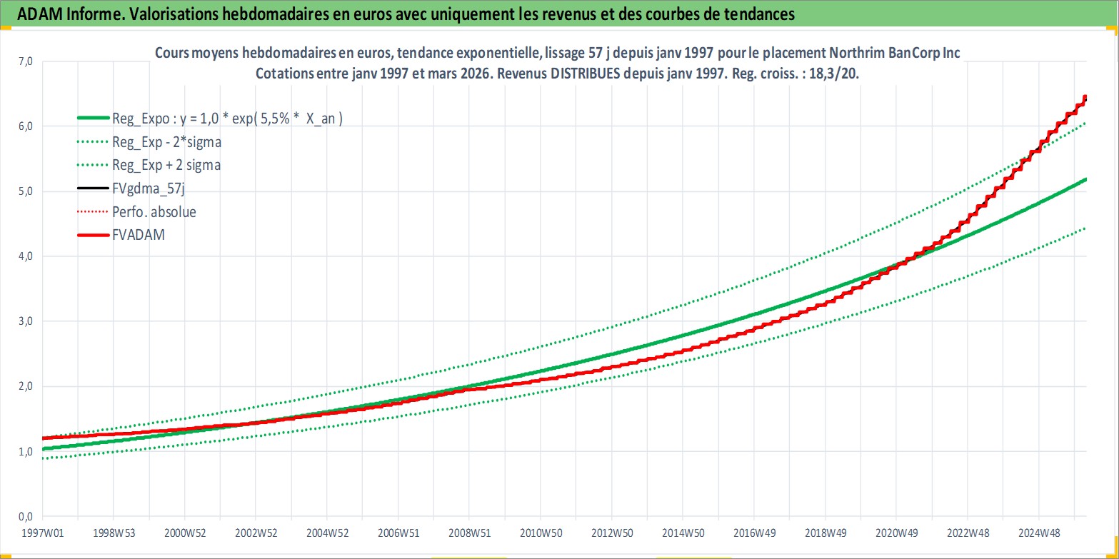Site dédié aux investisseursPage dédiée sur site financeAnalyse des valorisations hebdomadaires de l'action Northrim BanCorp Inc. Cet actif est cote en USD. Les valorisations sont en contrevaleur EURO et couvrent les semaines 1997W01 a 2026W13. Les revenus de cet actif financier sont pris en compte depuis la semaine 1997W03. La note ESG de cet actif n'est pas connue.