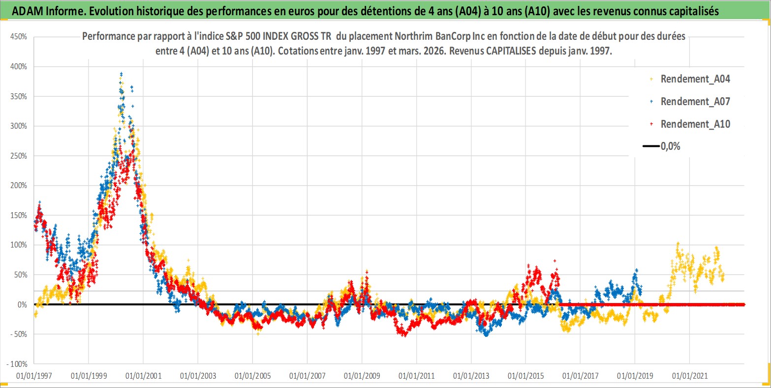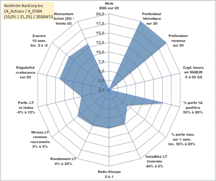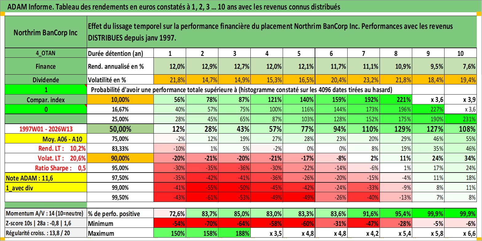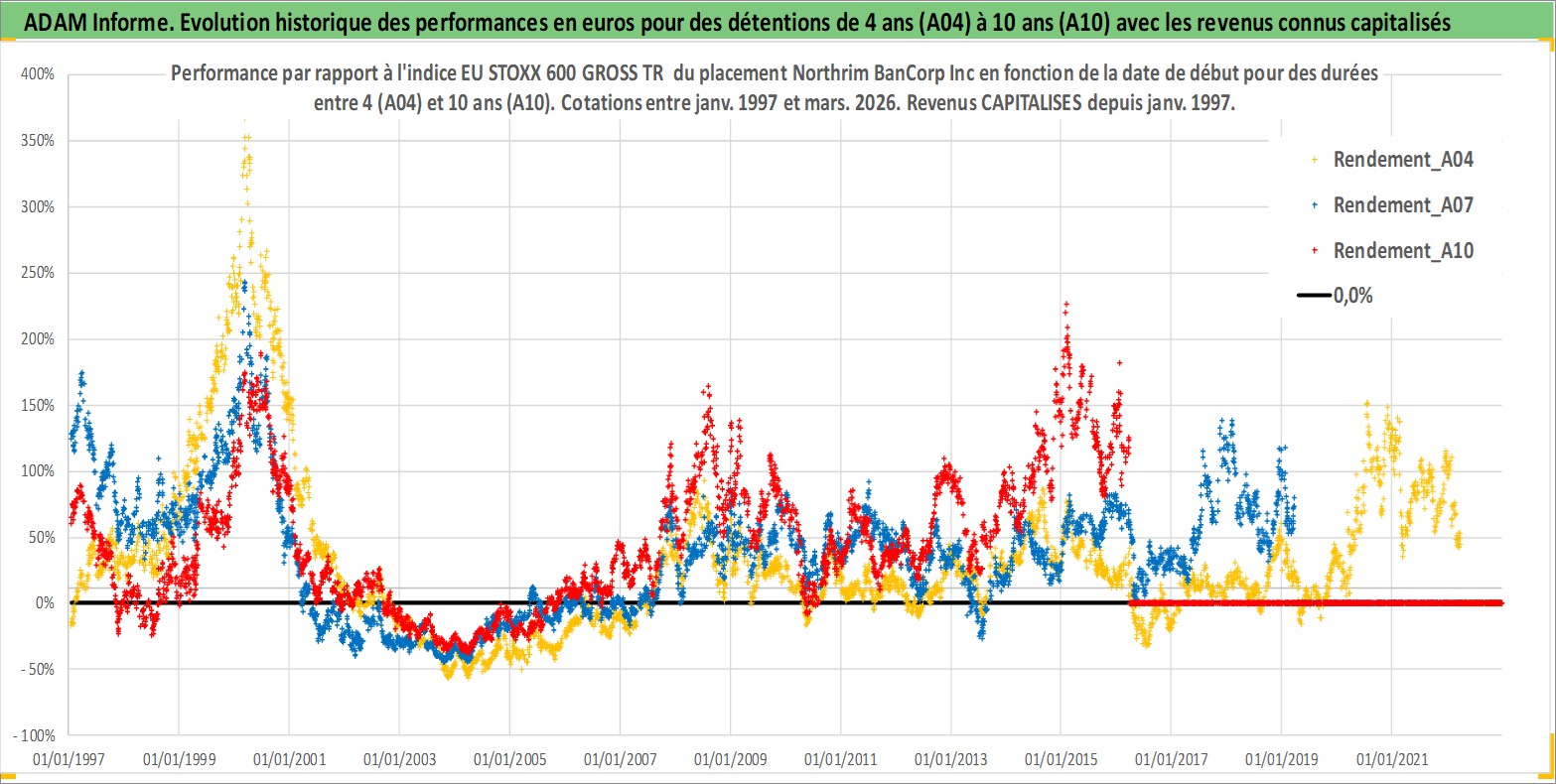 Site dédié aux investisseursPage dédiée sur site financeAnalyse des valorisations hebdomadaires de l'action Northrim BanCorp Inc. Cet actif est cote en USD. Les valorisations sont en contrevaleur EURO et couvrent les semaines 1997W01 a 2026W13. Les revenus de cet actif financier sont pris en compte depuis la semaine 1997W03. La note ESG de cet actif n'est pas connue.