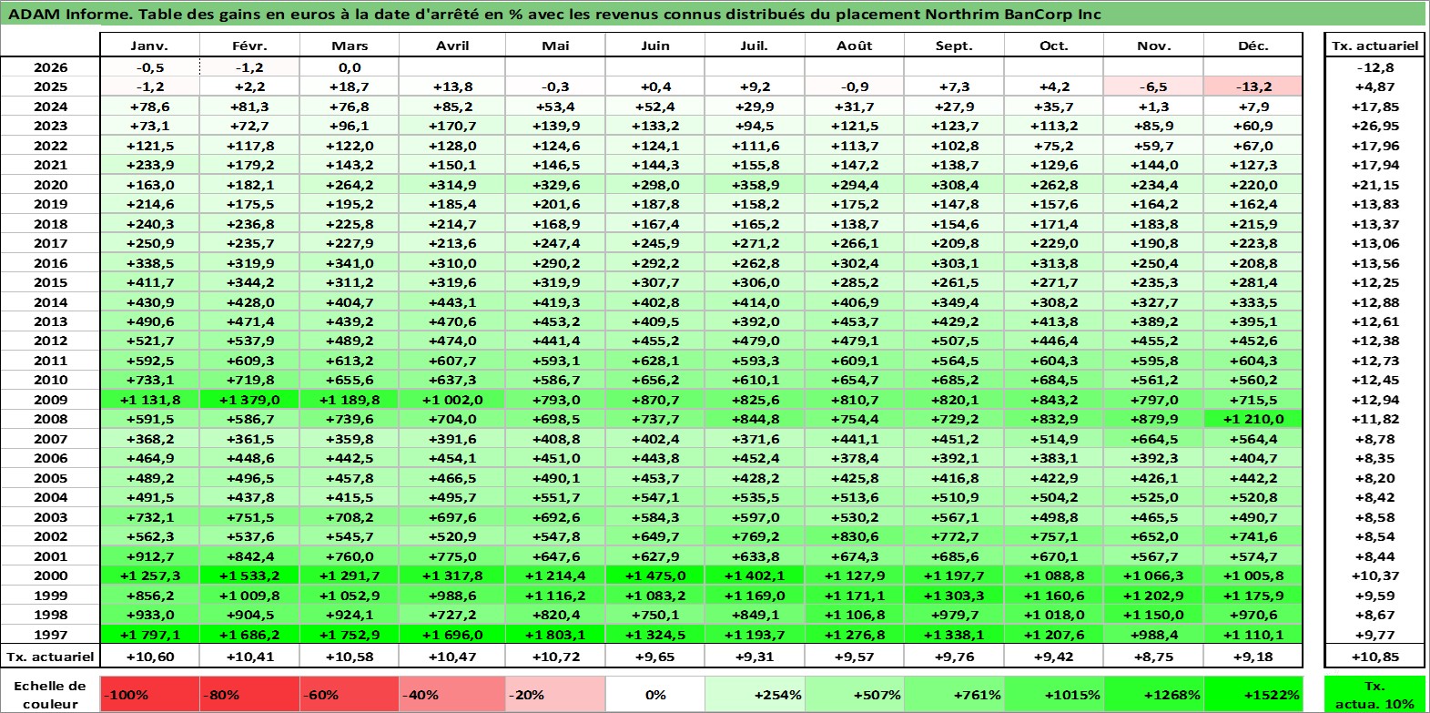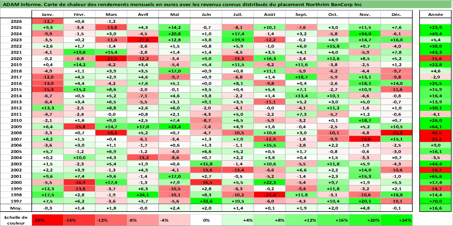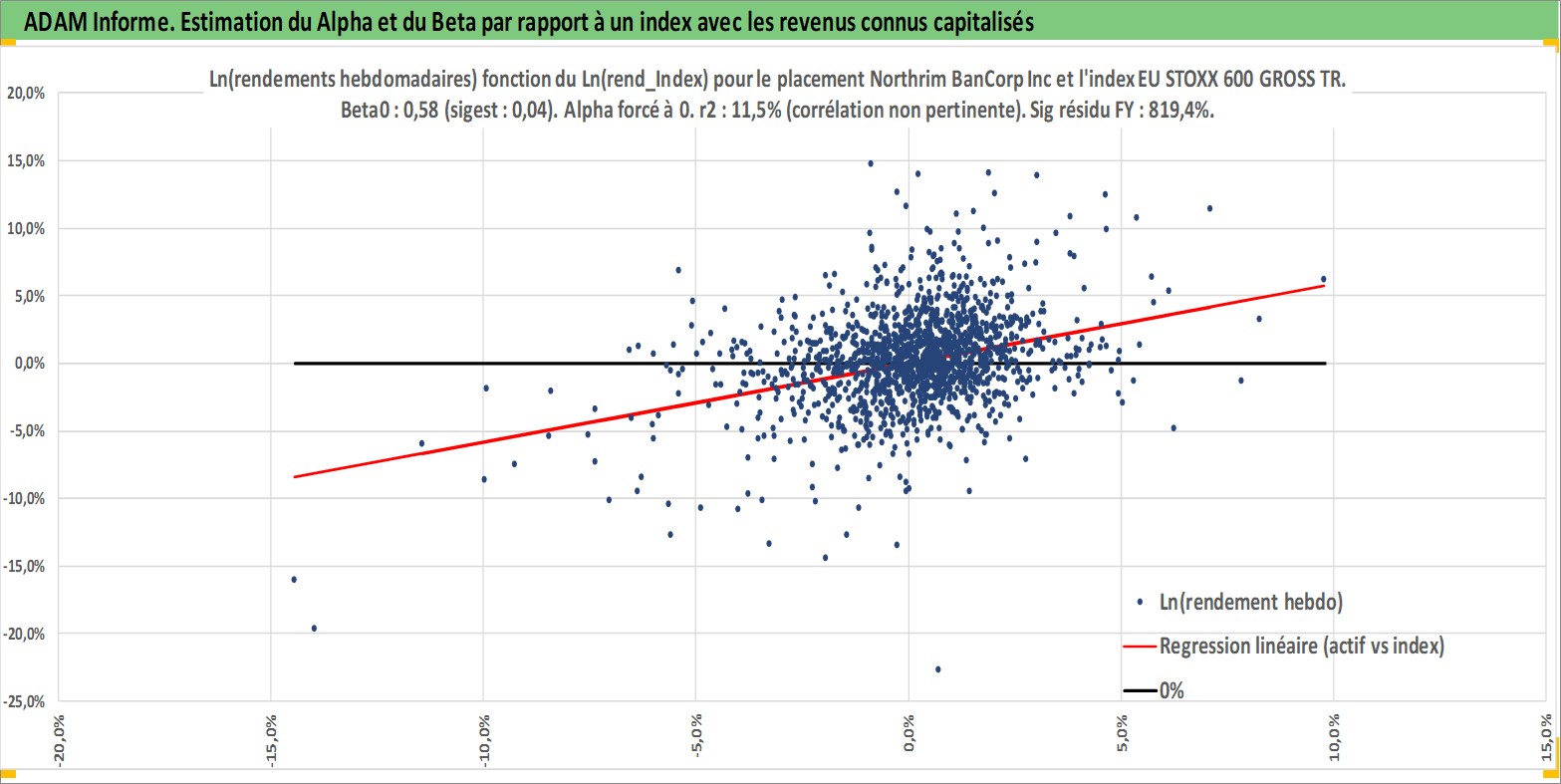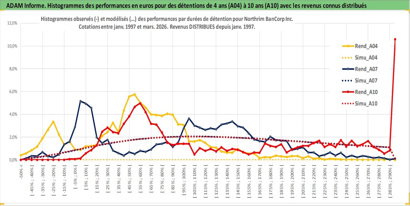 Site dédié aux investisseursPage dédiée sur site financeAnalyse des valorisations hebdomadaires de l'action Northrim BanCorp Inc. Cet actif est cote en USD. Les valorisations sont en contrevaleur EURO et couvrent les semaines 1997W01 a 2026W13. Les revenus de cet actif financier sont pris en compte depuis la semaine 1997W03. La note ESG de cet actif n'est pas connue.