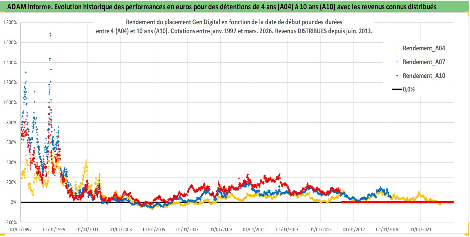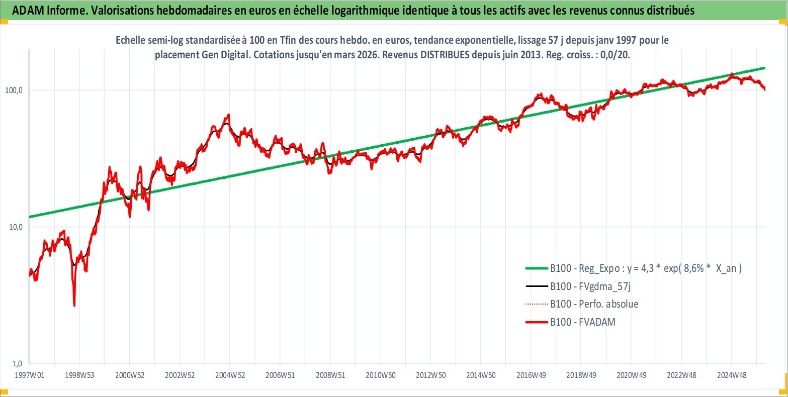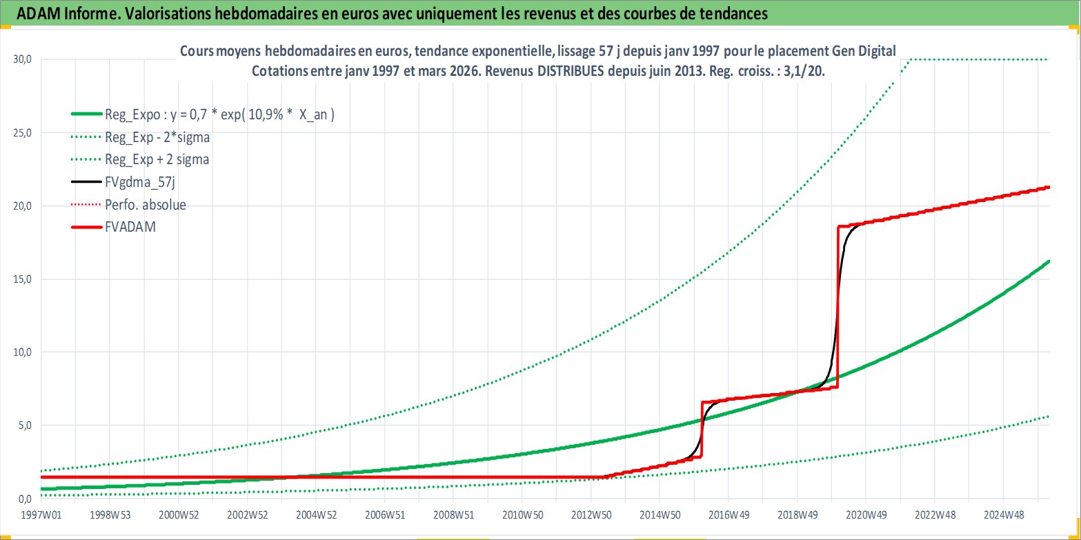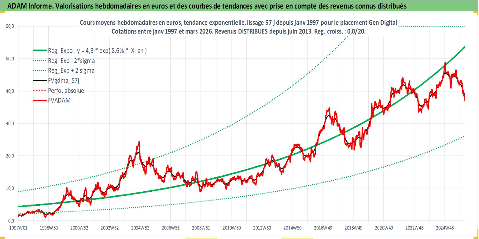 Site dédié aux investisseursPage dédiée sur site financeAnalyse des valorisations hebdomadaires de l'action Gen Digital. Cet actif est cote en USD. Les valorisations sont en contrevaleur EURO et couvrent les semaines 1997W01 a 2026W13. Les revenus de cet actif financier sont pris en compte depuis la semaine 2013W25. La note globale ESG de cet actif est estimee a 13.0 (apres rebasage entre 0 et 20).