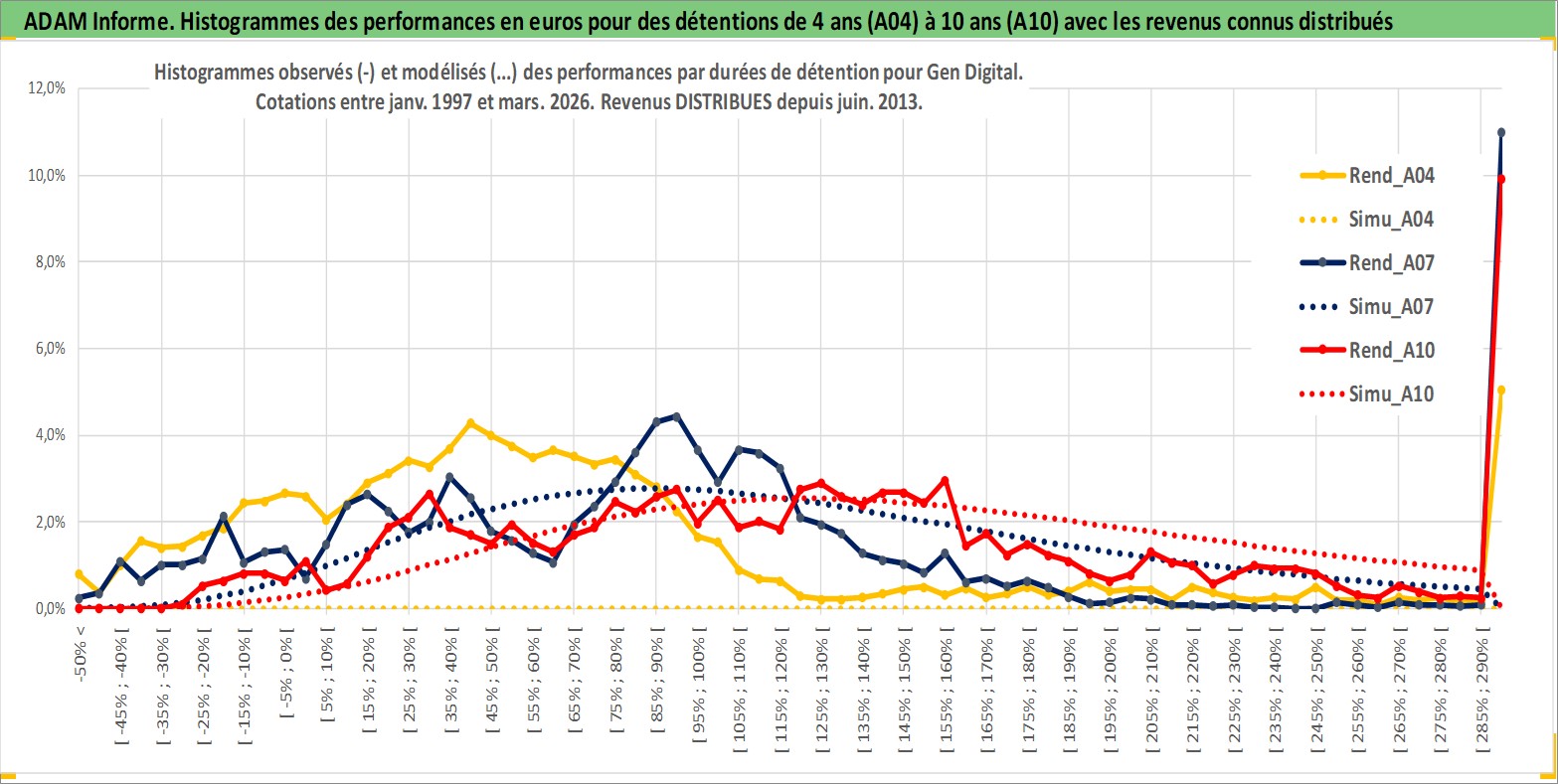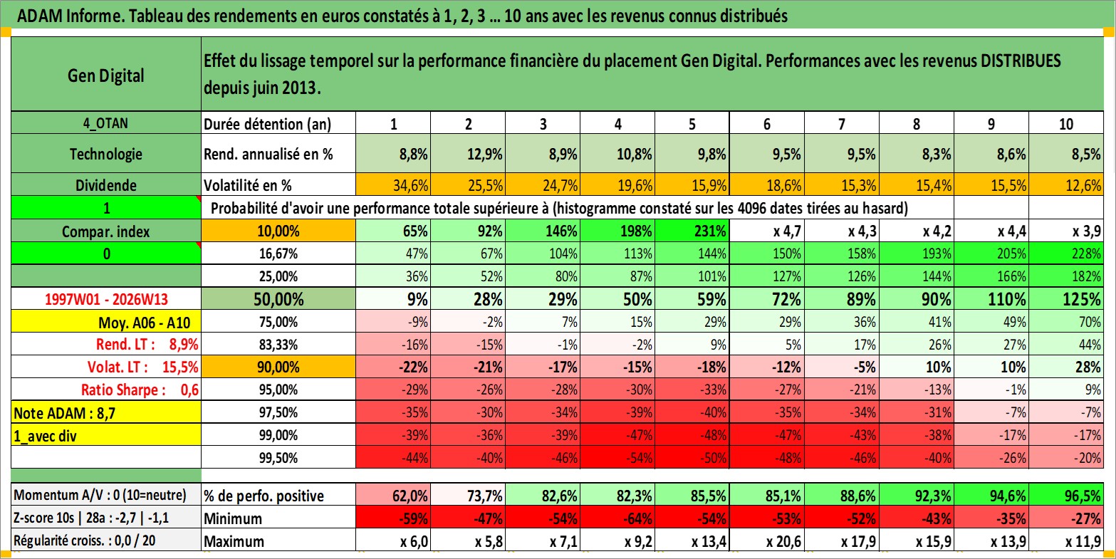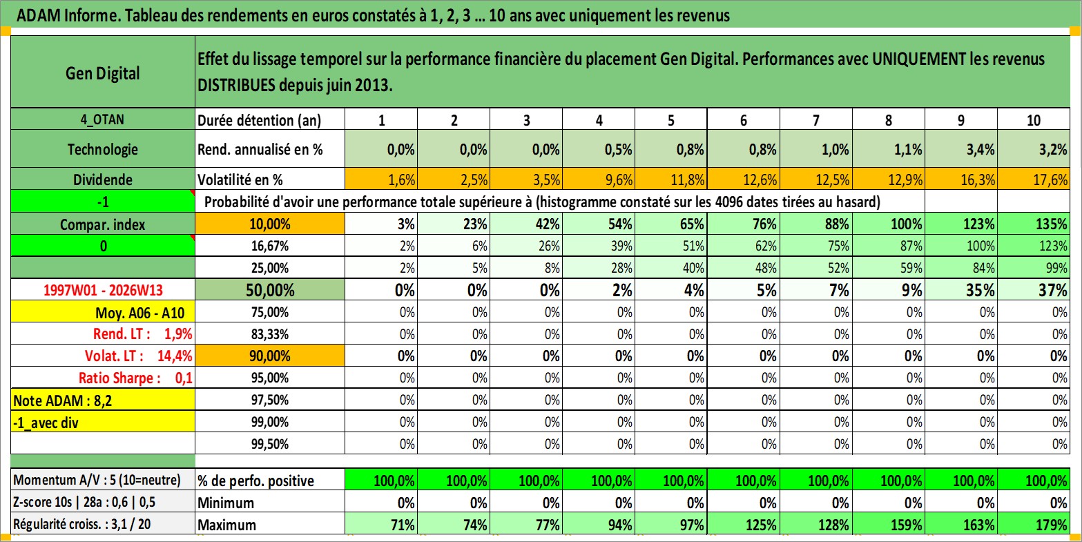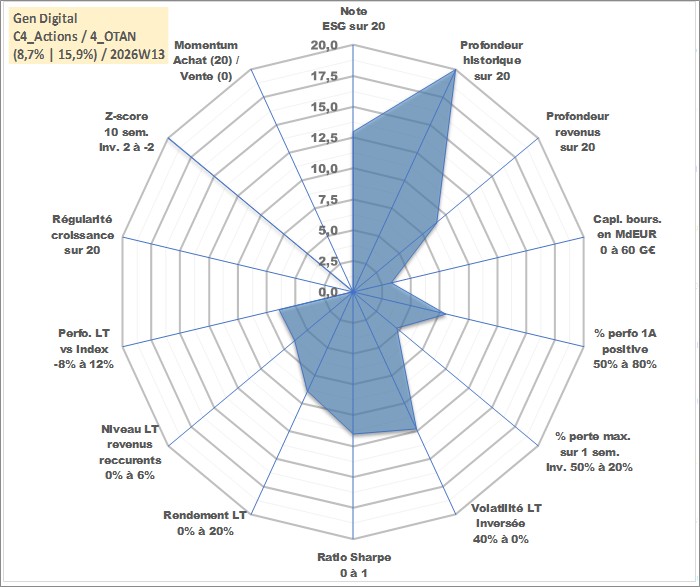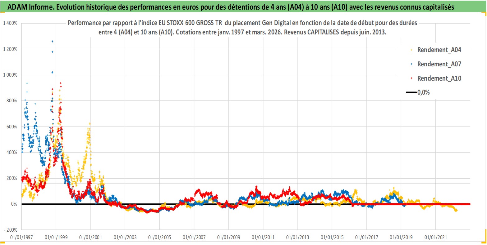 Site dédié aux investisseursPage dédiée sur site financeAnalyse des valorisations hebdomadaires de l'action Gen Digital. Cet actif est cote en USD. Les valorisations sont en contrevaleur EURO et couvrent les semaines 1997W01 a 2026W13. Les revenus de cet actif financier sont pris en compte depuis la semaine 2013W25. La note globale ESG de cet actif est estimee a 13.0 (apres rebasage entre 0 et 20).