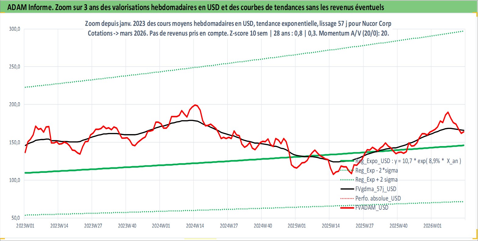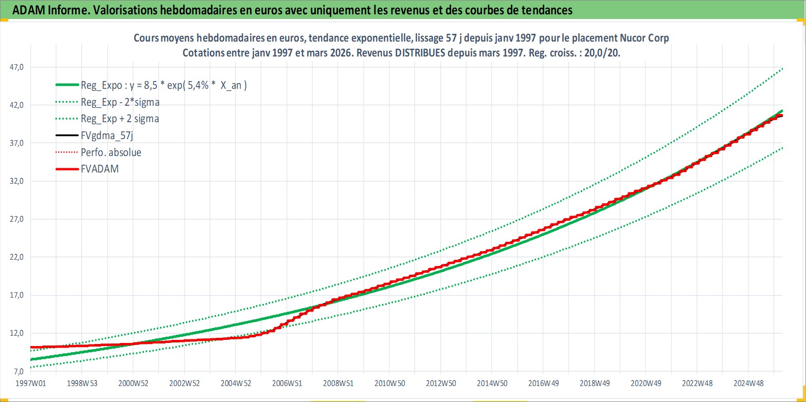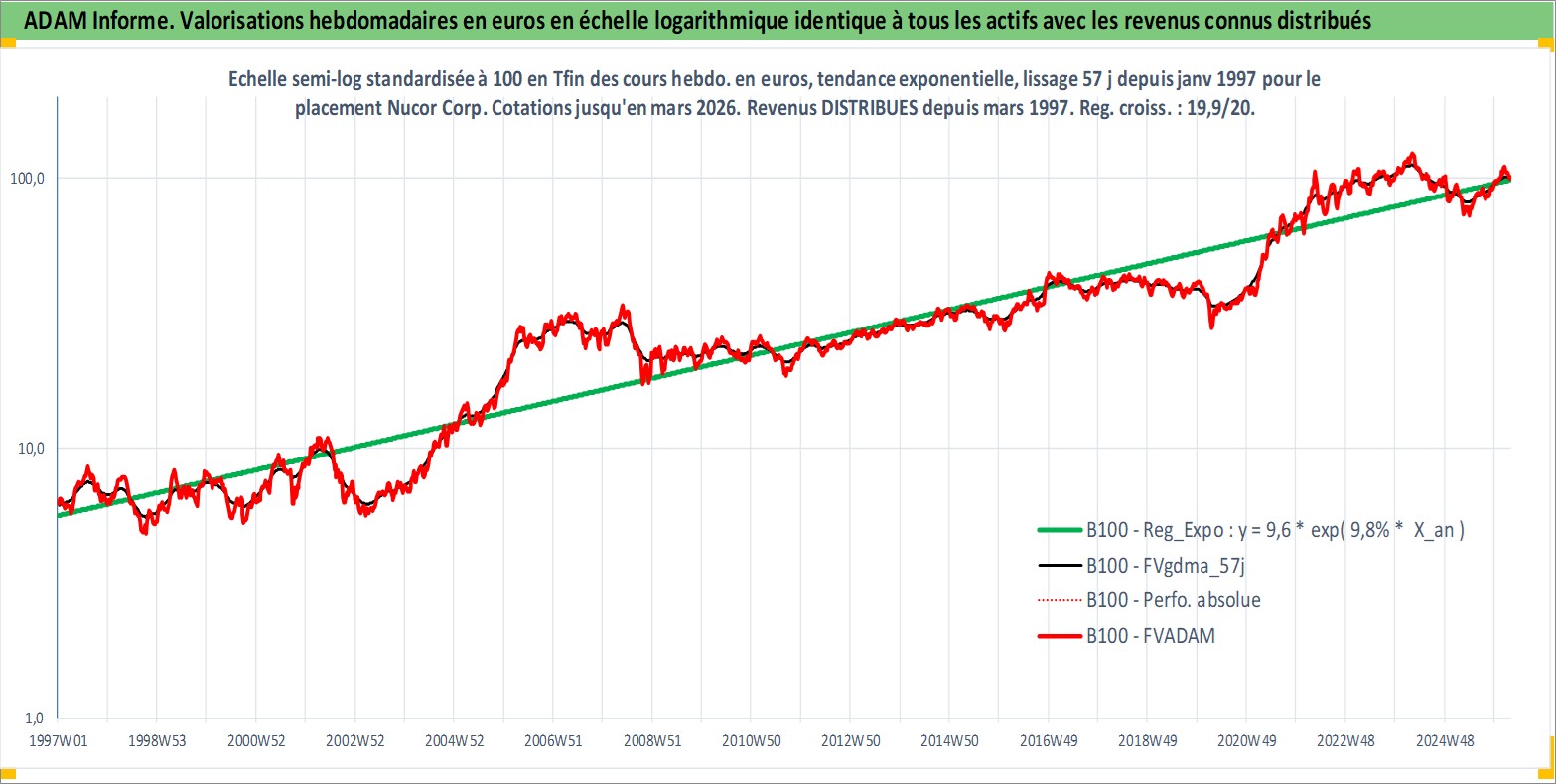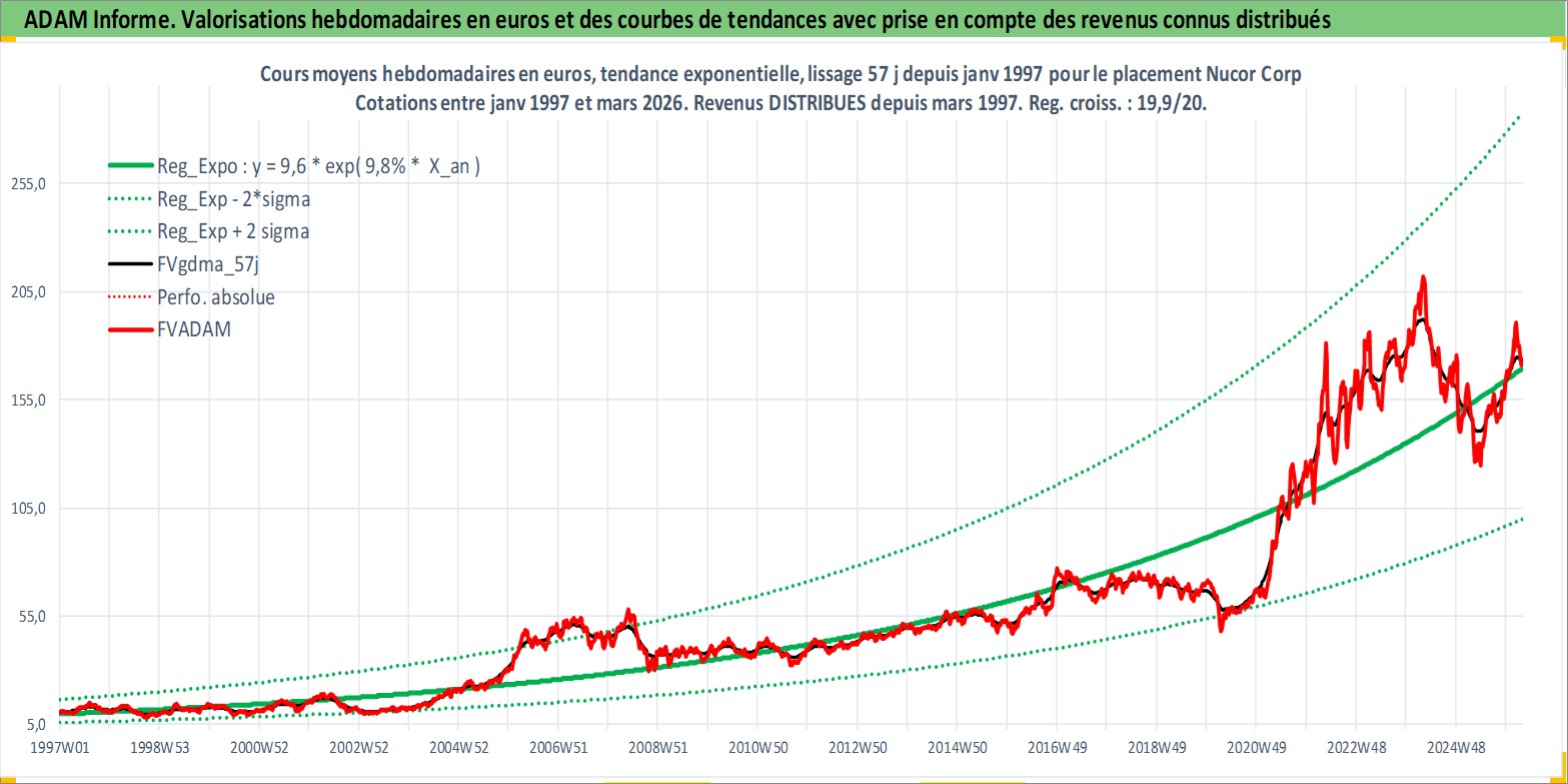 Site dédié aux investisseursPage dédiée sur site financeAnalyse des valorisations hebdomadaires de l'action Nucor Corp. Cet actif est cote en USD. Les valorisations sont en contrevaleur EURO et couvrent les semaines 1997W01 a 2026W13. Les revenus de cet actif financier sont pris en compte depuis la semaine 1997W13. La note globale ESG de cet actif est estimee a 4.0 (apres rebasage entre 0 et 20).