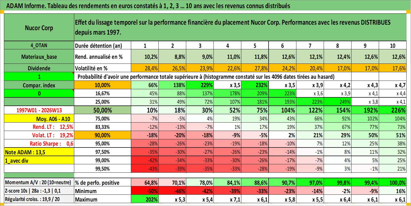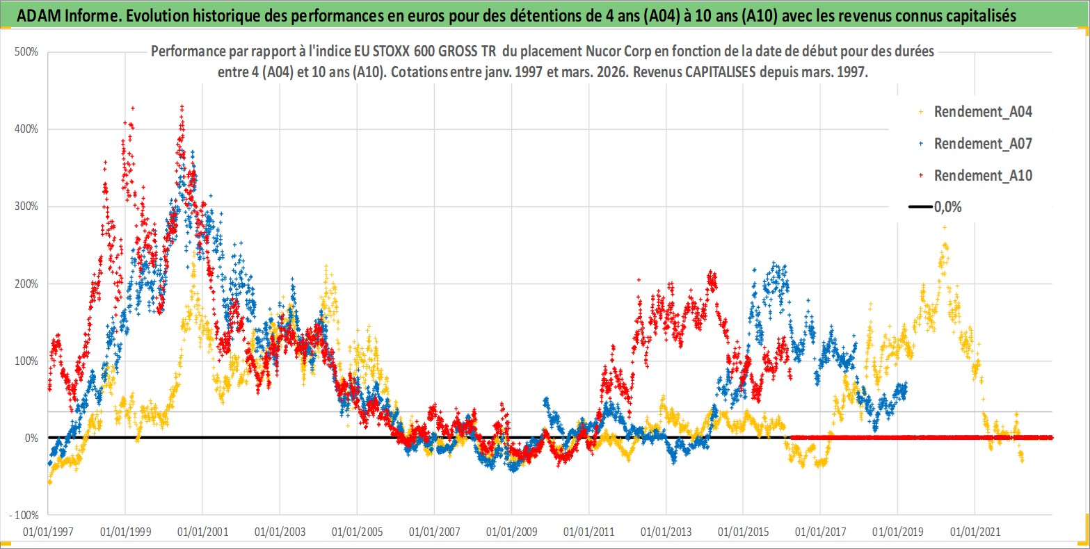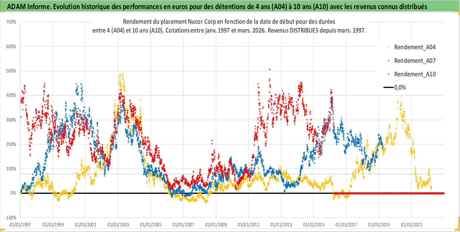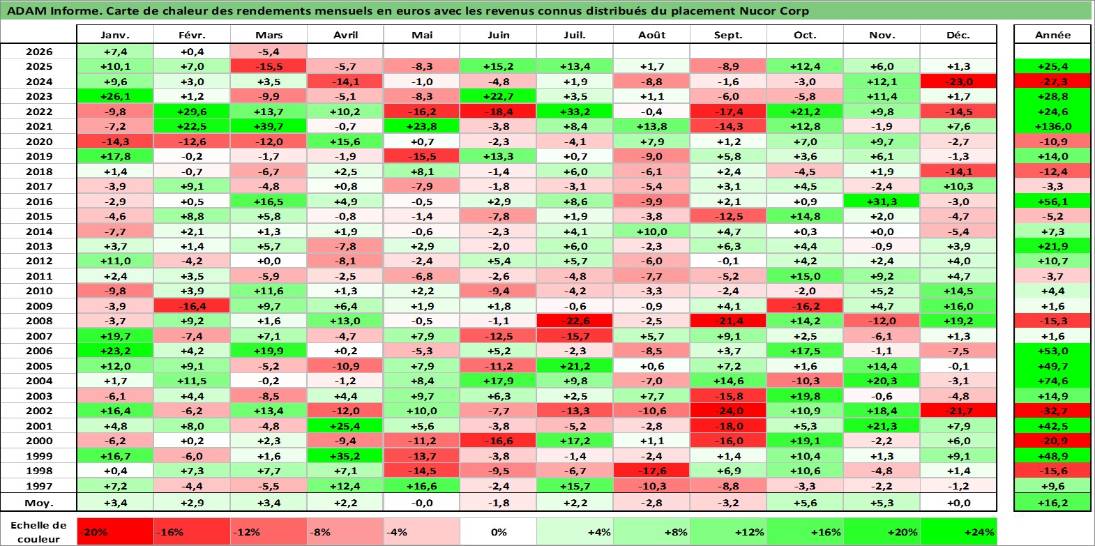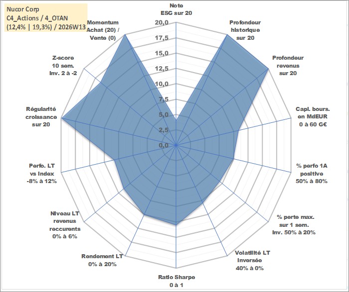 Site dédié aux investisseursPage dédiée sur site financeAnalyse des valorisations hebdomadaires de l'action Nucor Corp. Cet actif est cote en USD. Les valorisations sont en contrevaleur EURO et couvrent les semaines 1997W01 a 2026W13. Les revenus de cet actif financier sont pris en compte depuis la semaine 1997W13. La note globale ESG de cet actif est estimee a 4.0 (apres rebasage entre 0 et 20).