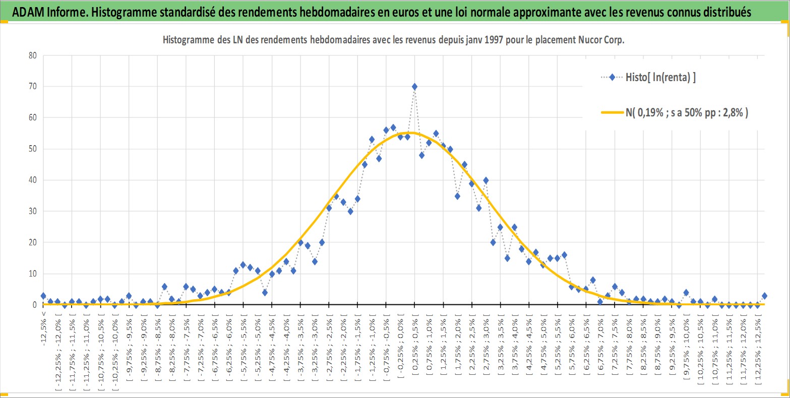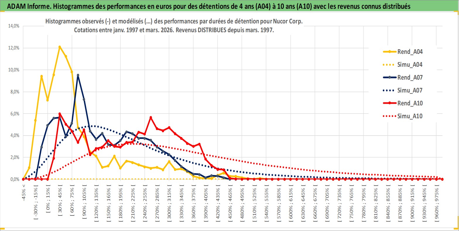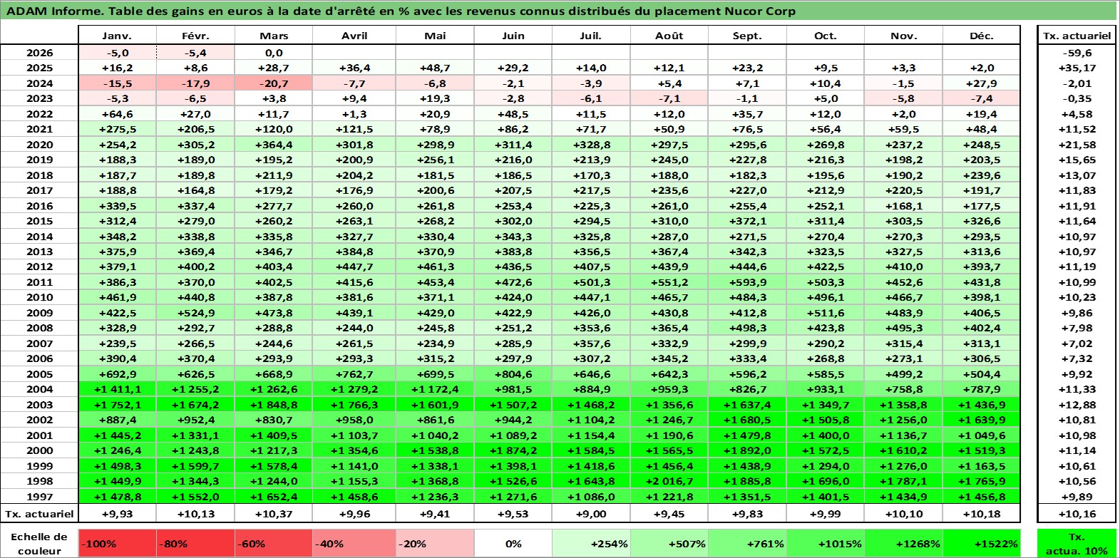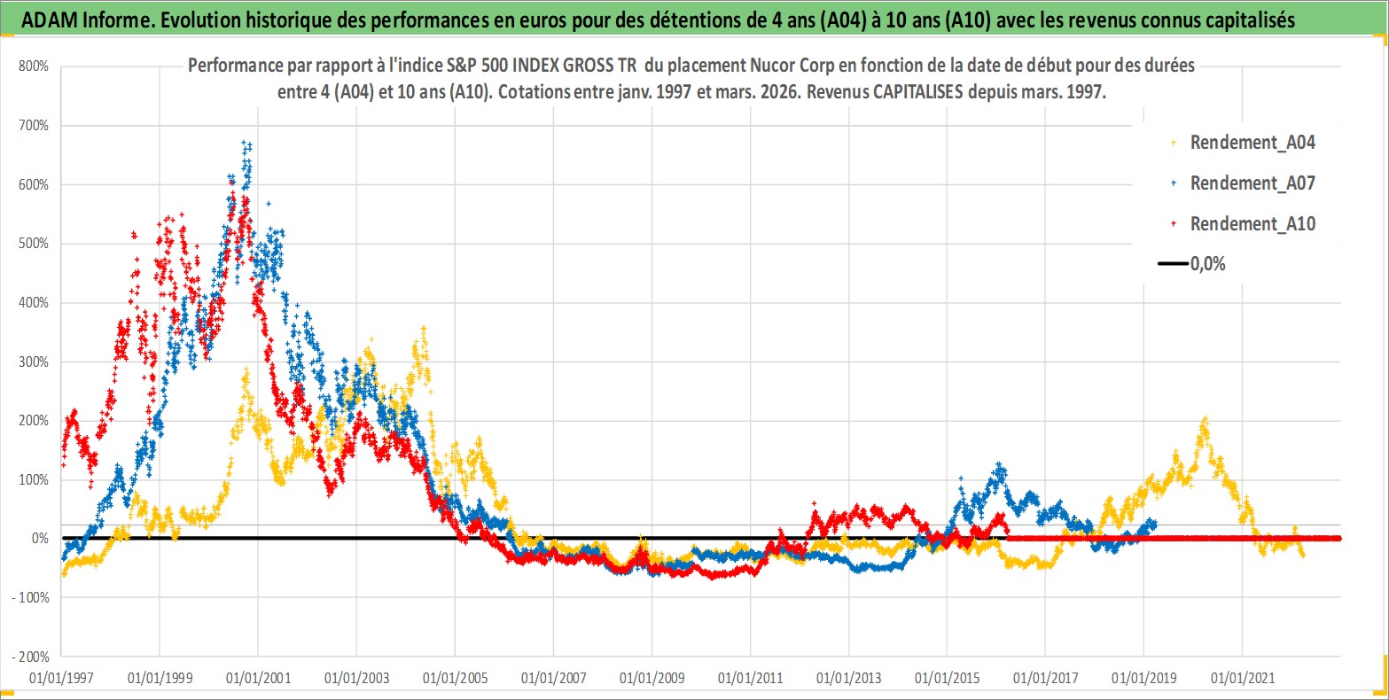 Site dédié aux investisseursPage dédiée sur site financeAnalyse des valorisations hebdomadaires de l'action Nucor Corp. Cet actif est cote en USD. Les valorisations sont en contrevaleur EURO et couvrent les semaines 1997W01 a 2026W13. Les revenus de cet actif financier sont pris en compte depuis la semaine 1997W13. La note globale ESG de cet actif est estimee a 4.0 (apres rebasage entre 0 et 20).