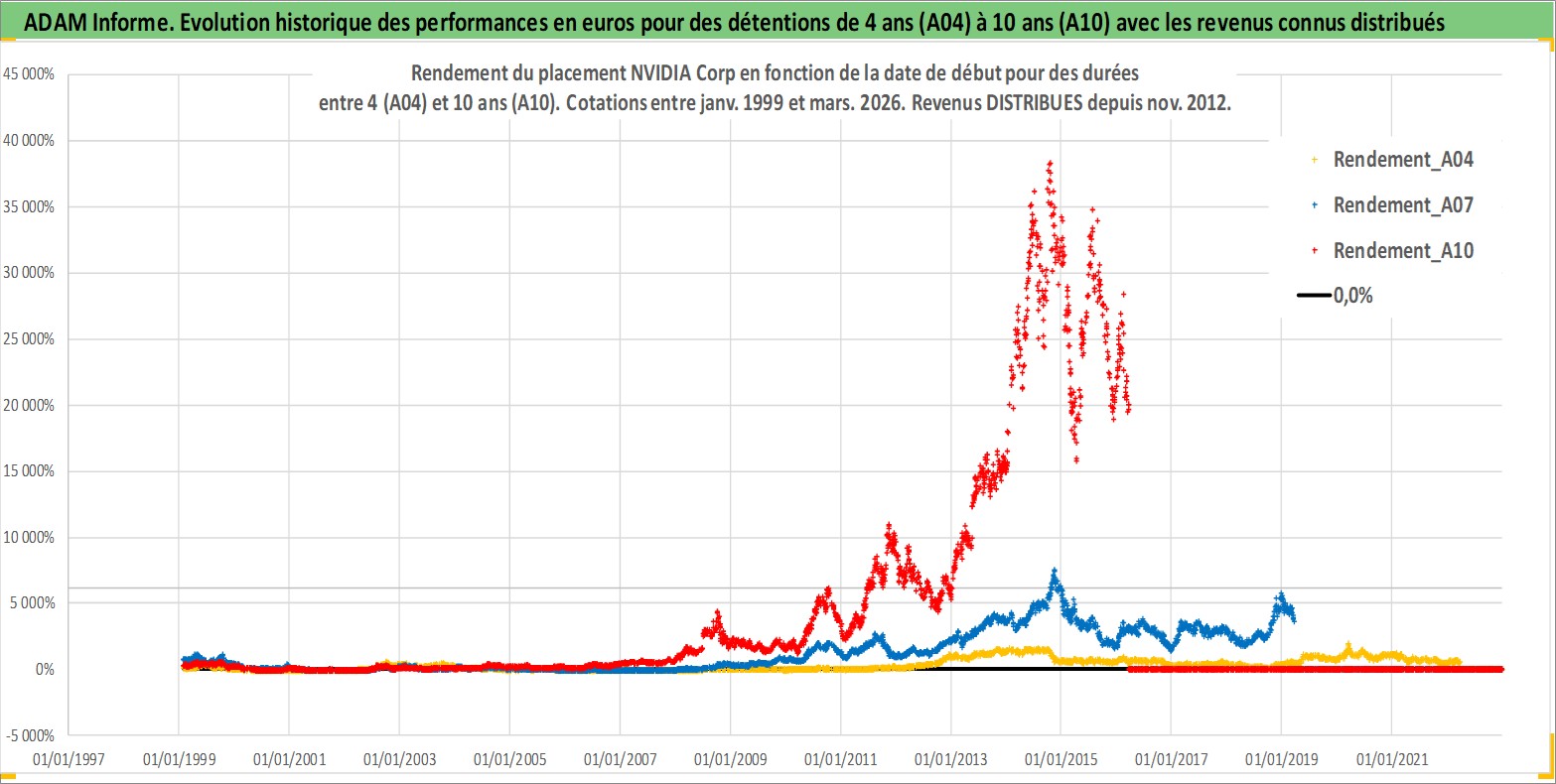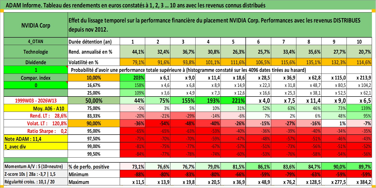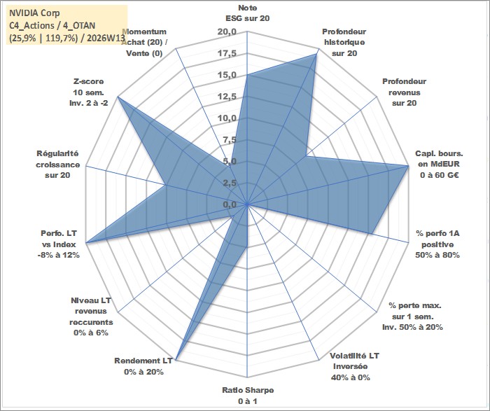 Site dédié aux investisseursPage dédiée sur site financeAnalyse des valorisations hebdomadaires de l'action NVIDIA Corp. Cet actif est cote en USD. Les valorisations sont en contrevaleur EURO et couvrent les semaines 1999W03 a 2026W13. Les revenus de cet actif financier sont pris en compte depuis la semaine 2012W47. La note globale ESG de cet actif est estimee a 15.0 (apres rebasage entre 0 et 20).