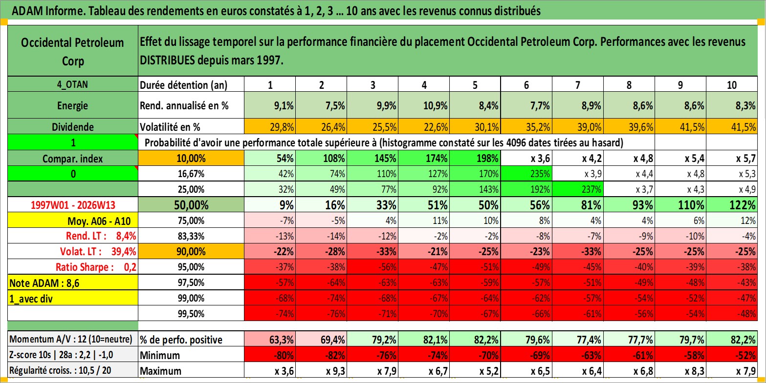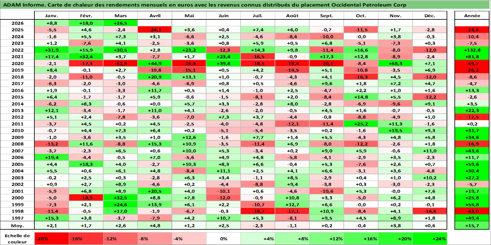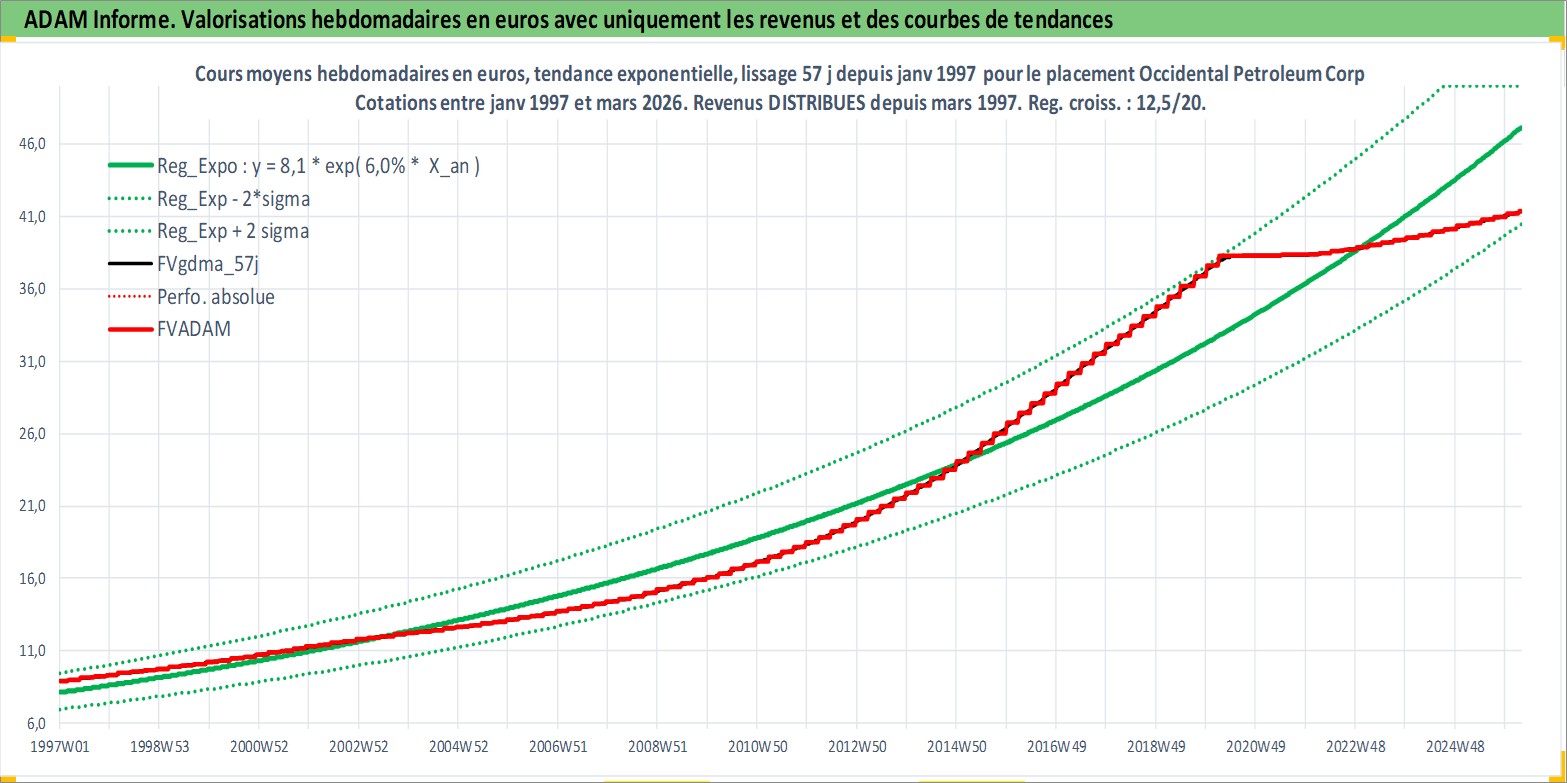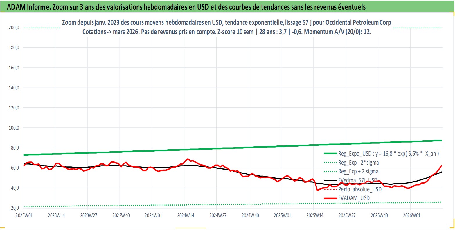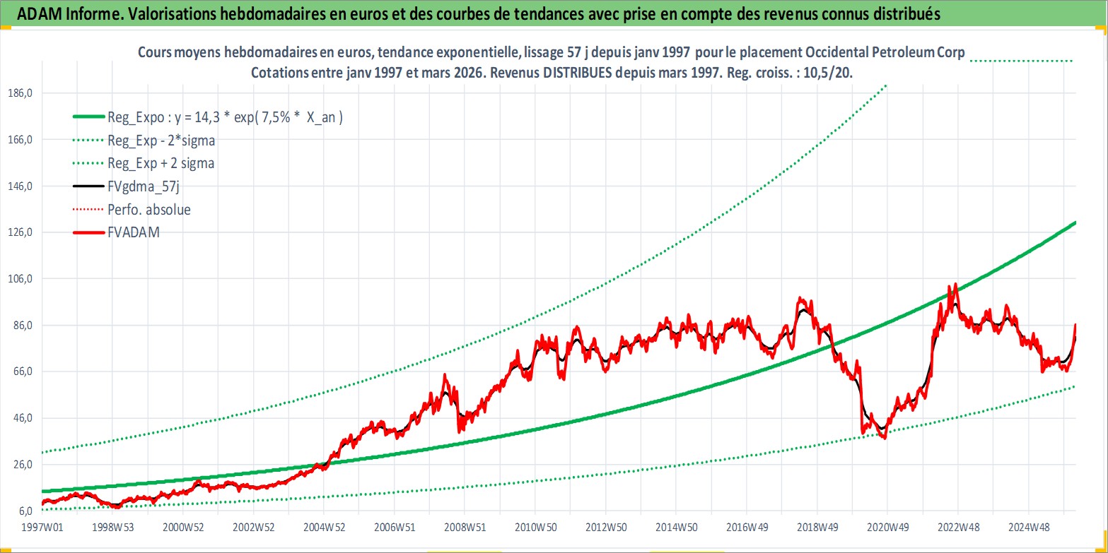 Site dédié aux investisseursPage dédiée sur site financeAnalyse des valorisations hebdomadaires de l'action Occidental Petroleum Corp. Cet actif est cote en USD. Les valorisations sont en contrevaleur EURO et couvrent les semaines 1997W01 a 2026W13. Les revenus de cet actif financier sont pris en compte depuis la semaine 1997W10. La note globale ESG de cet actif est estimee a 1.0 (apres rebasage entre 0 et 20).