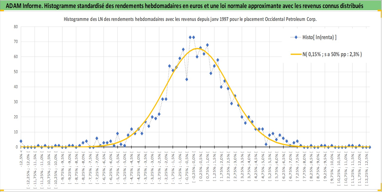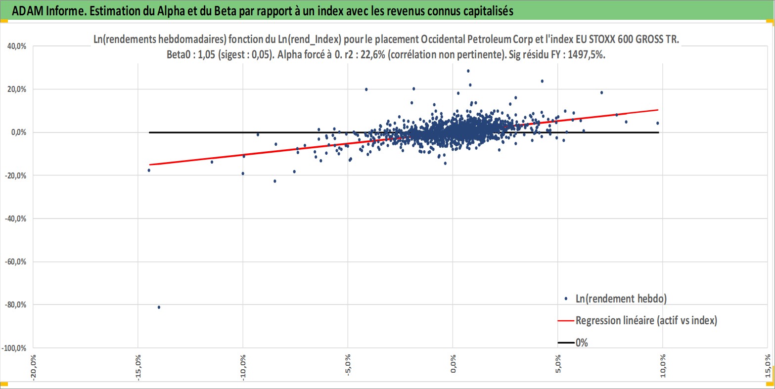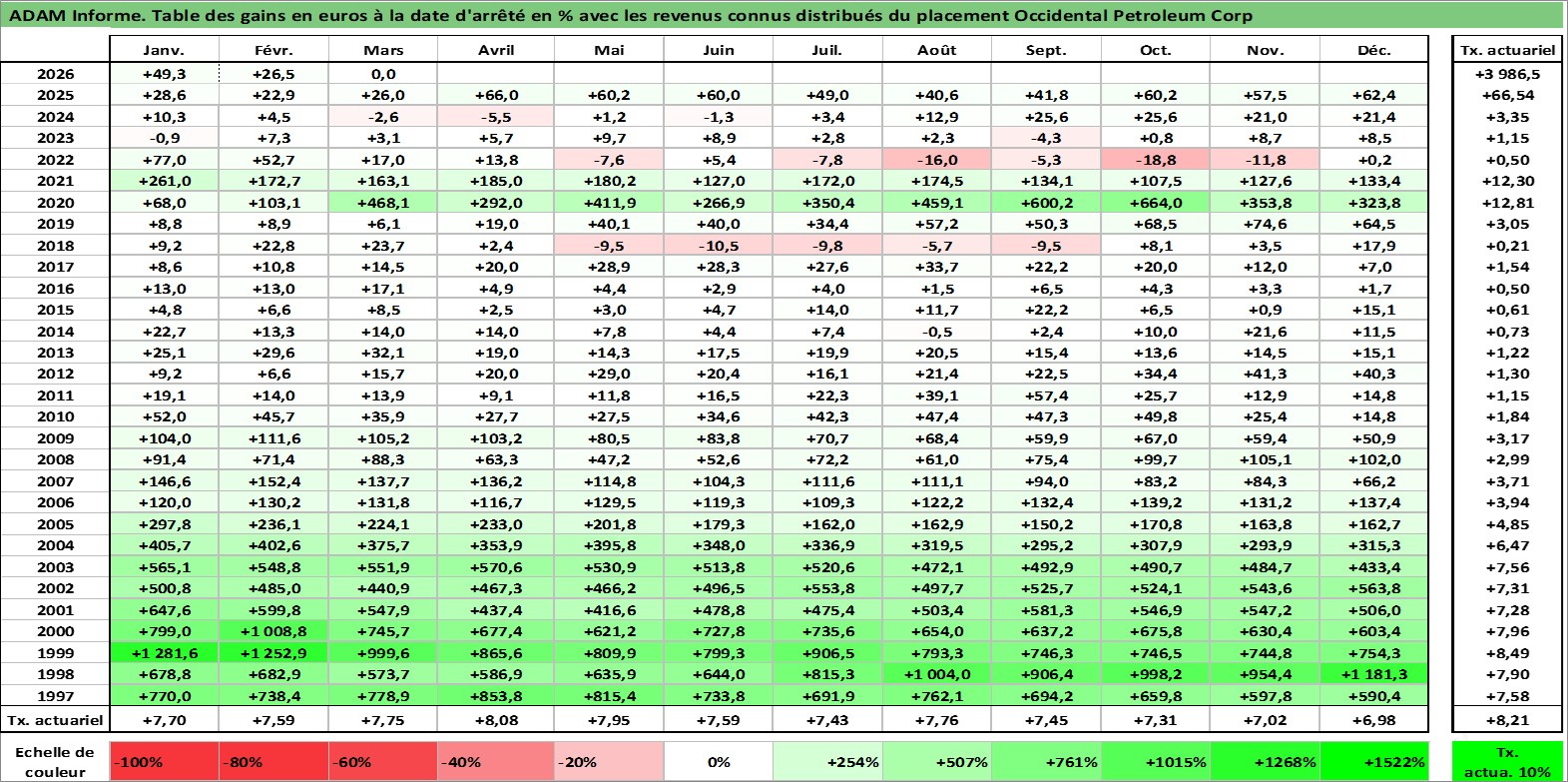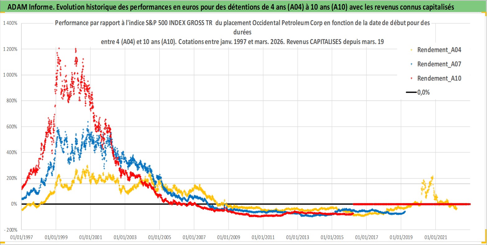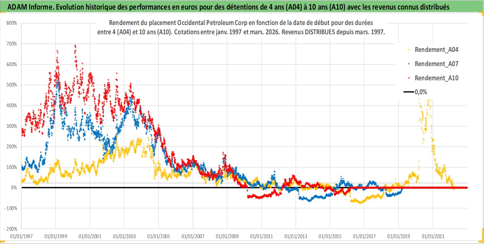 Site dédié aux investisseursPage dédiée sur site financeAnalyse des valorisations hebdomadaires de l'action Occidental Petroleum Corp. Cet actif est cote en USD. Les valorisations sont en contrevaleur EURO et couvrent les semaines 1997W01 a 2026W13. Les revenus de cet actif financier sont pris en compte depuis la semaine 1997W10. La note globale ESG de cet actif est estimee a 1.0 (apres rebasage entre 0 et 20).