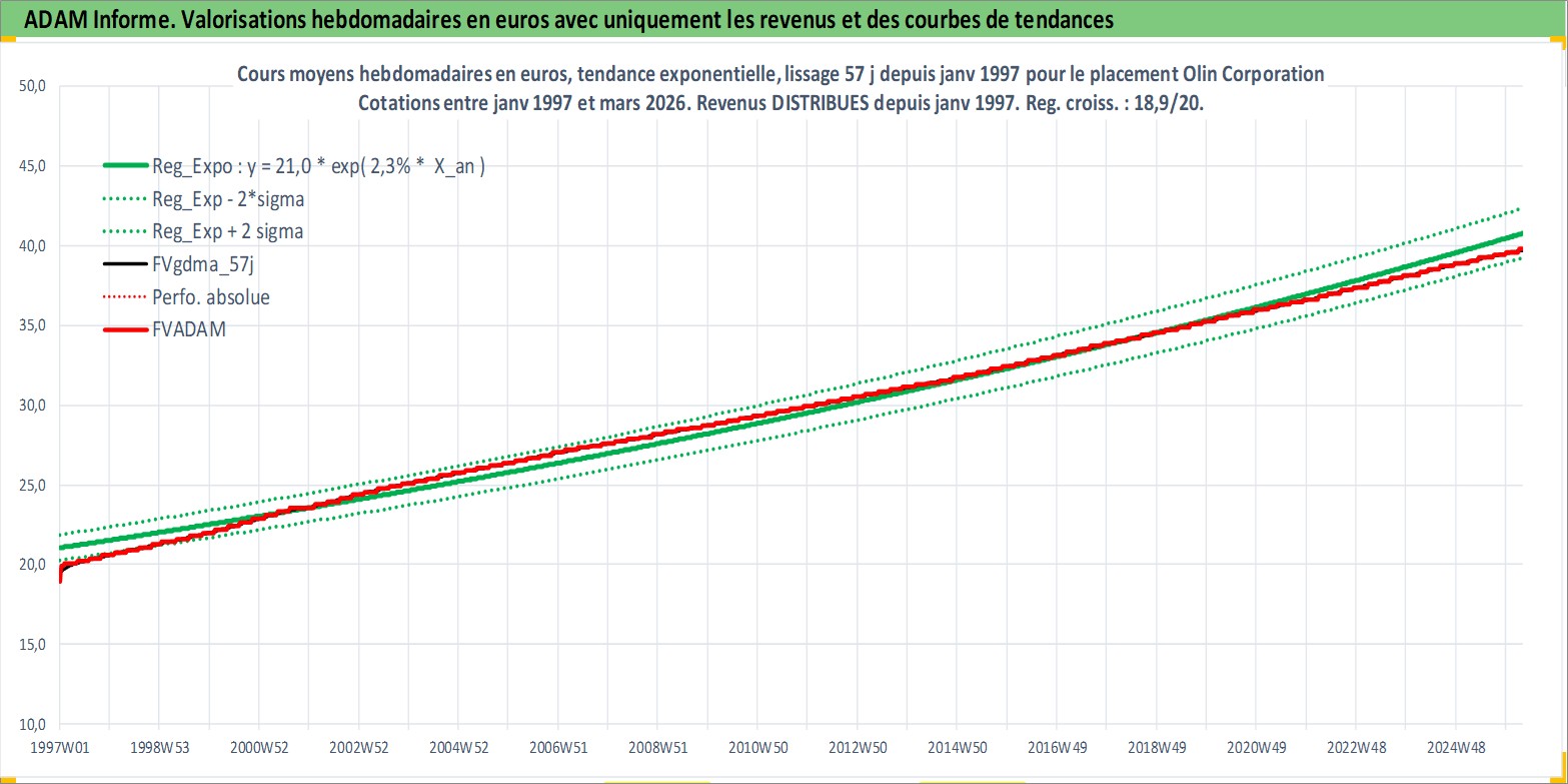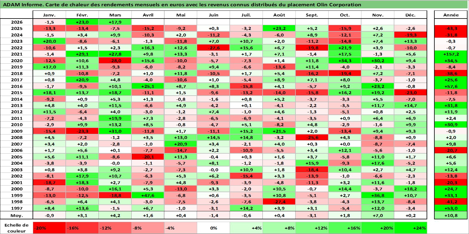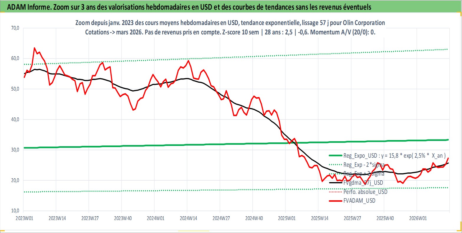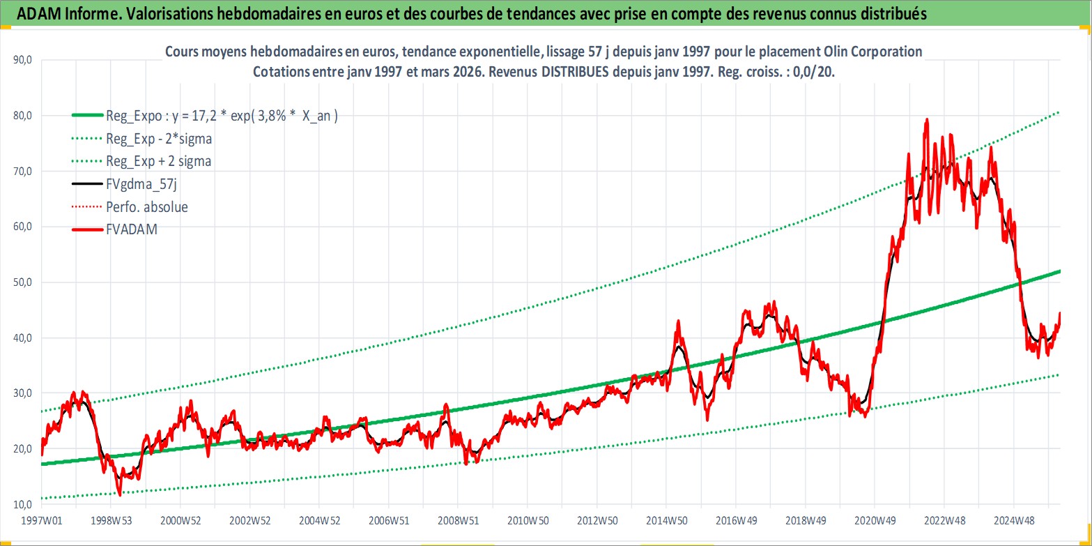 Site dédié aux investisseursPage dédiée sur site financeAnalyse des valorisations hebdomadaires de l'action Olin Corporation. Cet actif est cote en USD. Les valorisations sont en contrevaleur EURO et couvrent les semaines 1997W01 a 2026W13. Les revenus de cet actif financier sont pris en compte depuis la semaine 1997W02. La note ESG de cet actif n'est pas connue.