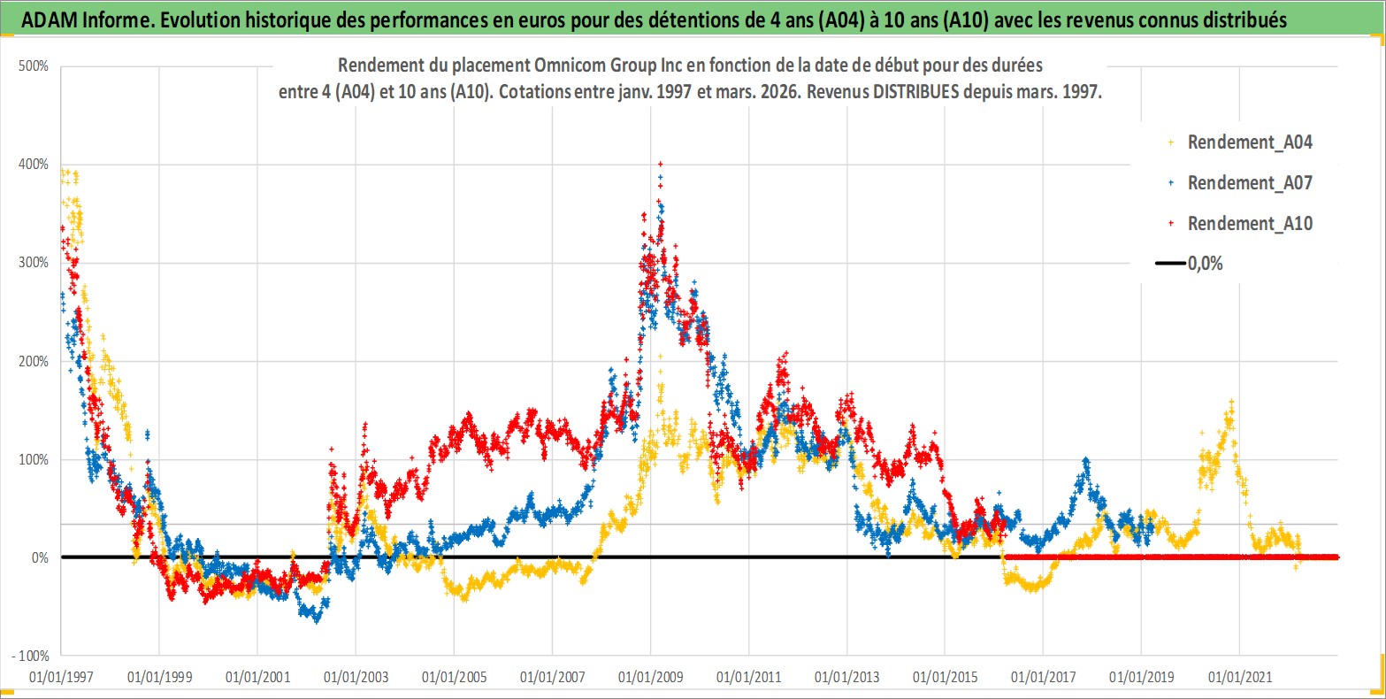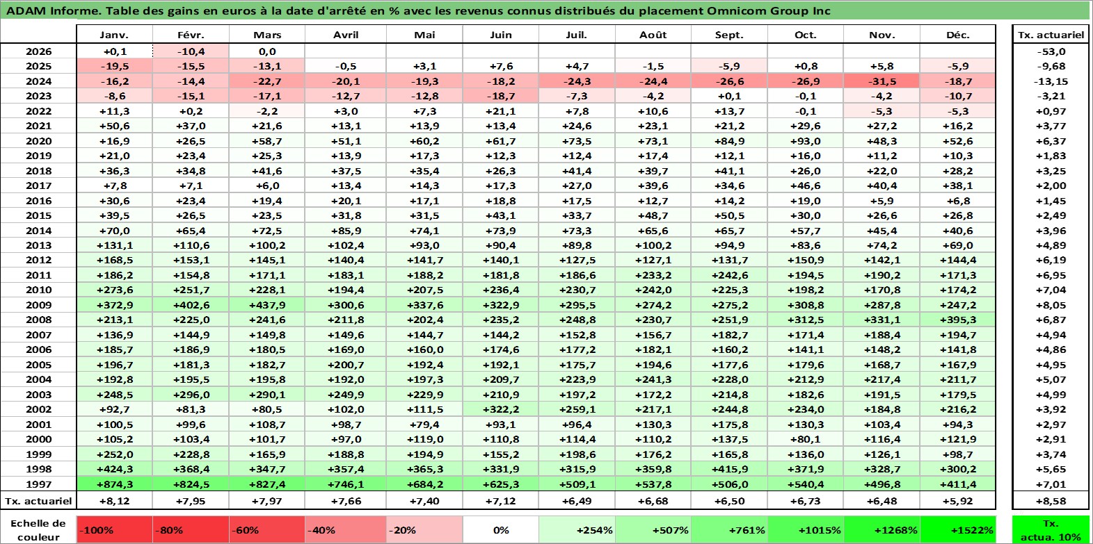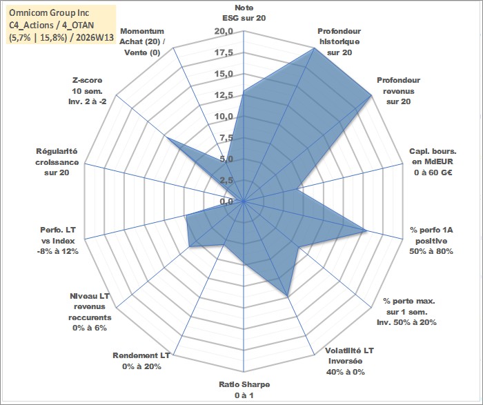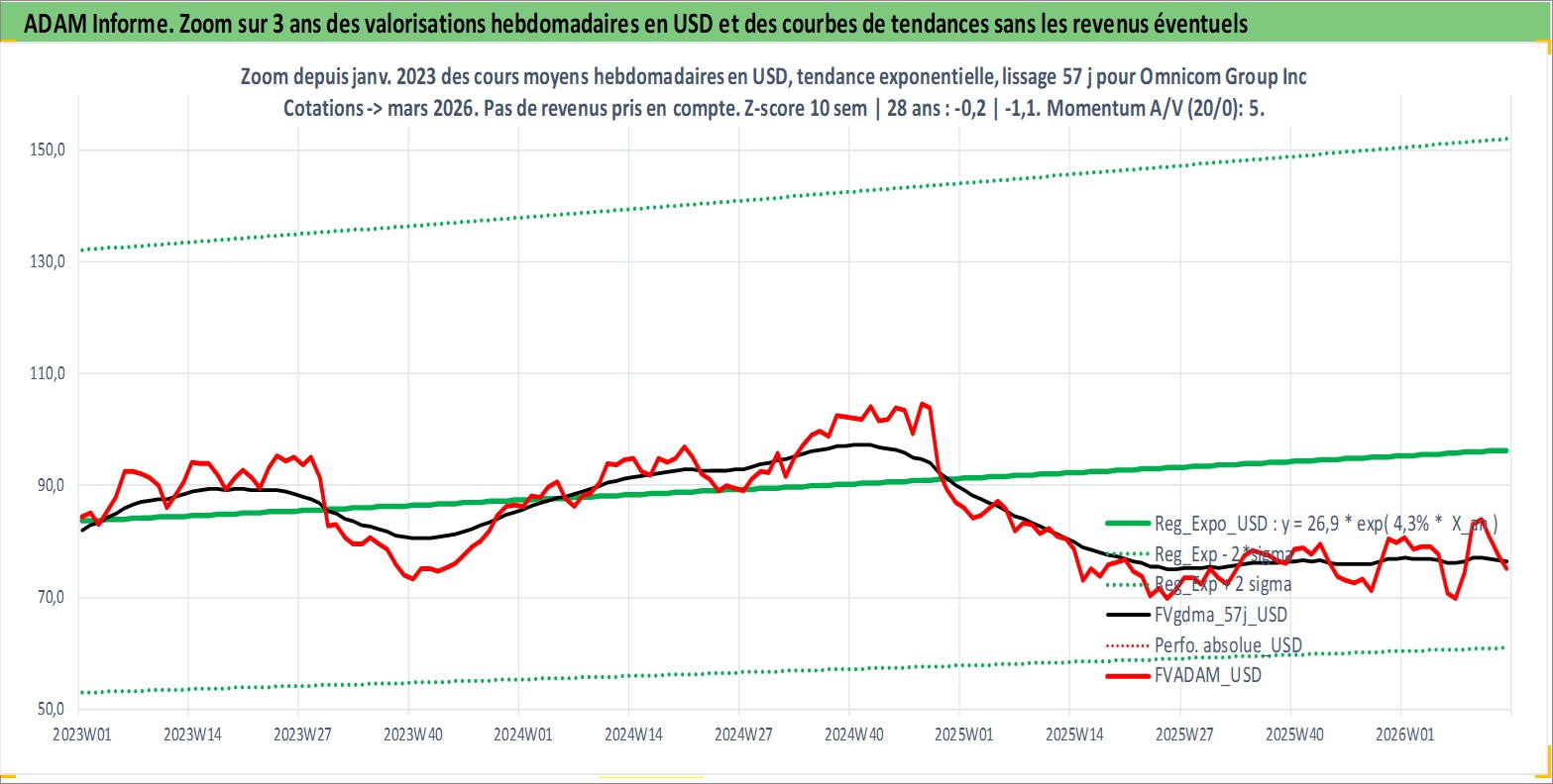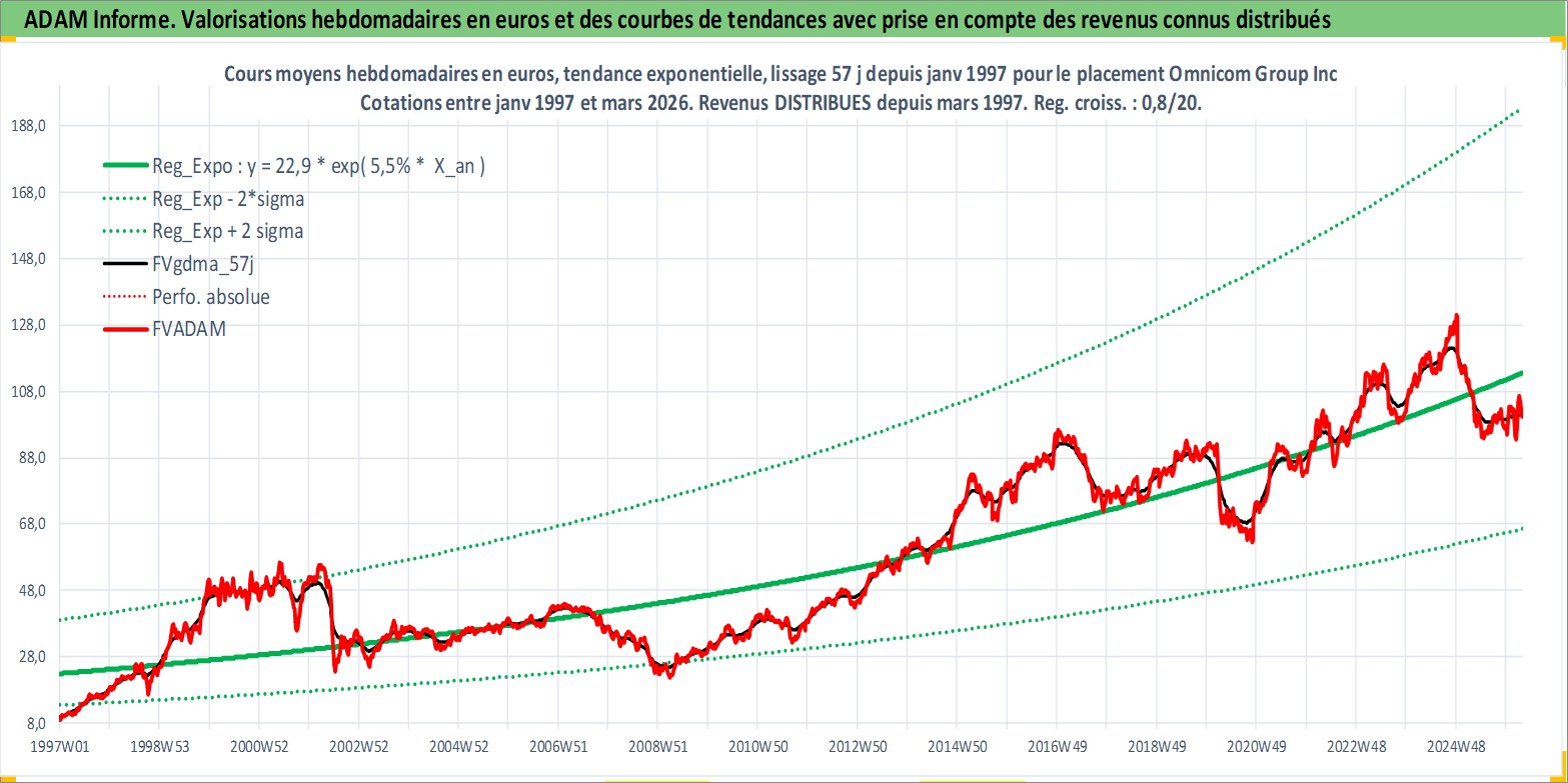Site dédié aux investisseursPage dédiée sur site financeAnalyse des valorisations hebdomadaires de l'action Omnicom Group Inc. Cet actif est cote en USD. Les valorisations sont en contrevaleur EURO et couvrent les semaines 1997W01 a 2026W13. Les revenus de cet actif financier sont pris en compte depuis la semaine 1997W11. La note globale ESG de cet actif est estimee a 13.0 (apres rebasage entre 0 et 20).