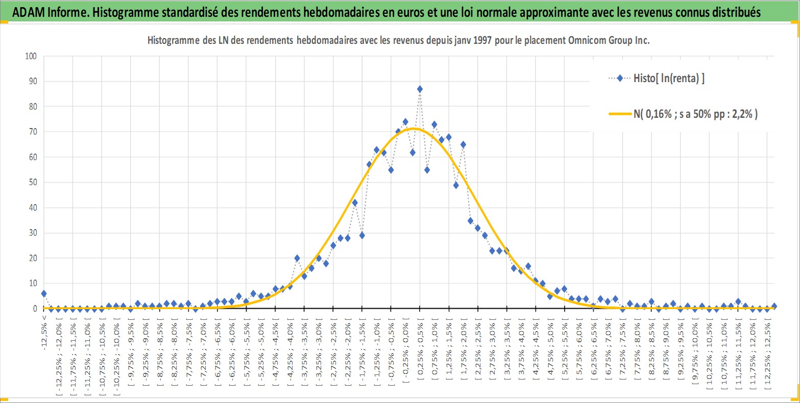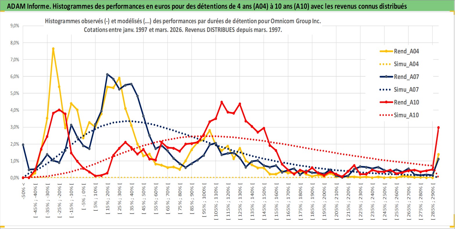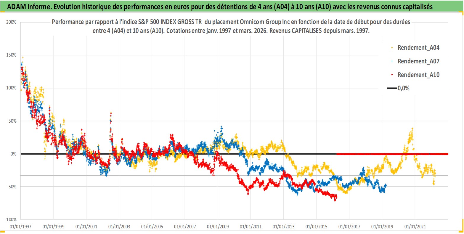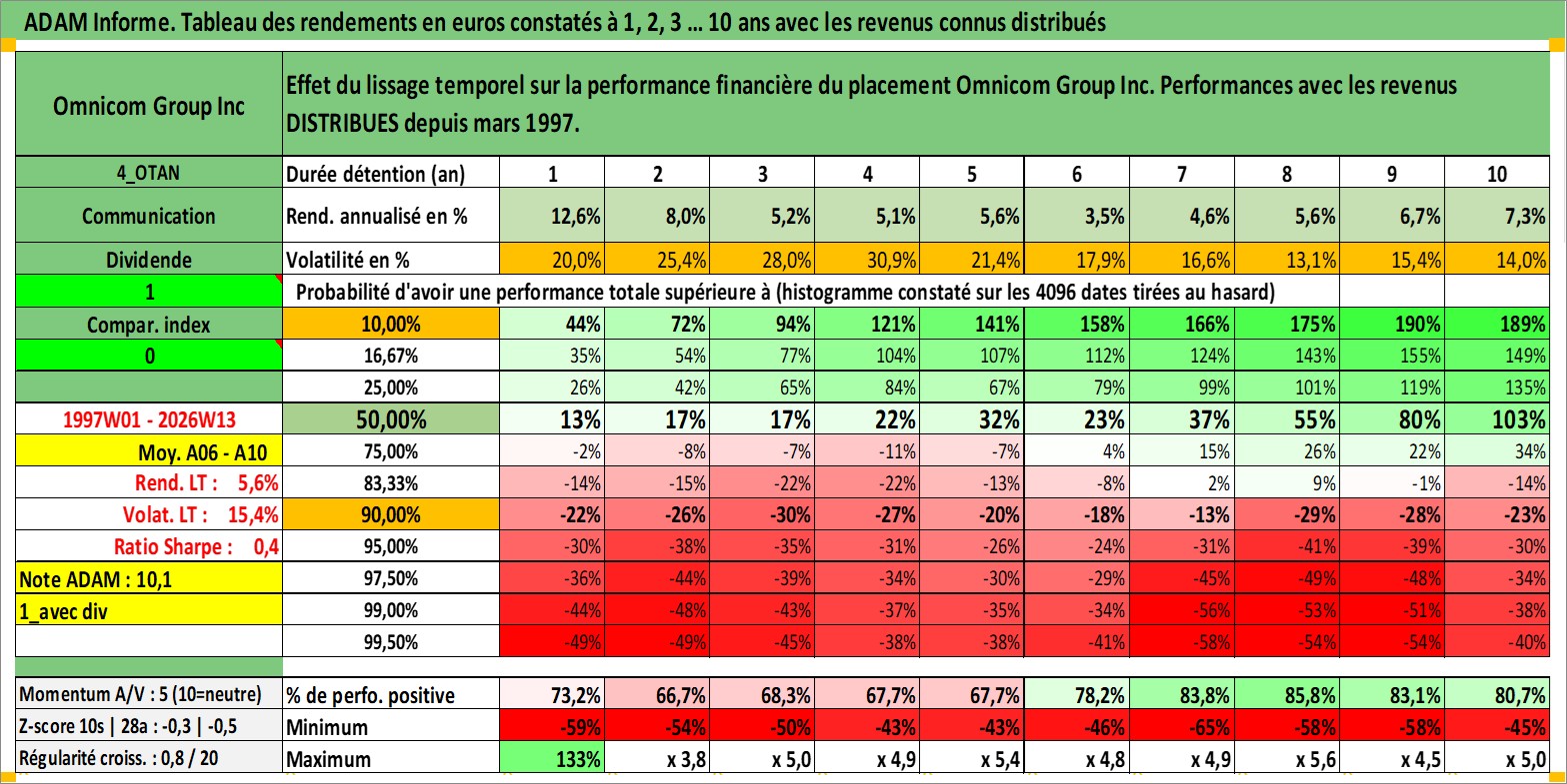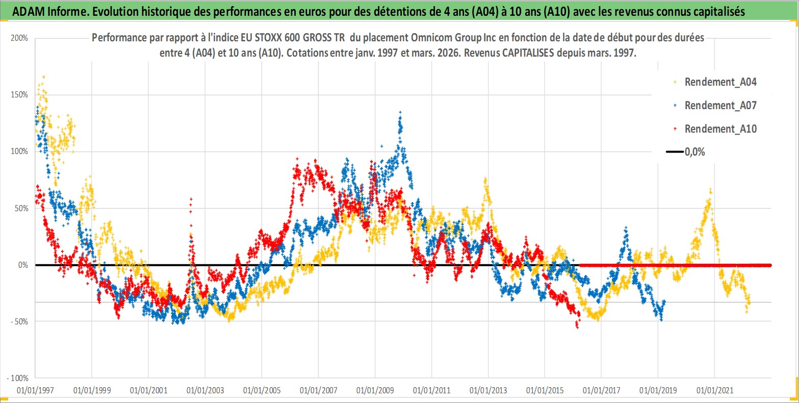Site dédié aux investisseursPage dédiée sur site financeAnalyse des valorisations hebdomadaires de l'action Omnicom Group Inc. Cet actif est cote en USD. Les valorisations sont en contrevaleur EURO et couvrent les semaines 1997W01 a 2026W13. Les revenus de cet actif financier sont pris en compte depuis la semaine 1997W11. La note globale ESG de cet actif est estimee a 13.0 (apres rebasage entre 0 et 20).