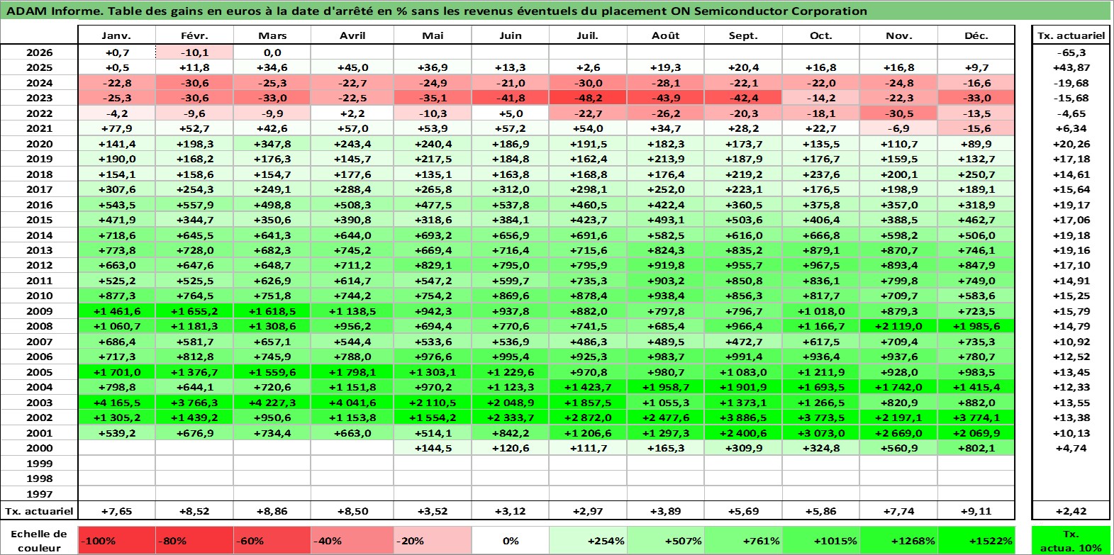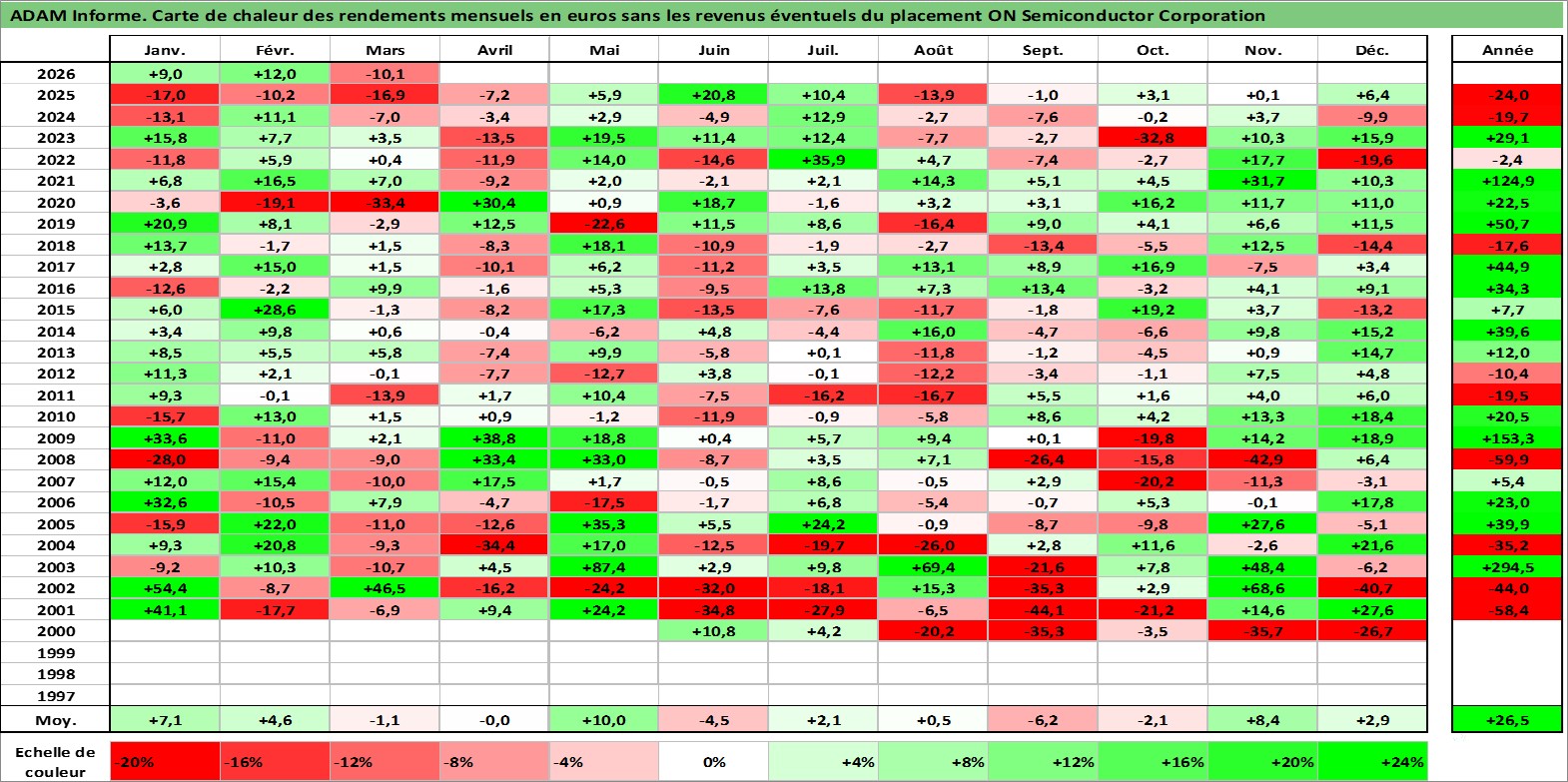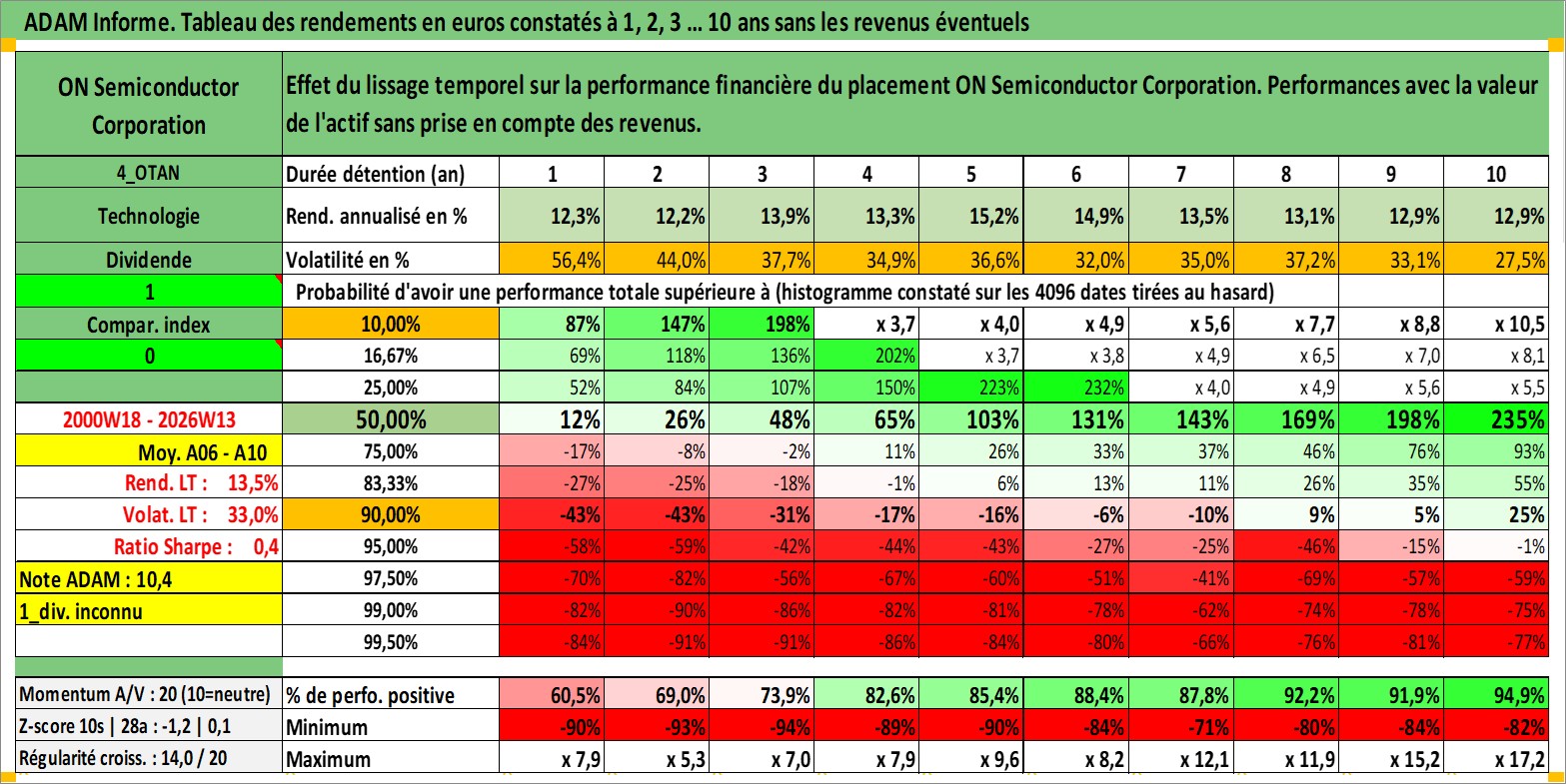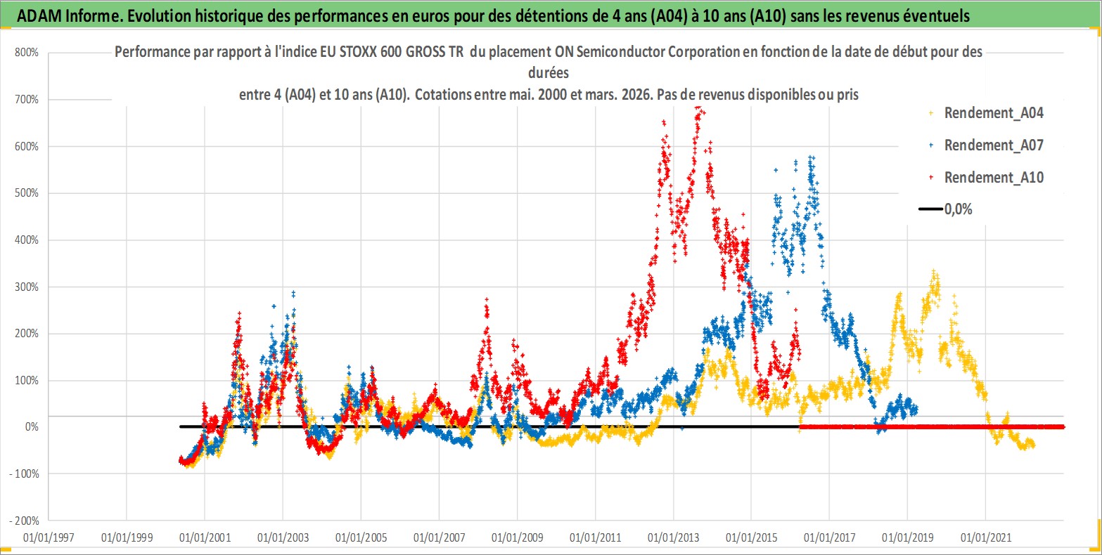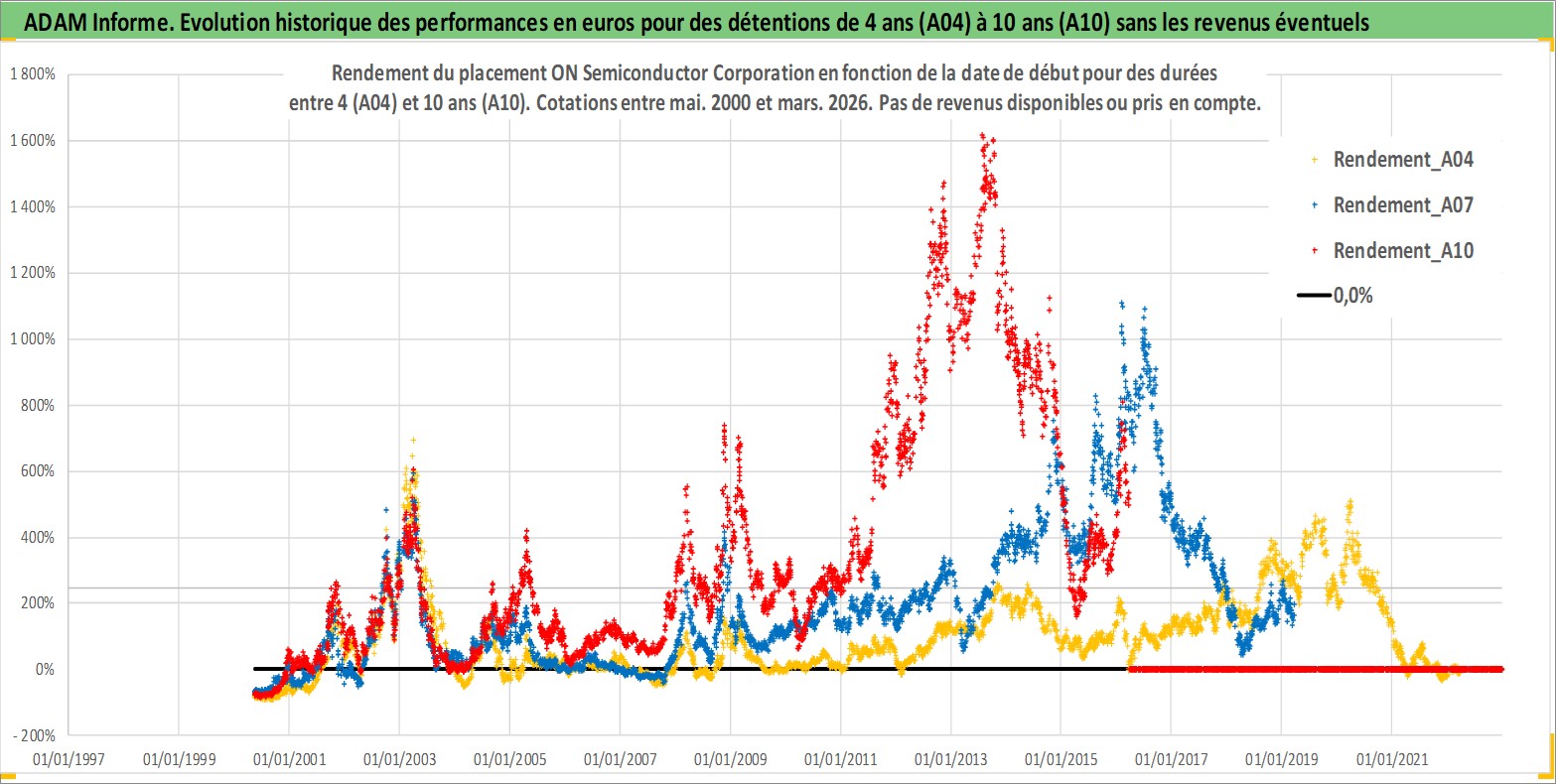Site dédié aux investisseursPage dédiée sur site financeAnalyse des valorisations hebdomadaires de l'action ON Semiconductor Corporation. Cet actif est cote en USD. Les valorisations sont en contrevaleur EURO et couvrent les semaines 2000W18 a 2026W13. Les revenus de cet actif financier ne sont pas connus car non existants ou non disponibles sur le site Yahoo Finance. La note globale ESG de cet actif est estimee a 7.0 (apres rebasage entre 0 et 20).