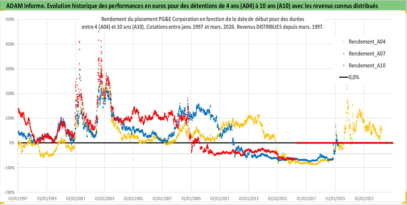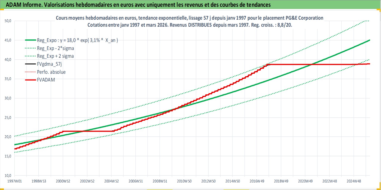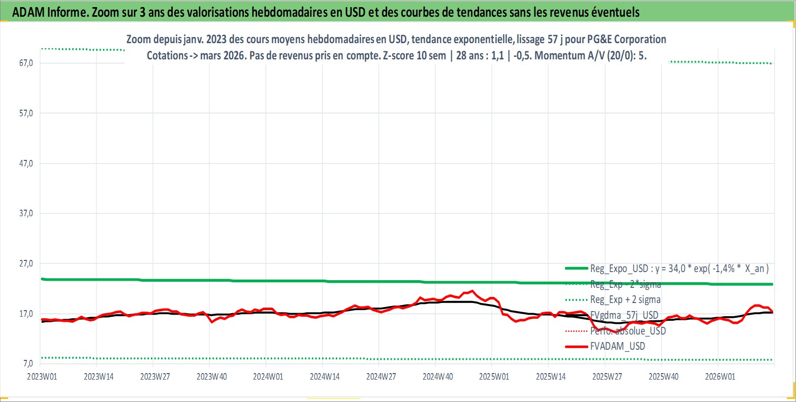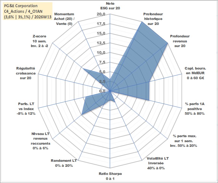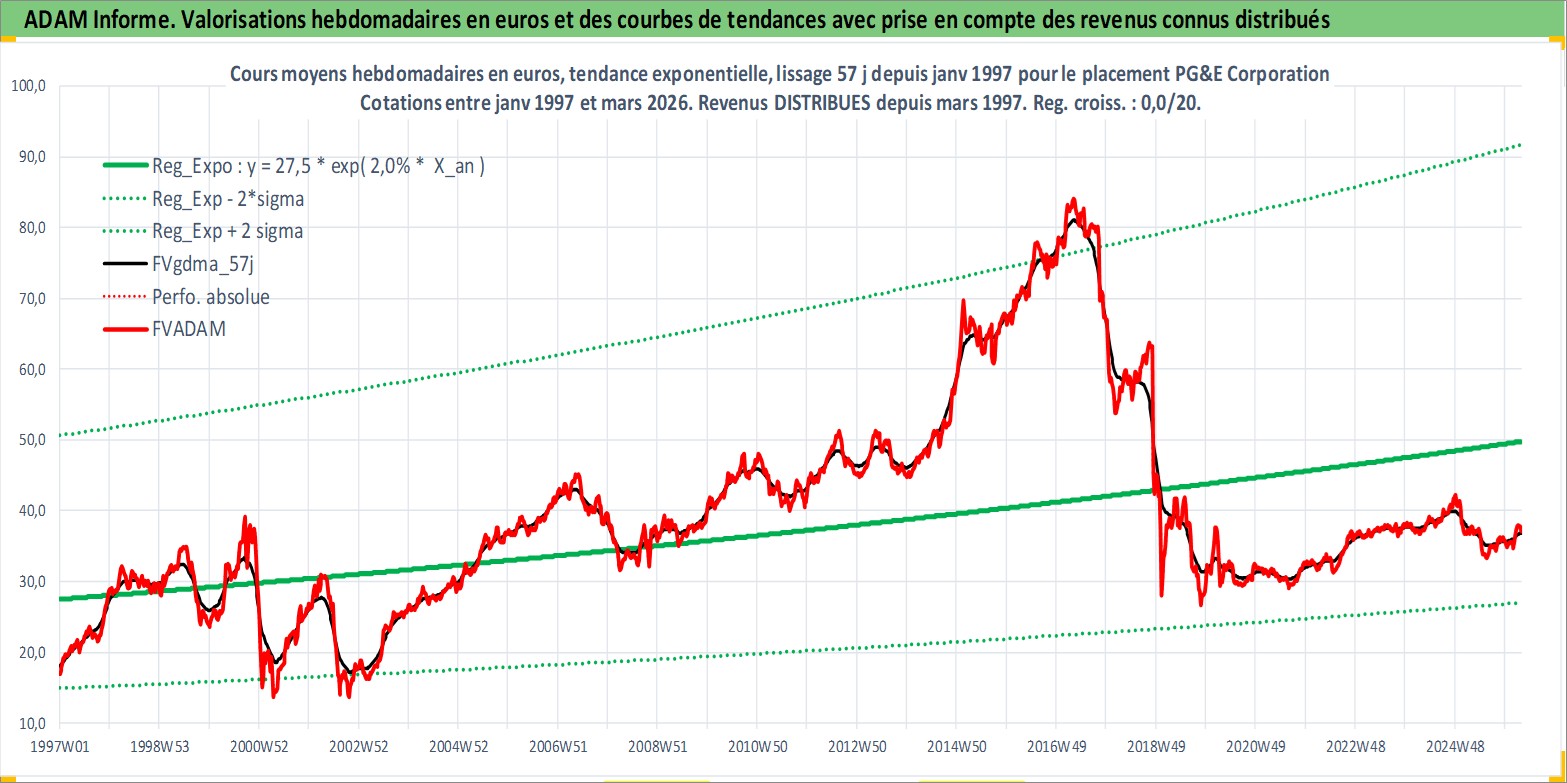 Site dédié aux investisseursPage dédiée sur site financeAnalyse des valorisations hebdomadaires de l'action PG&E Corporation. Cet actif est cote en USD. Les valorisations sont en contrevaleur EURO et couvrent les semaines 1997W01 a 2026W13. Les revenus de cet actif financier sont pris en compte depuis la semaine 1997W11. La note globale ESG de cet actif est estimee a 3.0 (apres rebasage entre 0 et 20).