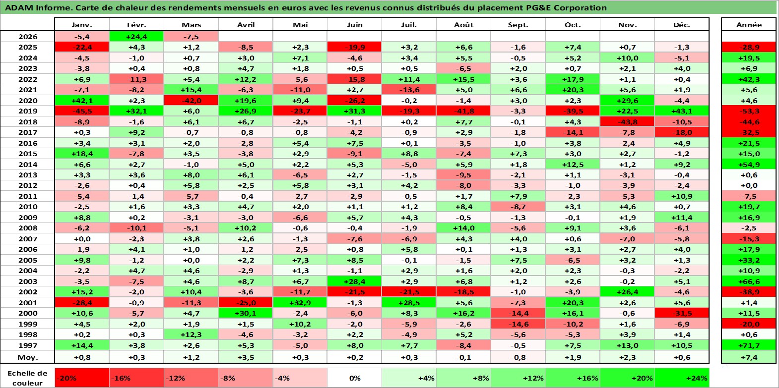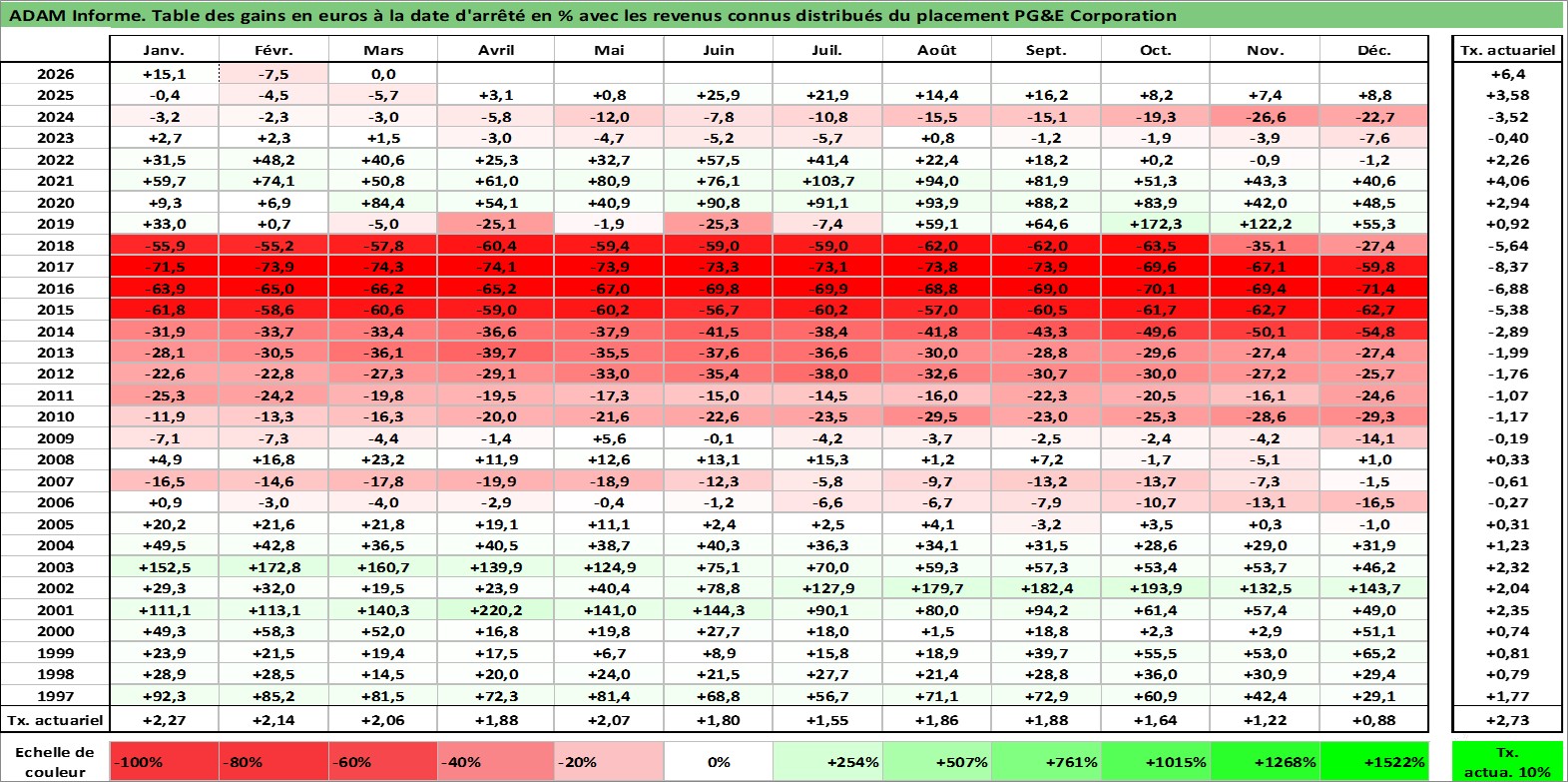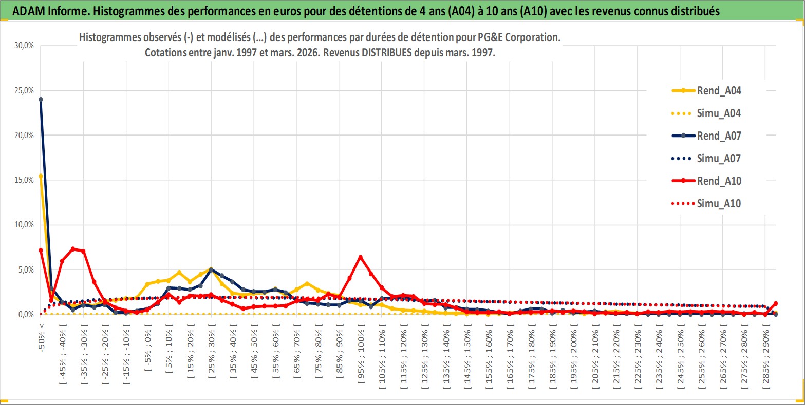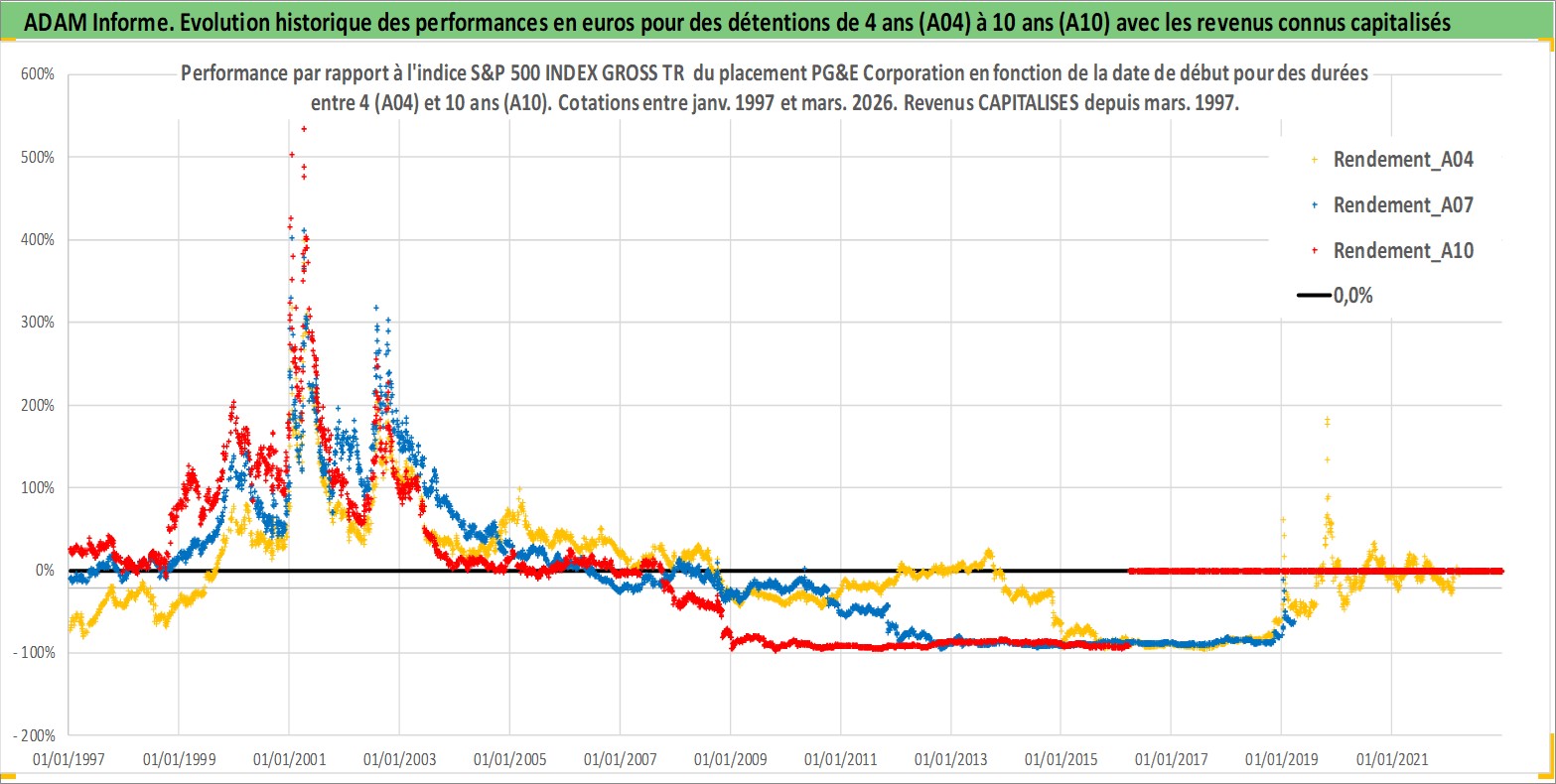 Site dédié aux investisseursPage dédiée sur site financeAnalyse des valorisations hebdomadaires de l'action PG&E Corporation. Cet actif est cote en USD. Les valorisations sont en contrevaleur EURO et couvrent les semaines 1997W01 a 2026W13. Les revenus de cet actif financier sont pris en compte depuis la semaine 1997W11. La note globale ESG de cet actif est estimee a 3.0 (apres rebasage entre 0 et 20).