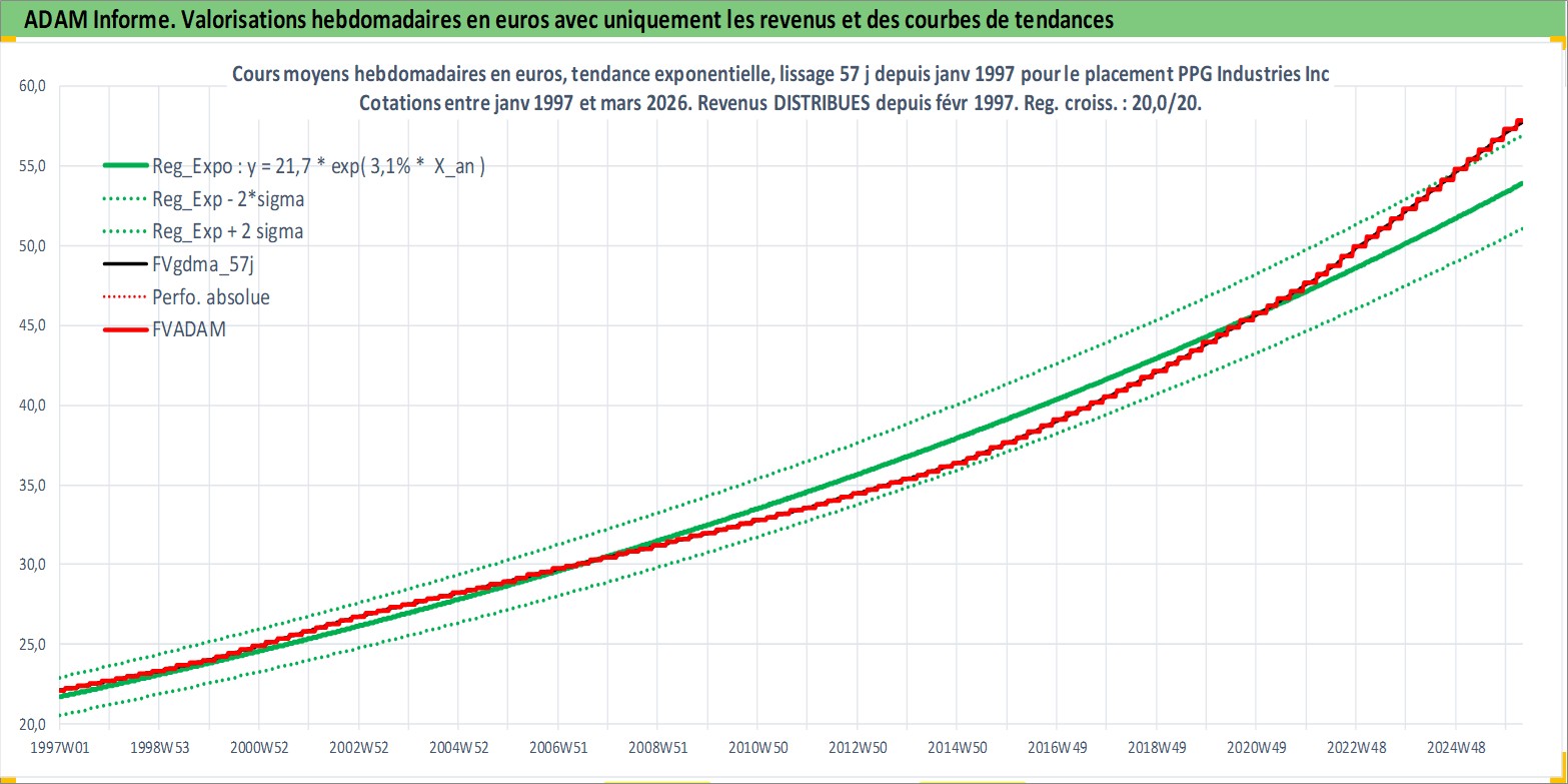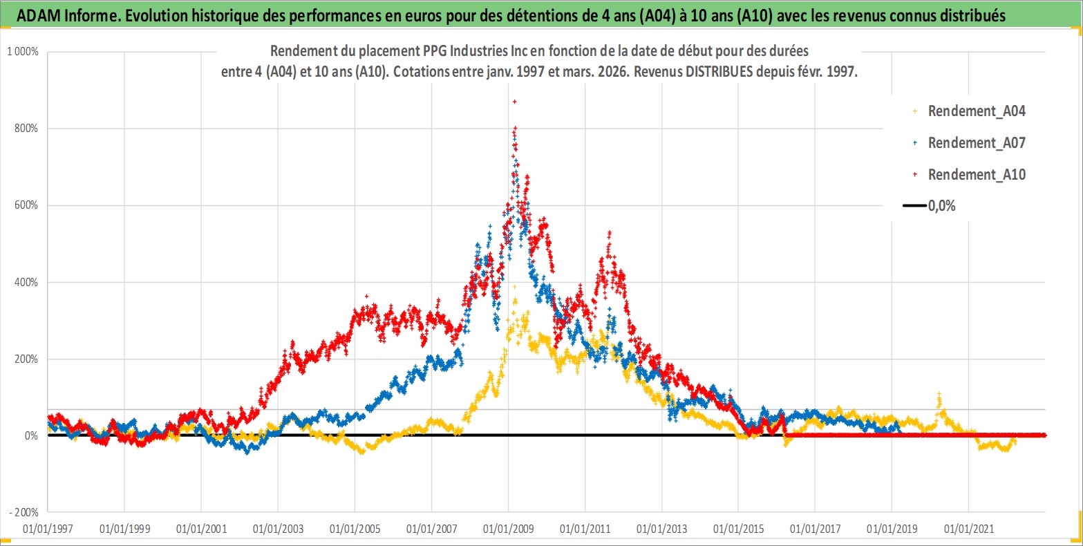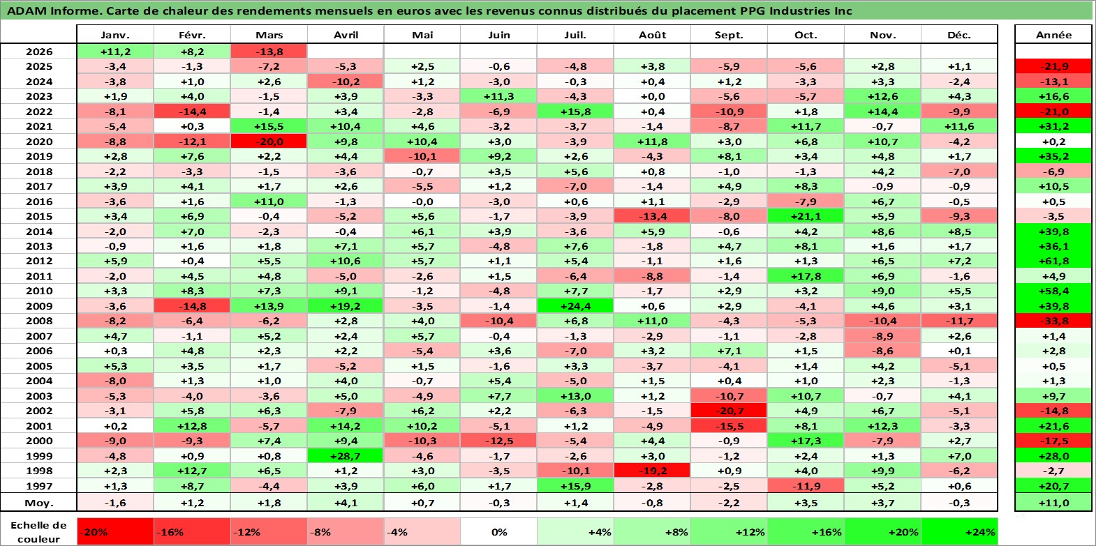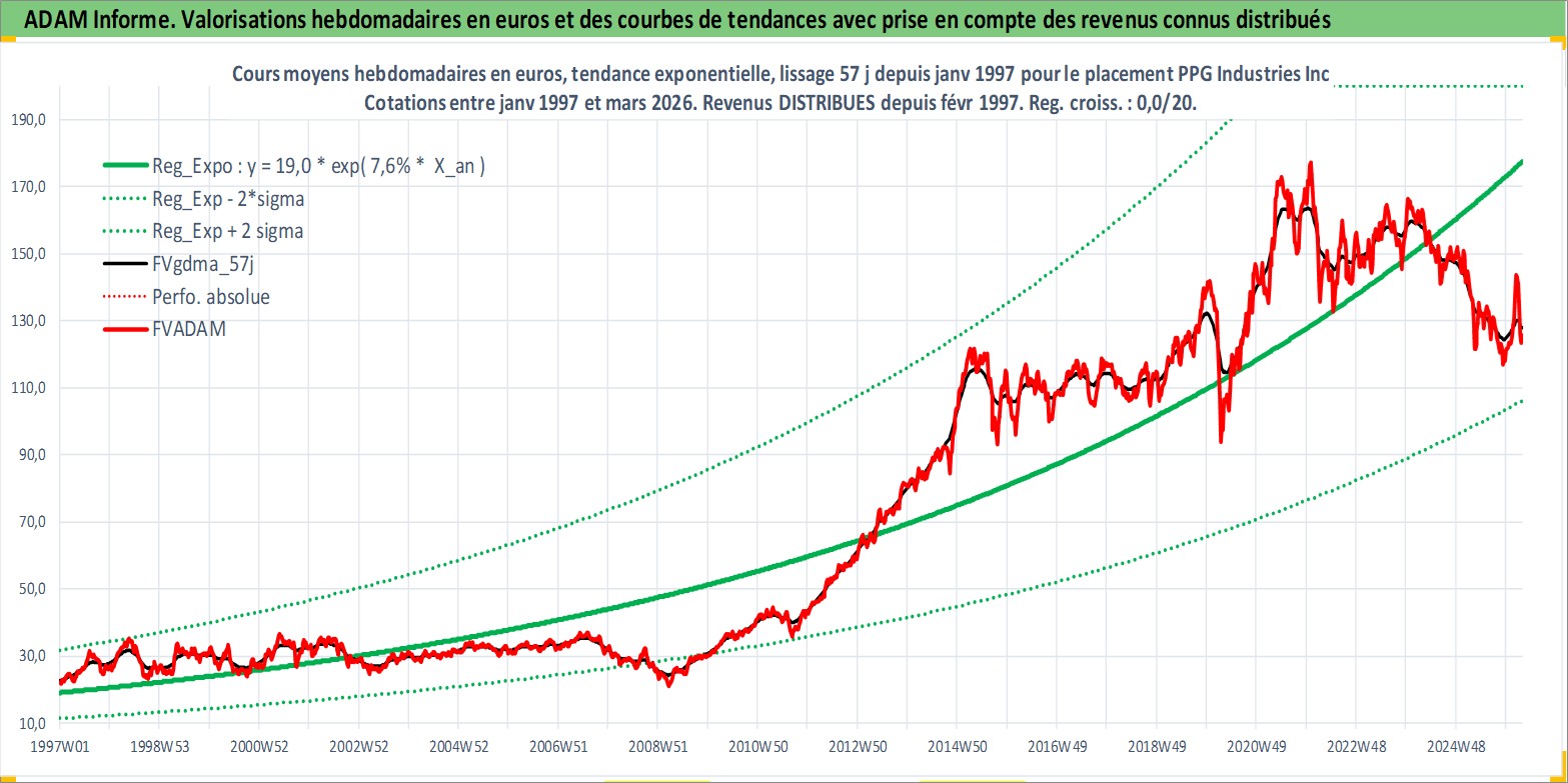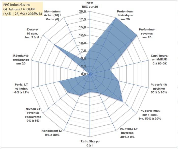 Site dédié aux investisseursPage dédiée sur site financeAnalyse des valorisations hebdomadaires de l'action PPG Industries Inc. Cet actif est cote en USD. Les valorisations sont en contrevaleur EURO et couvrent les semaines 1997W01 a 2026W13. Les revenus de cet actif financier sont pris en compte depuis la semaine 1997W07. La note globale ESG de cet actif est estimee a 8.0 (apres rebasage entre 0 et 20).