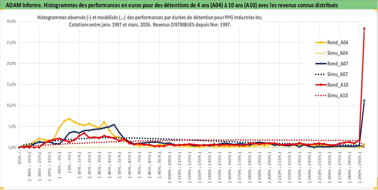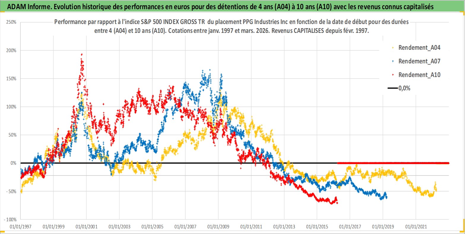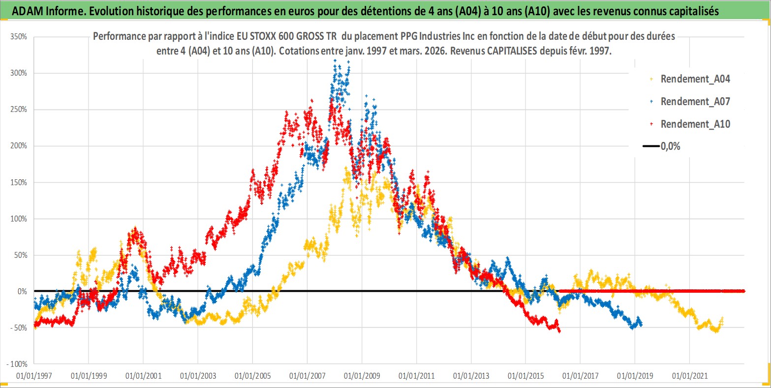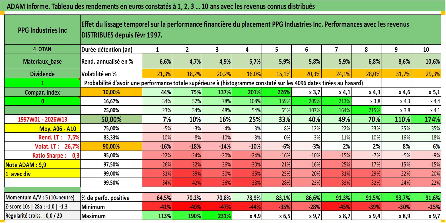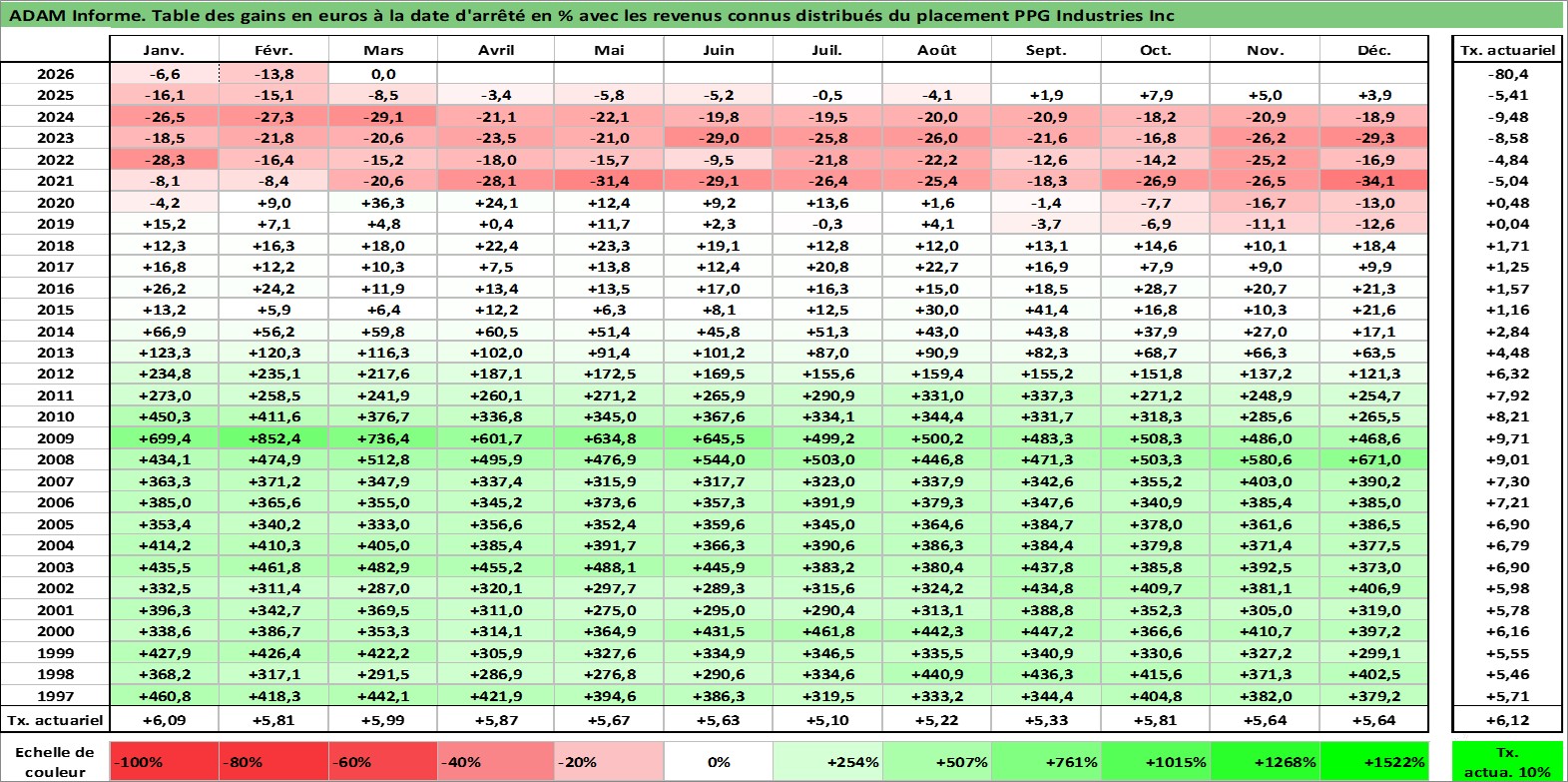 Site dédié aux investisseursPage dédiée sur site financeAnalyse des valorisations hebdomadaires de l'action PPG Industries Inc. Cet actif est cote en USD. Les valorisations sont en contrevaleur EURO et couvrent les semaines 1997W01 a 2026W13. Les revenus de cet actif financier sont pris en compte depuis la semaine 1997W07. La note globale ESG de cet actif est estimee a 8.0 (apres rebasage entre 0 et 20).