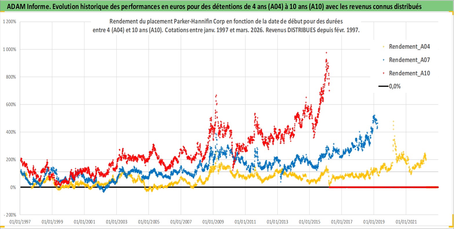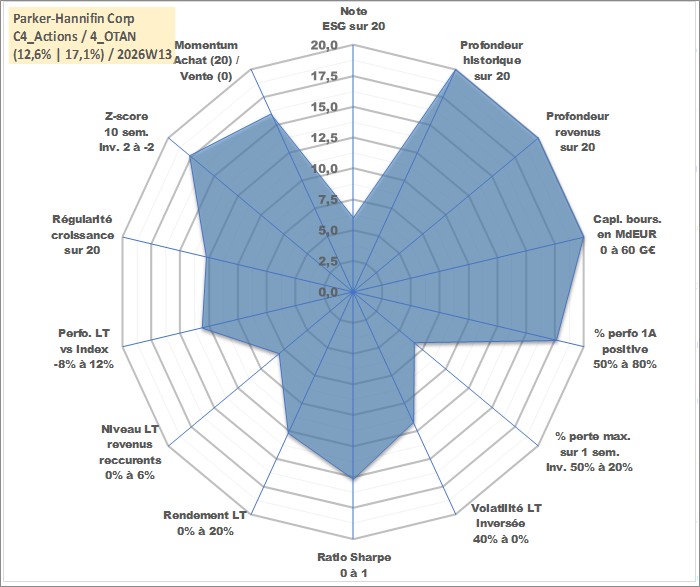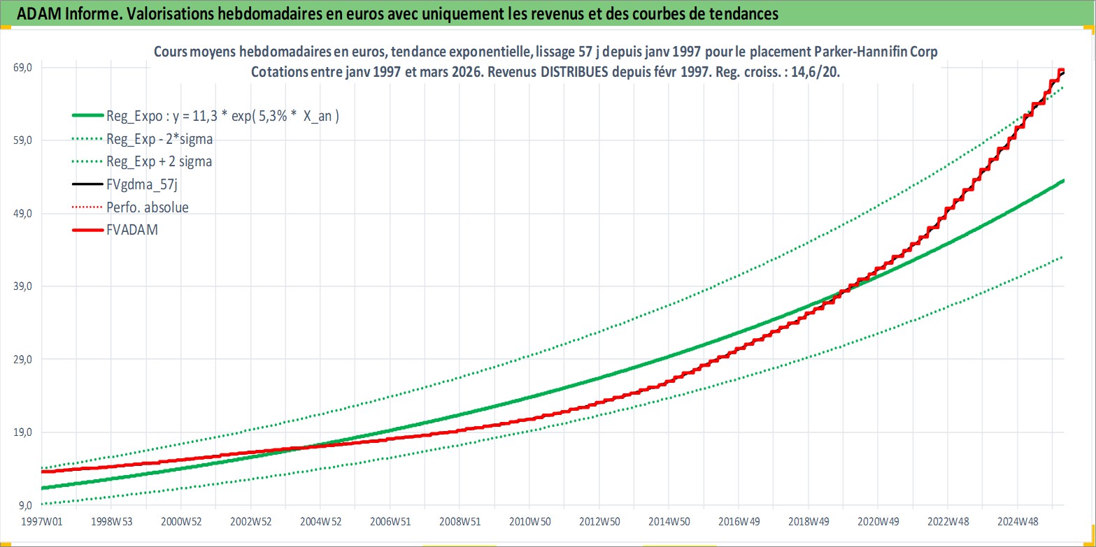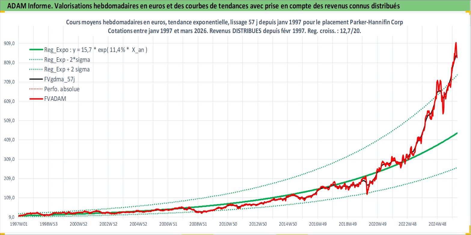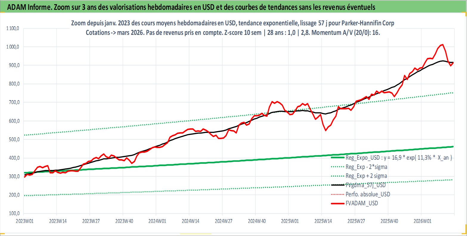 Site dédié aux investisseursPage dédiée sur site financeAnalyse des valorisations hebdomadaires de l'action Parker-Hannifin Corp. Cet actif est cote en USD. Les valorisations sont en contrevaleur EURO et couvrent les semaines 1997W01 a 2026W13. Les revenus de cet actif financier sont pris en compte depuis la semaine 1997W08. La note globale ESG de cet actif est estimee a 6.0 (apres rebasage entre 0 et 20).