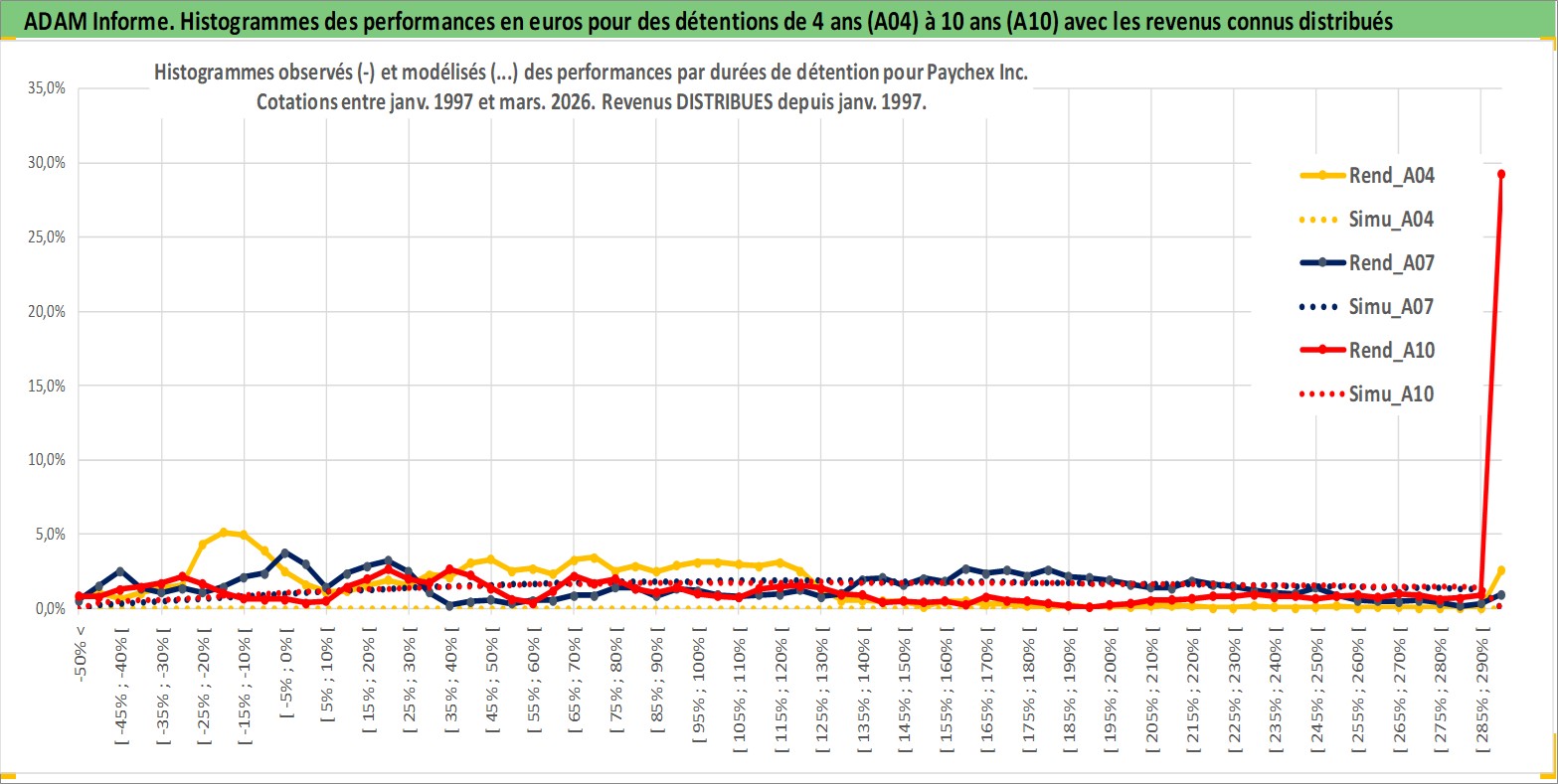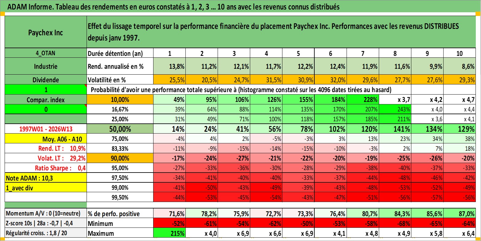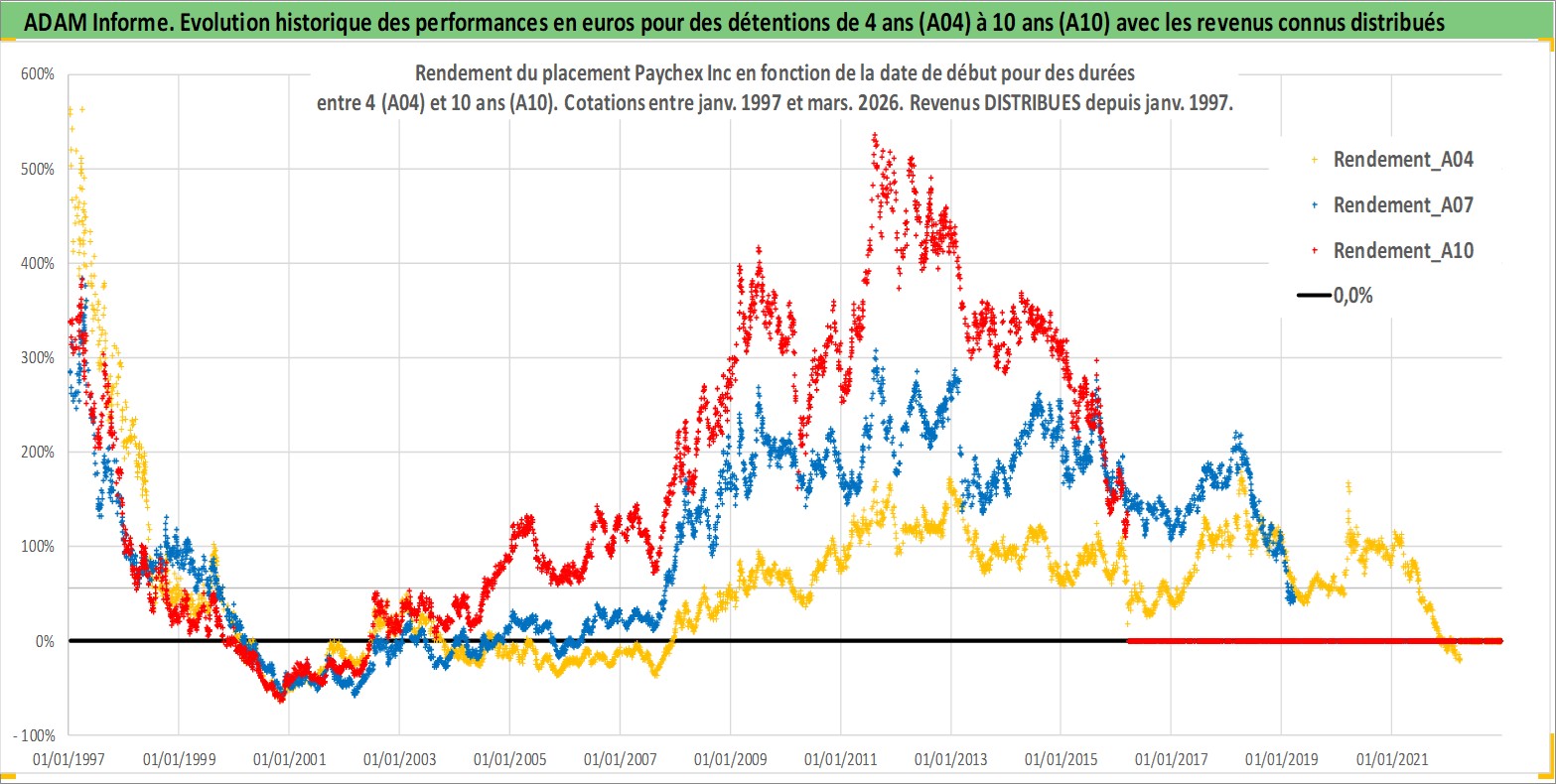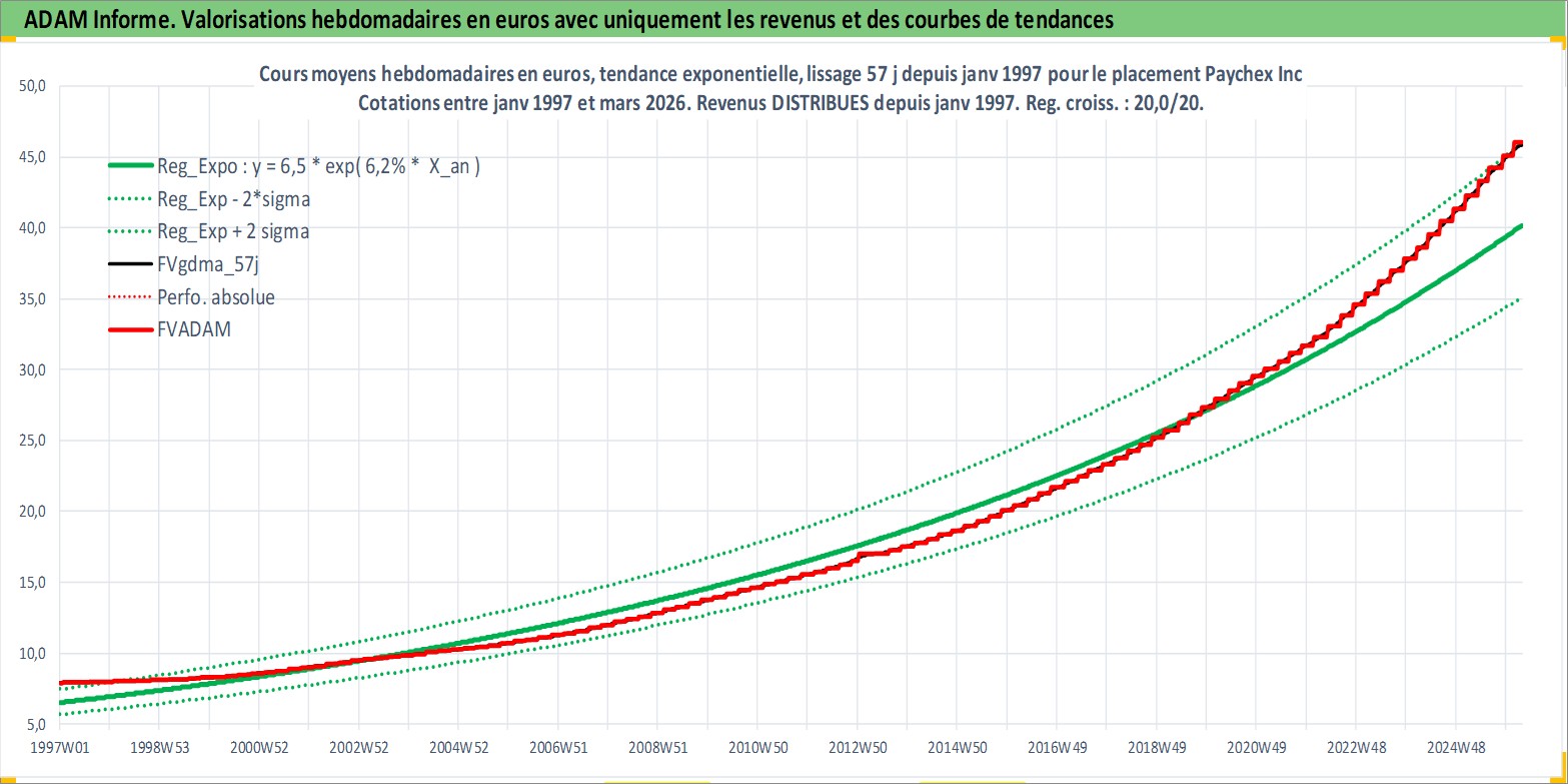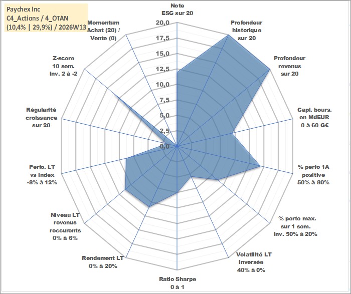 Site dédié aux investisseursPage dédiée sur site financeAnalyse des valorisations hebdomadaires de l'action Paychex Inc. Cet actif est cote en USD. Les valorisations sont en contrevaleur EURO et couvrent les semaines 1997W01 a 2026W13. Les revenus de cet actif financier sont pris en compte depuis la semaine 1997W05. La note globale ESG de cet actif est estimee a 12.0 (apres rebasage entre 0 et 20).