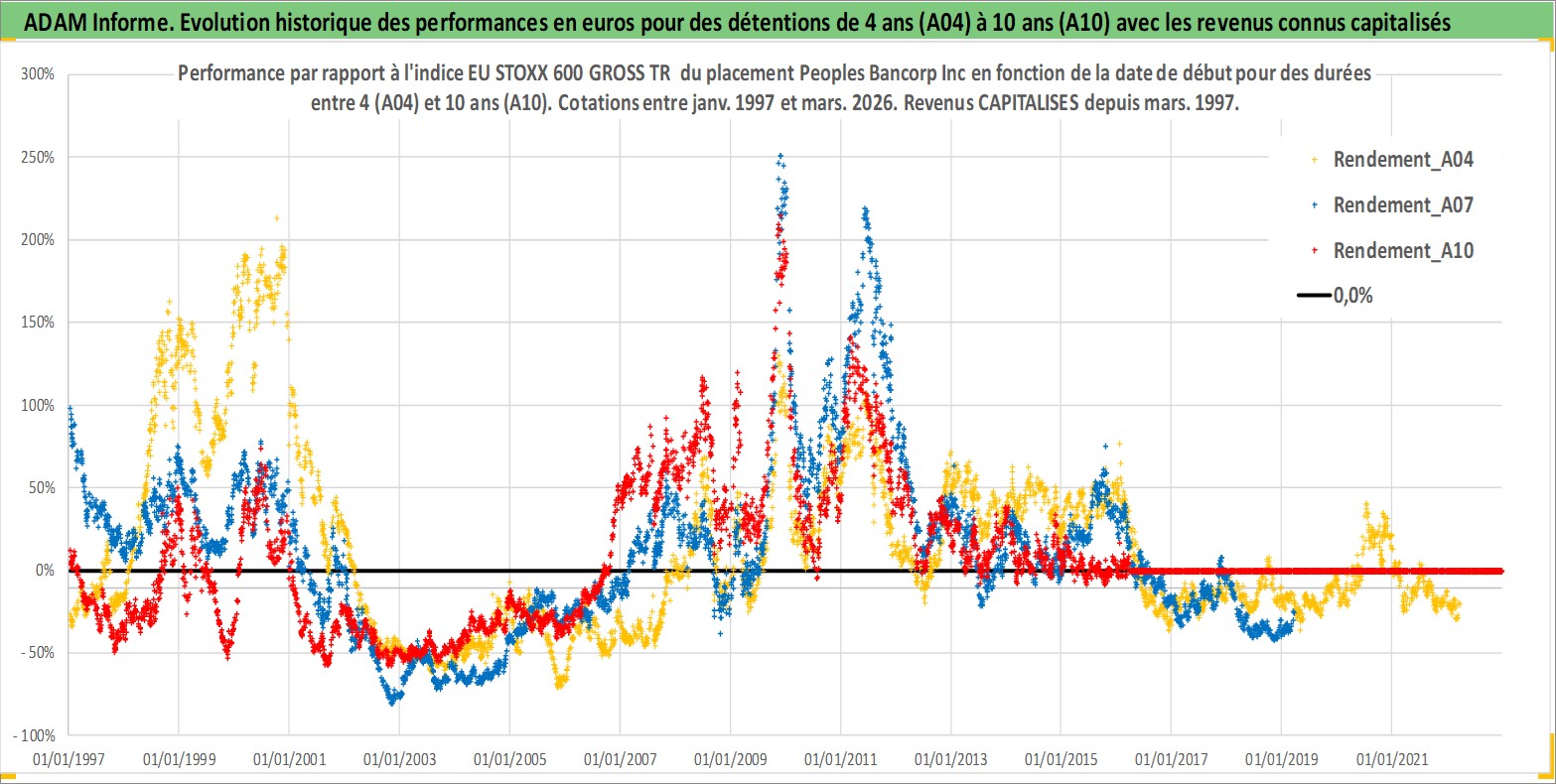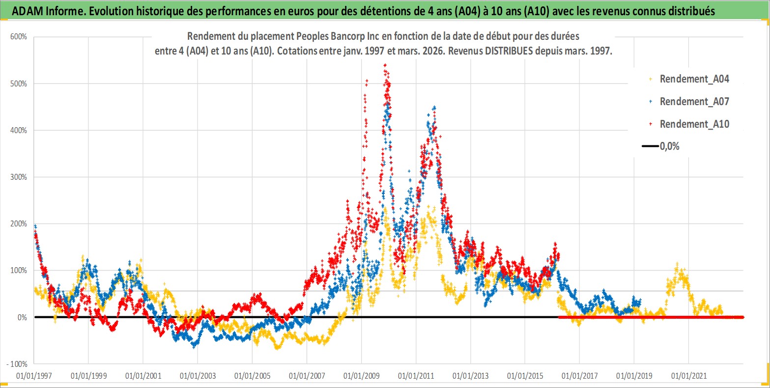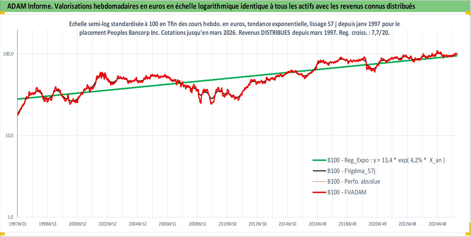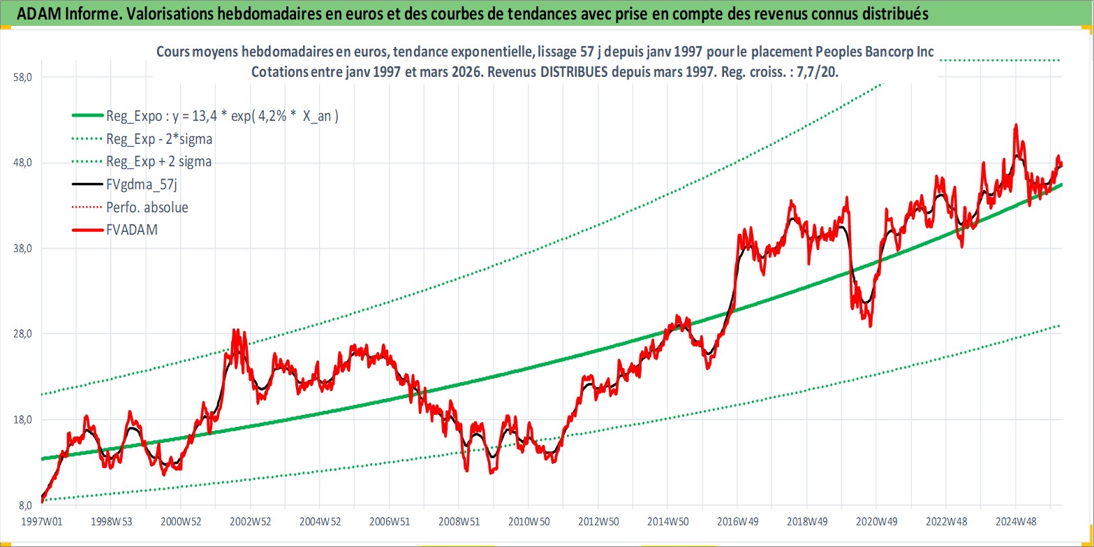Site dédié aux investisseursPage dédiée sur site financeAnalyse des valorisations hebdomadaires de l'action Peoples Bancorp Inc. Cet actif est cote en USD. Les valorisations sont en contrevaleur EURO et couvrent les semaines 1997W01 a 2026W13. Les revenus de cet actif financier sont pris en compte depuis la semaine 1997W11. La note ESG de cet actif n'est pas connue.