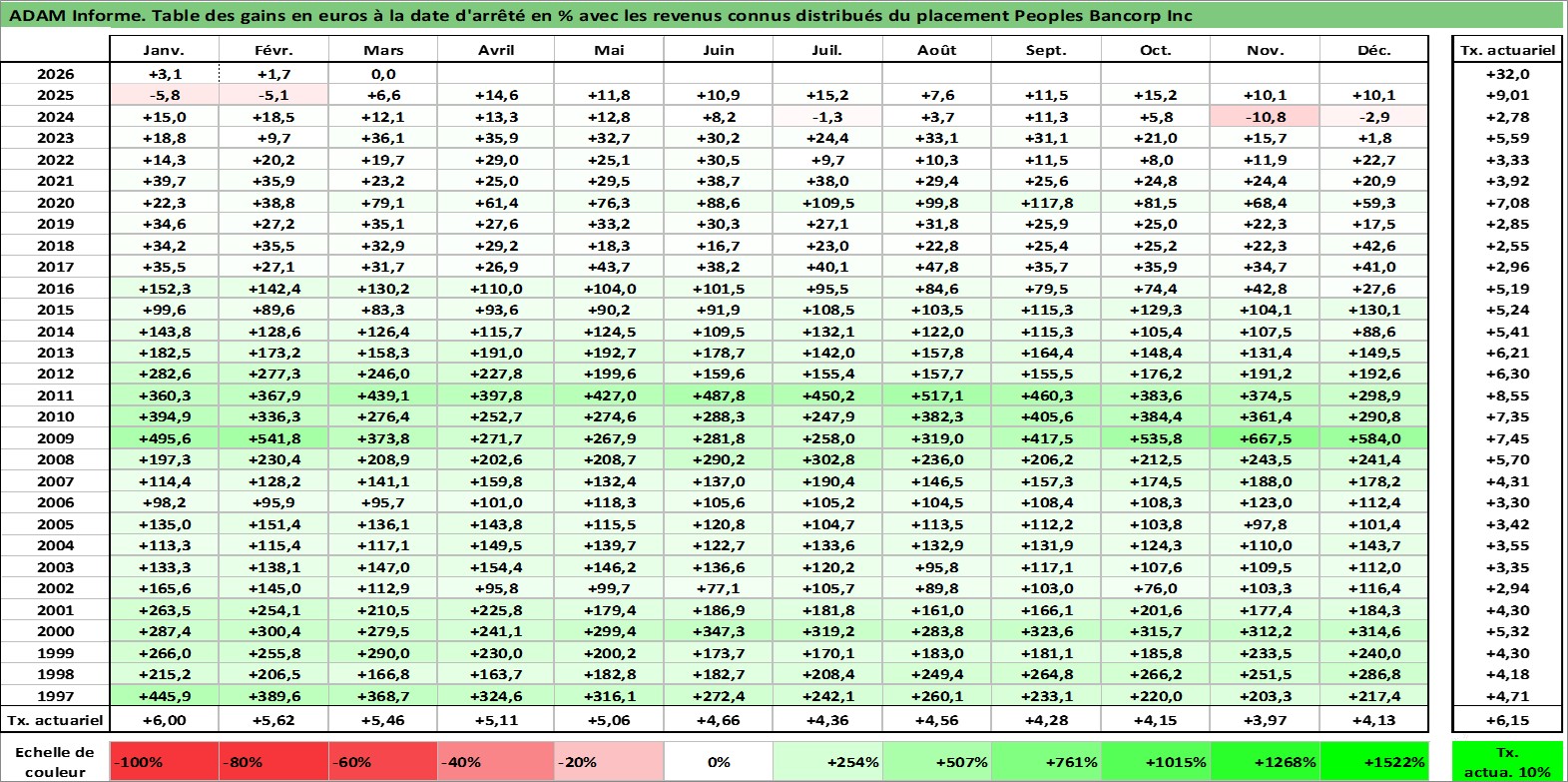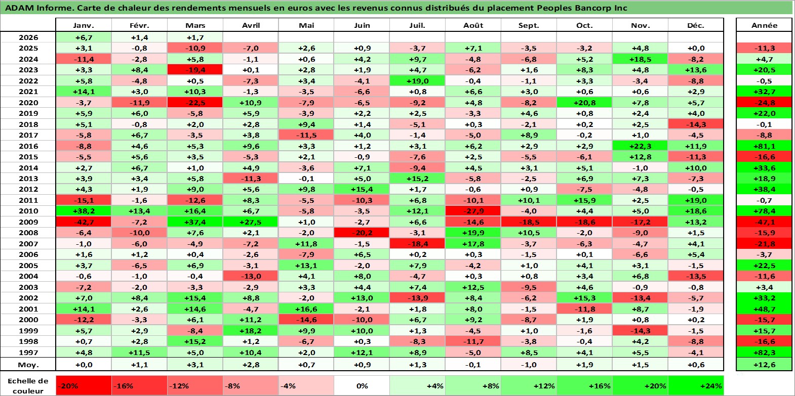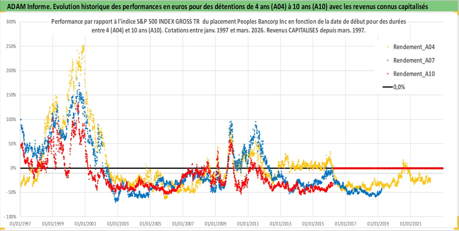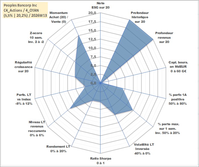 Site dédié aux investisseursPage dédiée sur site financeAnalyse des valorisations hebdomadaires de l'action Peoples Bancorp Inc. Cet actif est cote en USD. Les valorisations sont en contrevaleur EURO et couvrent les semaines 1997W01 a 2026W13. Les revenus de cet actif financier sont pris en compte depuis la semaine 1997W11. La note ESG de cet actif n'est pas connue.