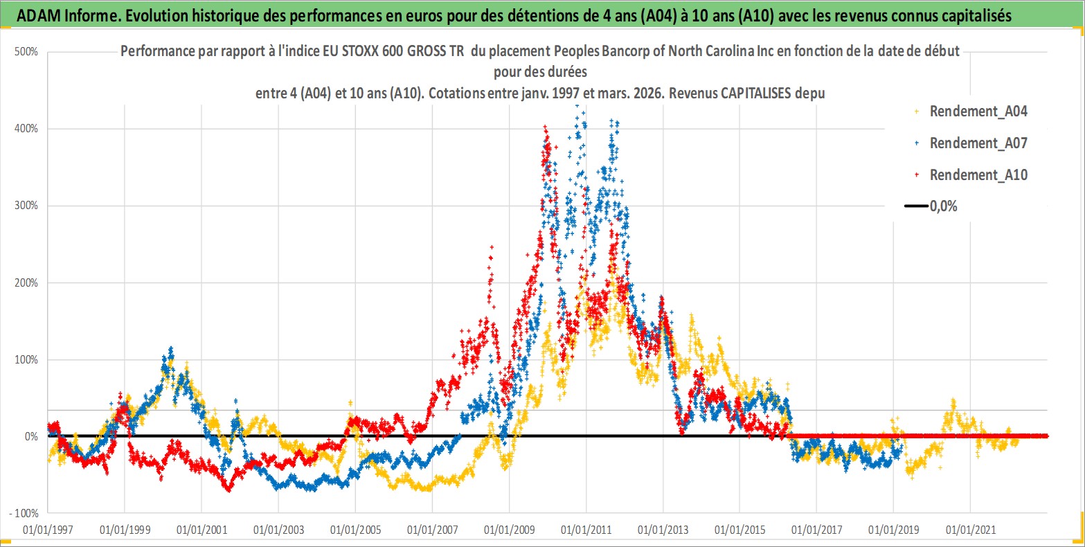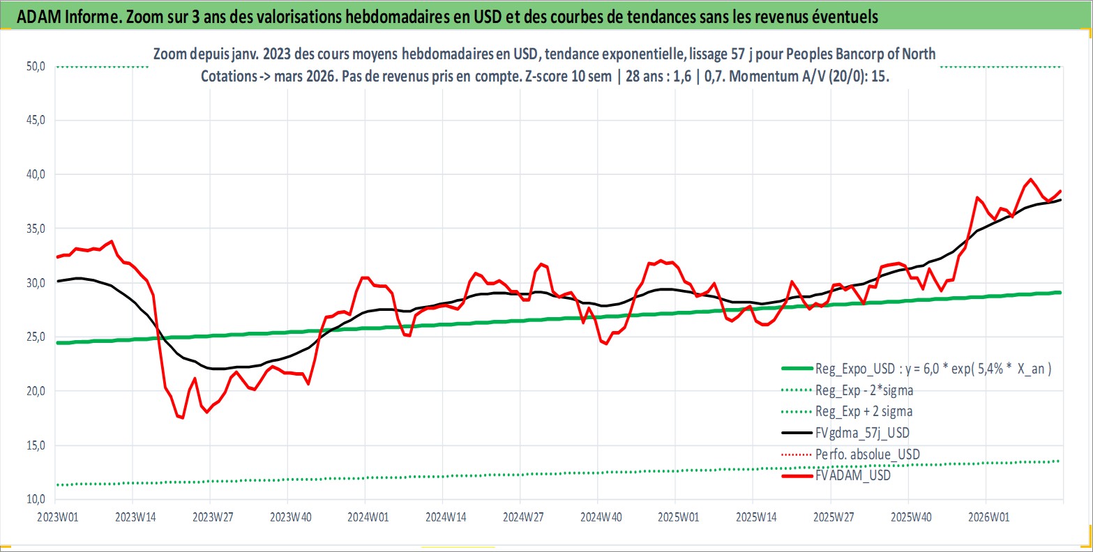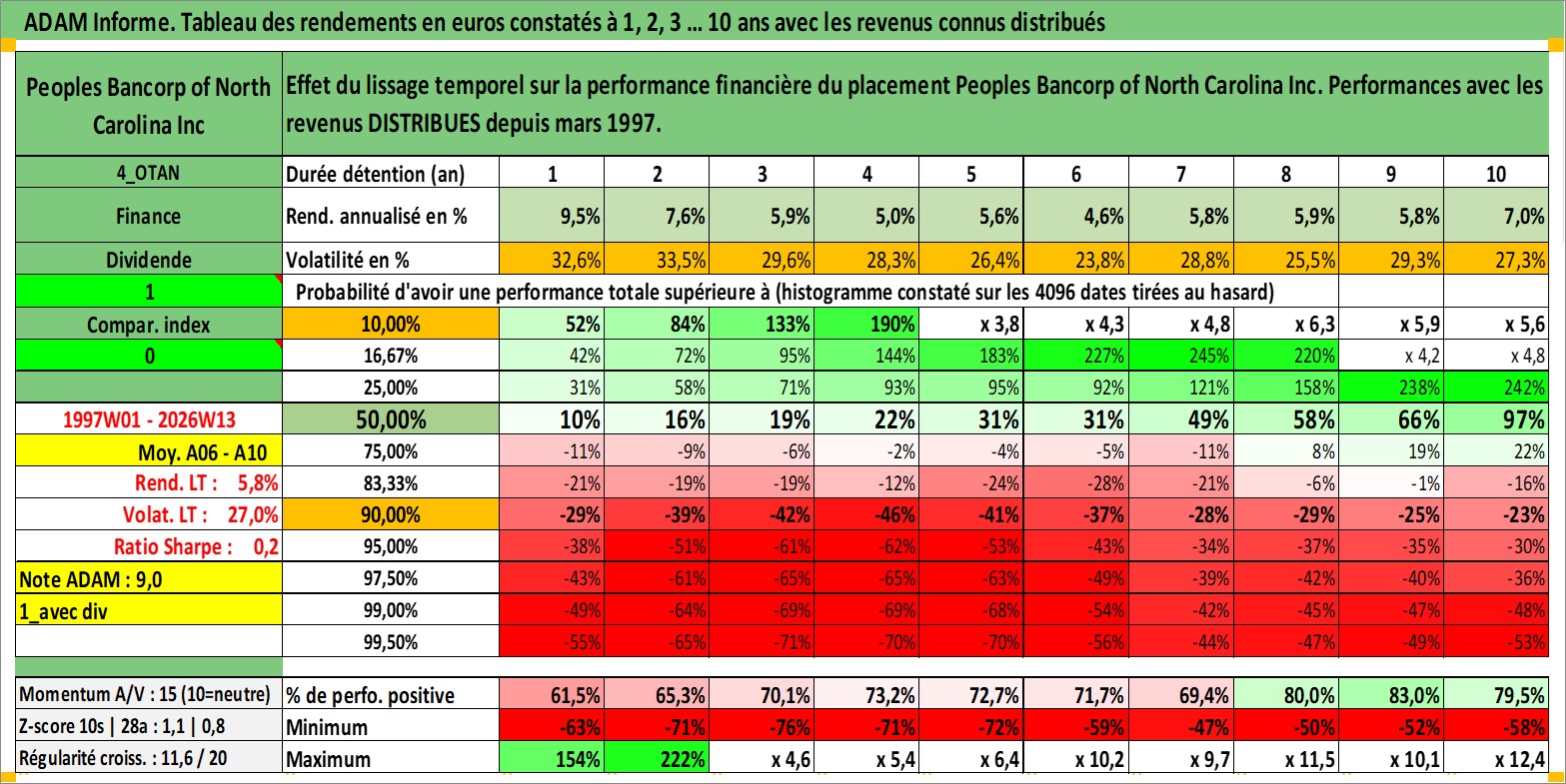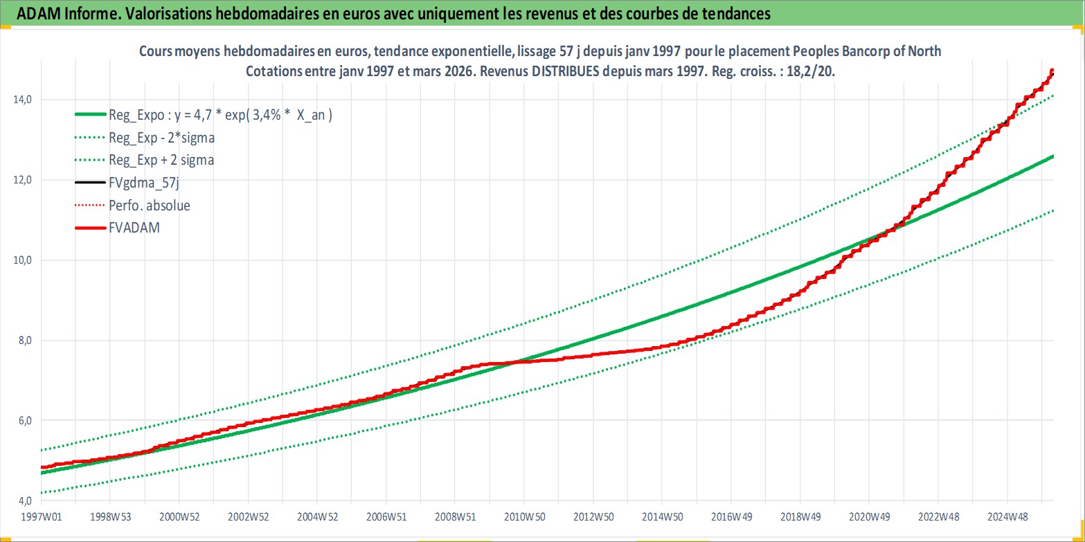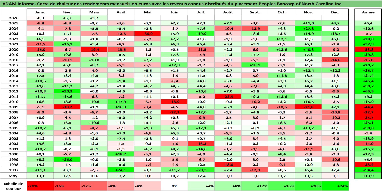 Site dédié aux investisseursPage dédiée sur site financeAnalyse des valorisations hebdomadaires de l'action Peoples Bancorp of North Carolina Inc. Cet actif est cote en USD. Les valorisations sont en contrevaleur EURO et couvrent les semaines 1997W01 a 2026W13. Les revenus de cet actif financier sont pris en compte depuis la semaine 1997W11. La note ESG de cet actif n'est pas connue.