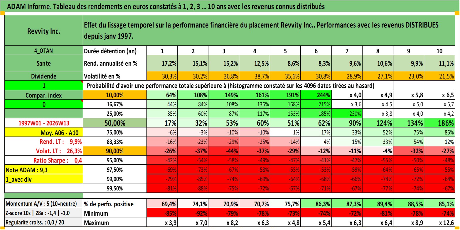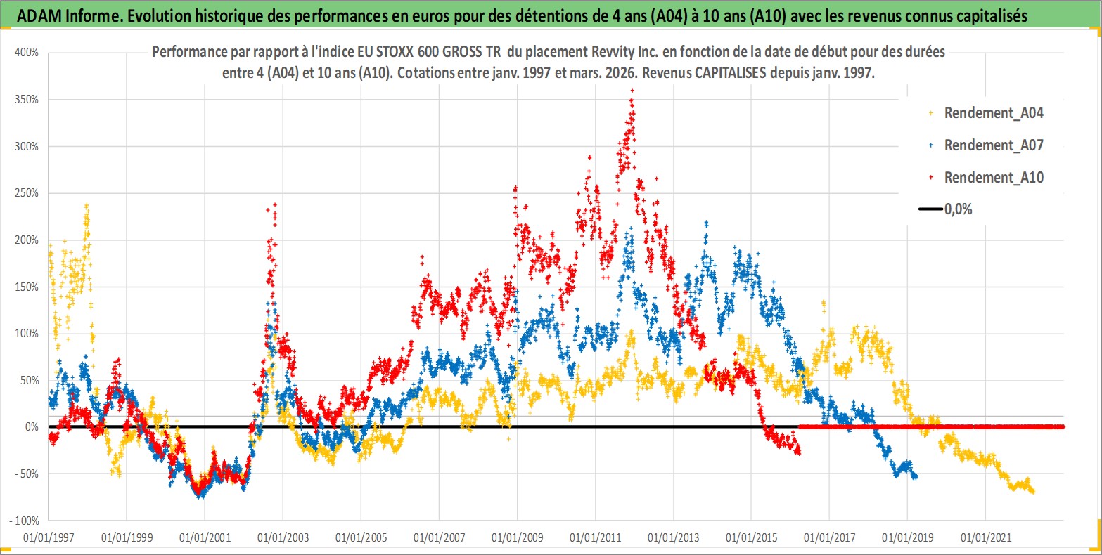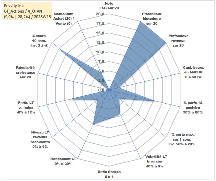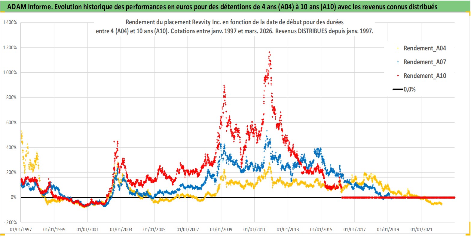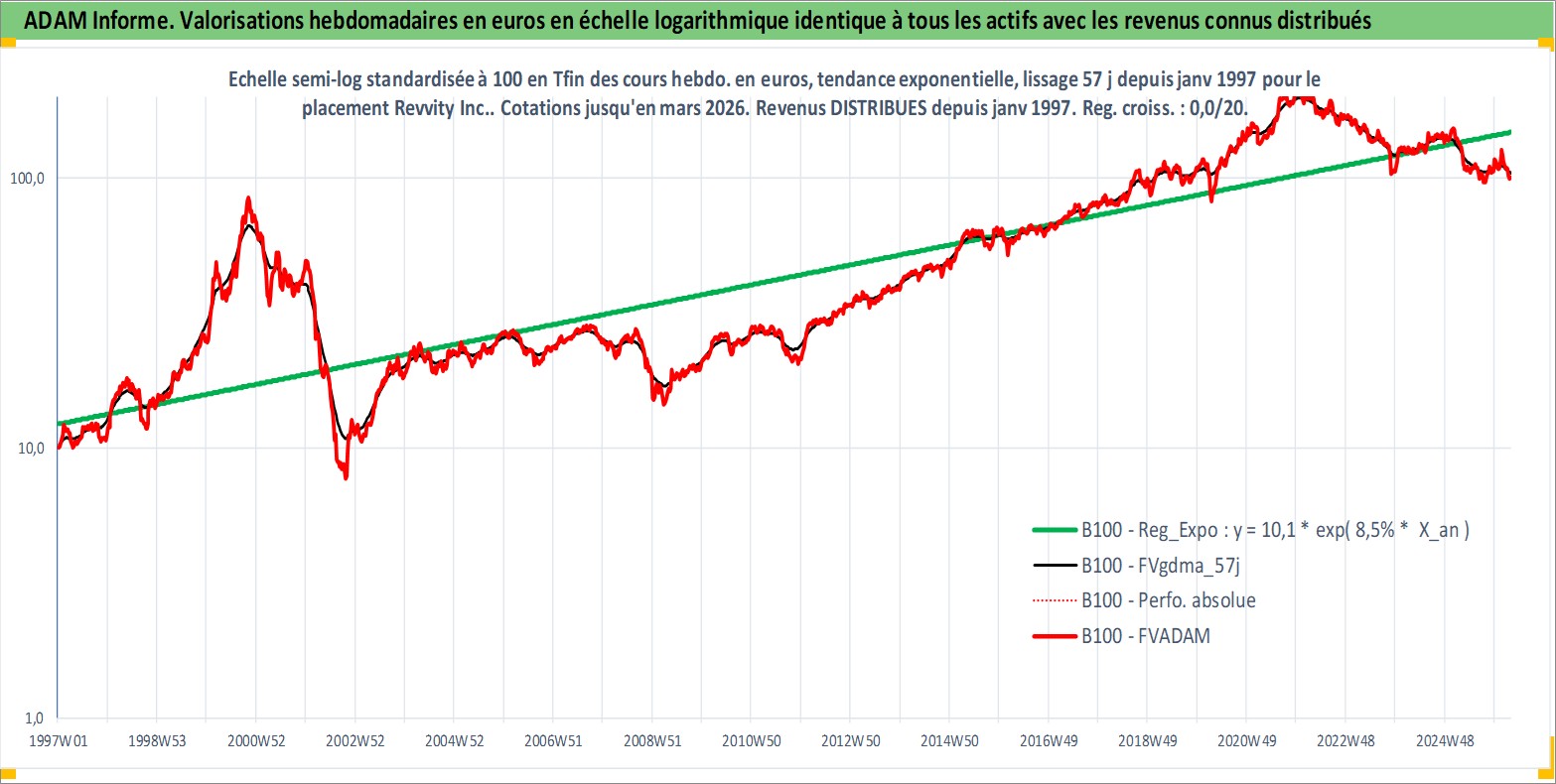 Site dédié aux investisseursPage dédiée sur site financeAnalyse des valorisations hebdomadaires de l'action Revvity Inc.. Cet actif est cote en USD. Les valorisations sont en contrevaleur EURO et couvrent les semaines 1997W01 a 2026W13. Les revenus de cet actif financier sont pris en compte depuis la semaine 1997W03. La note ESG de cet actif n'est pas connue.