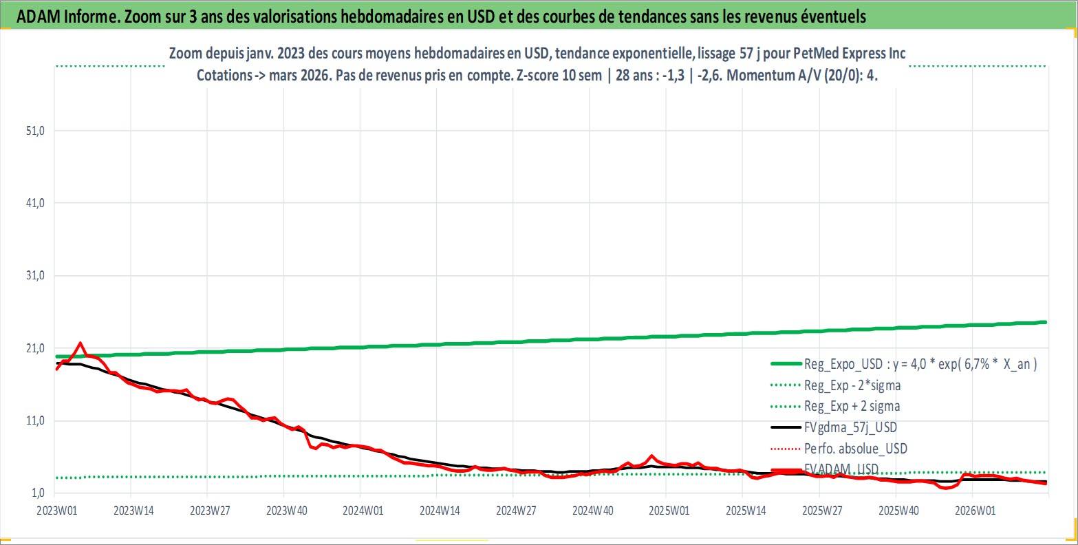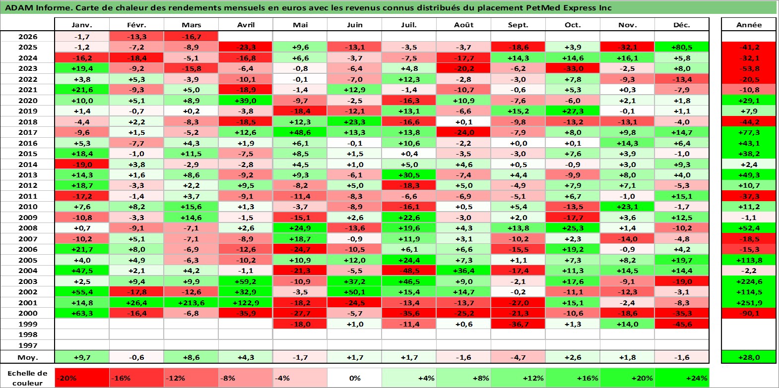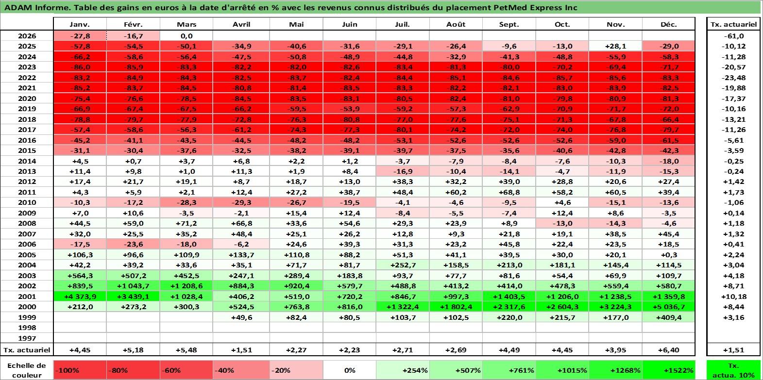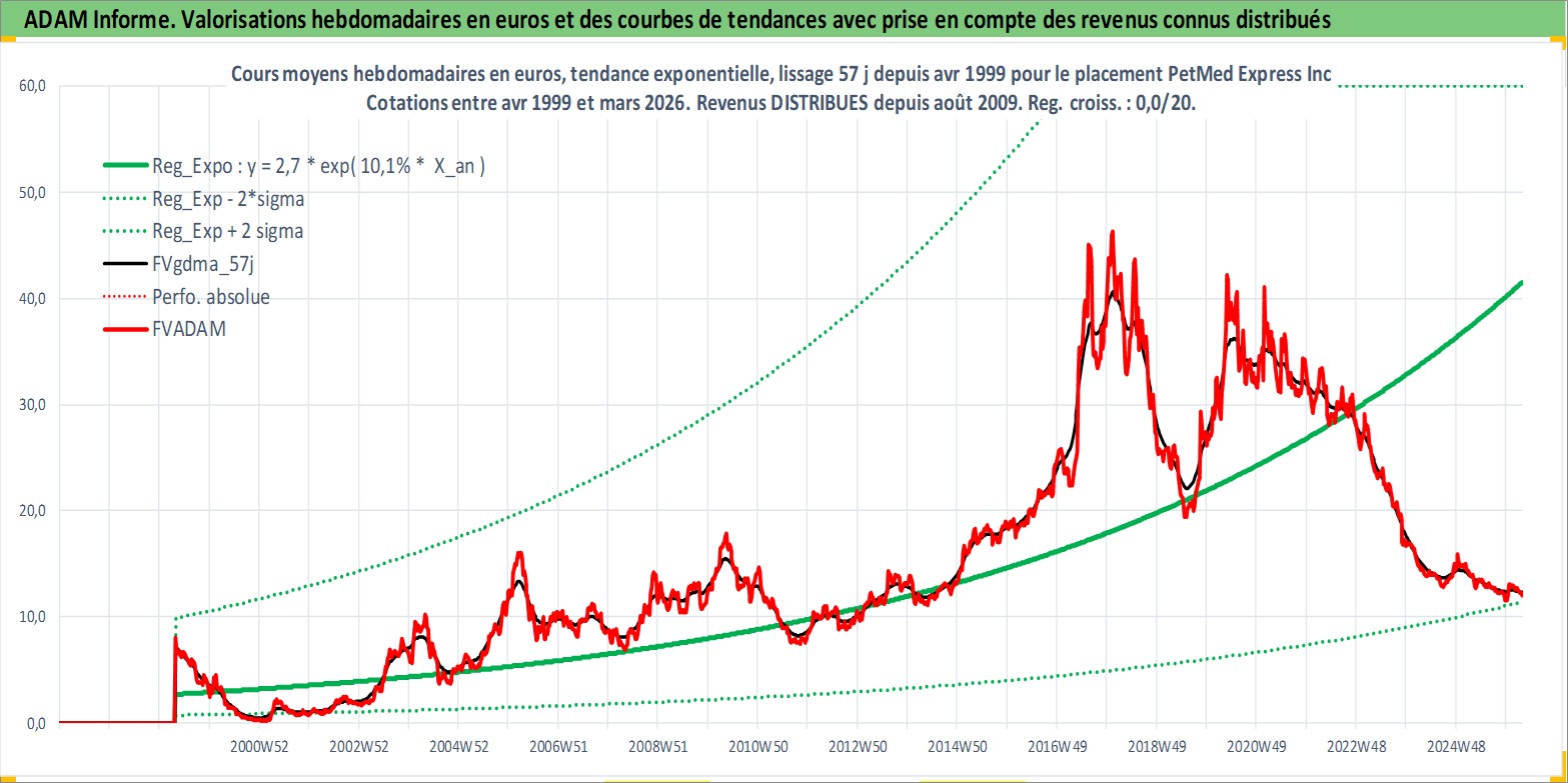 Site dédié aux investisseursPage dédiée sur site financeAnalyse des valorisations hebdomadaires de l'action PetMed Express Inc. Cet actif est cote en USD. Les valorisations sont en contrevaleur EURO et couvrent les semaines 1999W17 a 2026W13. Les revenus de cet actif financier sont pris en compte depuis la semaine 2009W33. La note ESG de cet actif n'est pas connue.