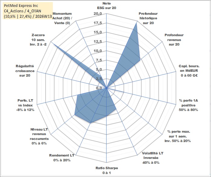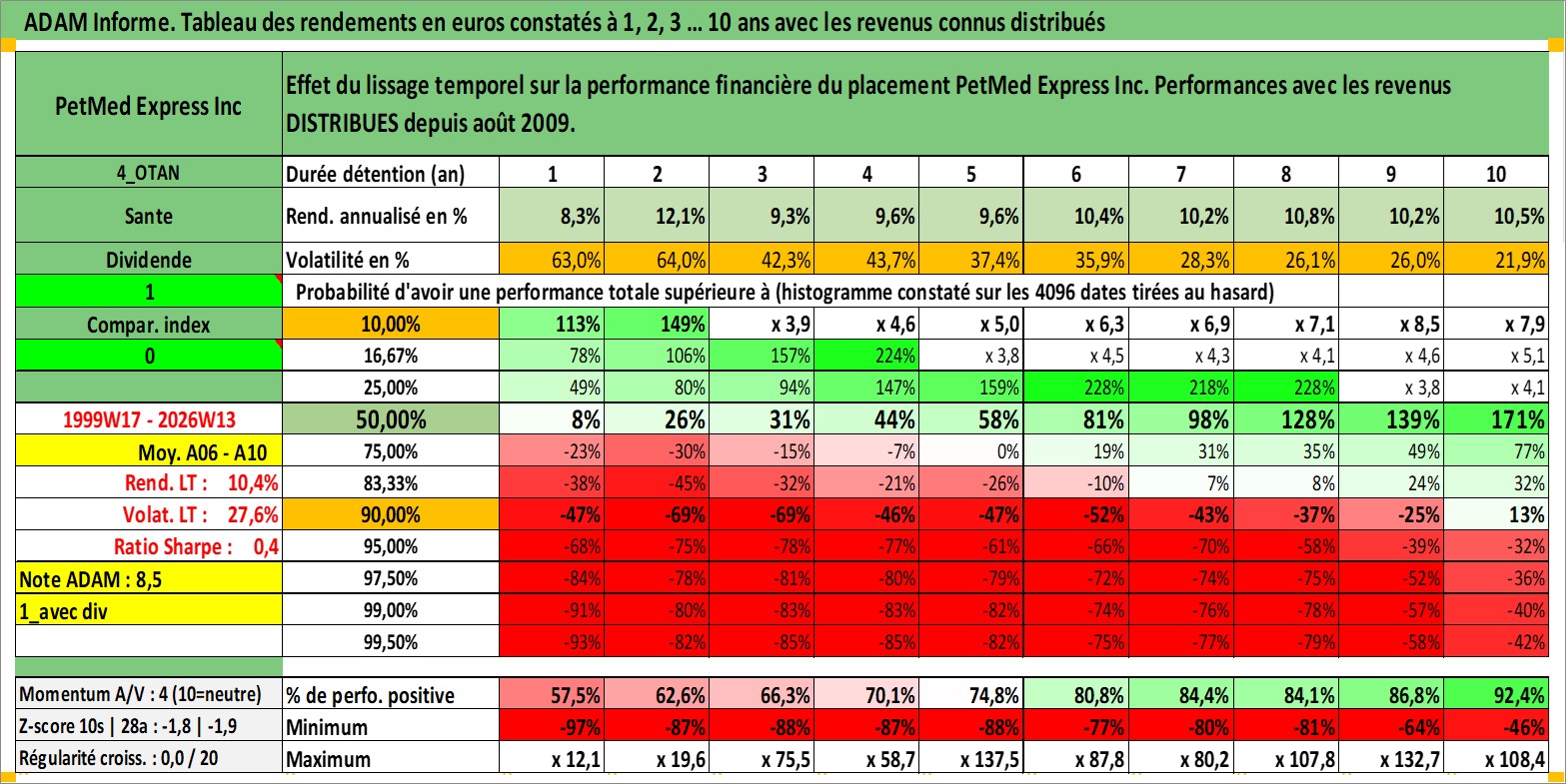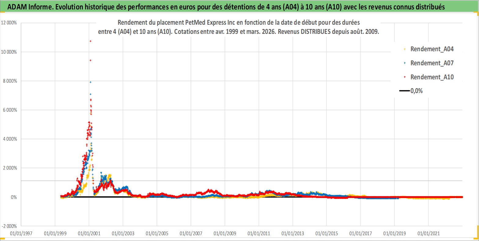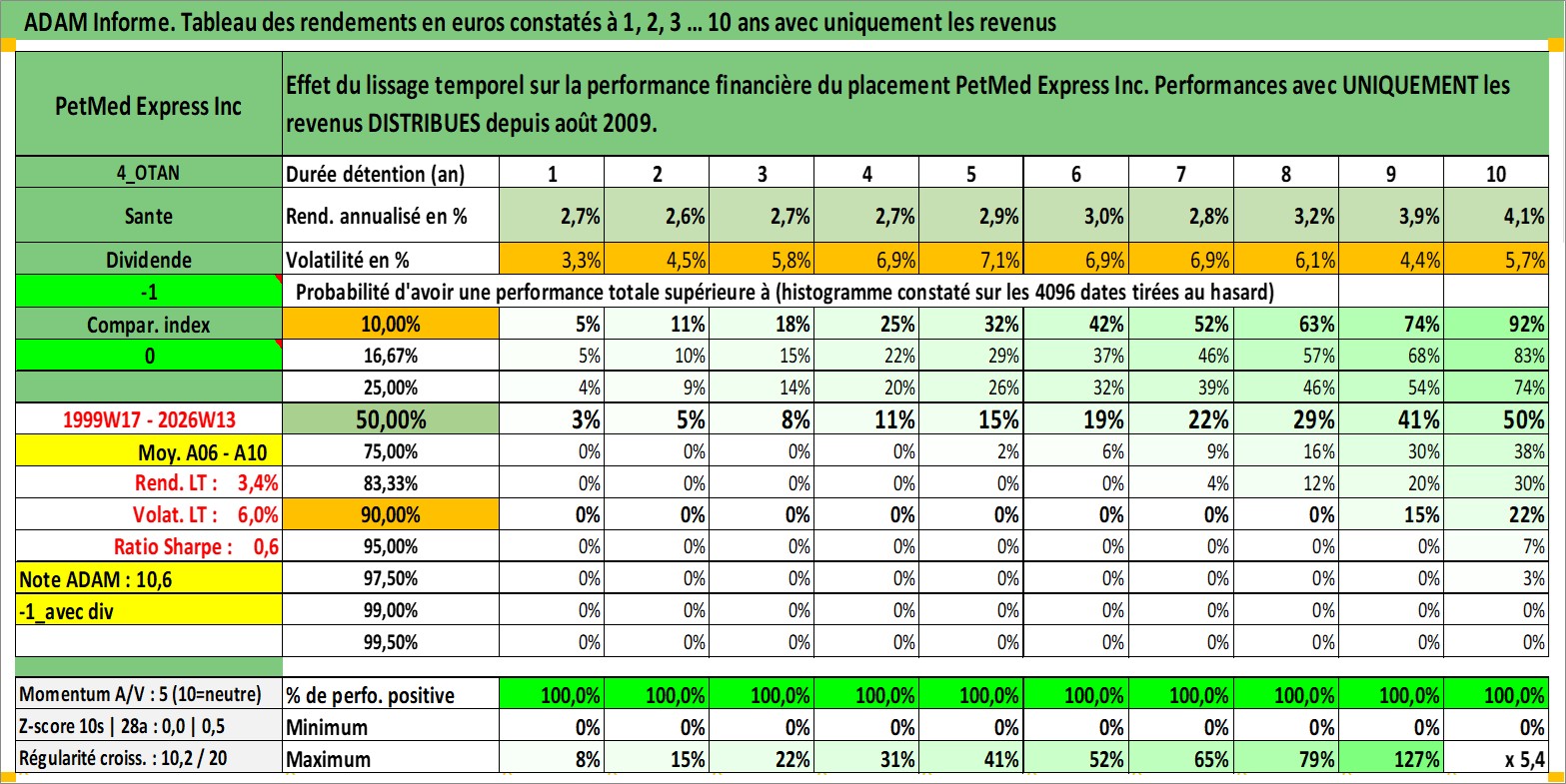 Site dédié aux investisseursPage dédiée sur site financeAnalyse des valorisations hebdomadaires de l'action PetMed Express Inc. Cet actif est cote en USD. Les valorisations sont en contrevaleur EURO et couvrent les semaines 1999W17 a 2026W13. Les revenus de cet actif financier sont pris en compte depuis la semaine 2009W33. La note ESG de cet actif n'est pas connue.