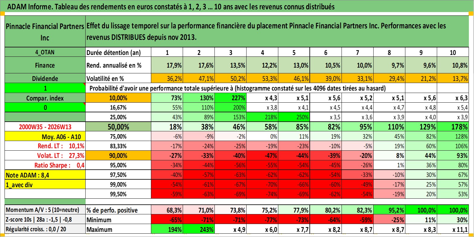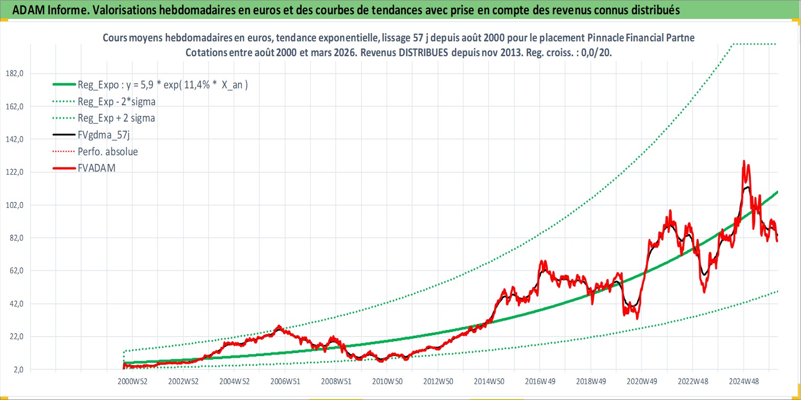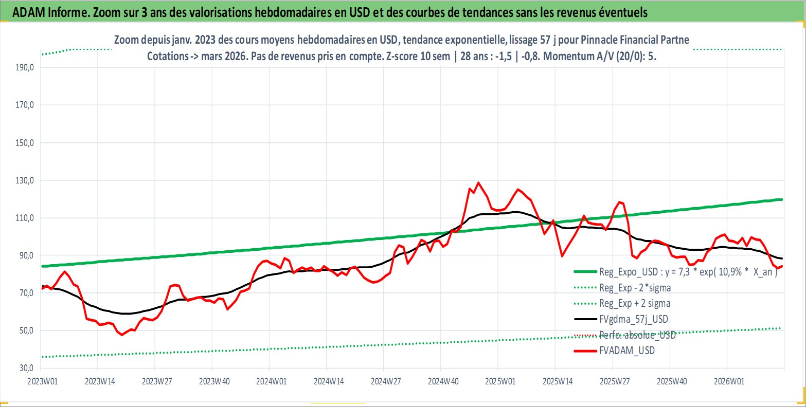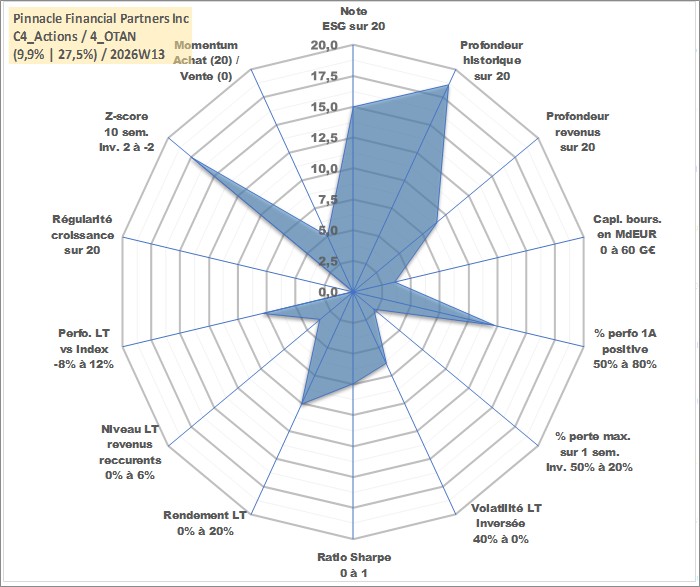 Site dédié aux investisseursPage dédiée sur site financeAnalyse des valorisations hebdomadaires de l'action Pinnacle Financial Partners Inc. Cet actif est cote en USD. Les valorisations sont en contrevaleur EURO et couvrent les semaines 2000W35 a 2026W13. Les revenus de cet actif financier sont pris en compte depuis la semaine 2013W47. La note globale ESG de cet actif est estimee a 15.0 (apres rebasage entre 0 et 20).