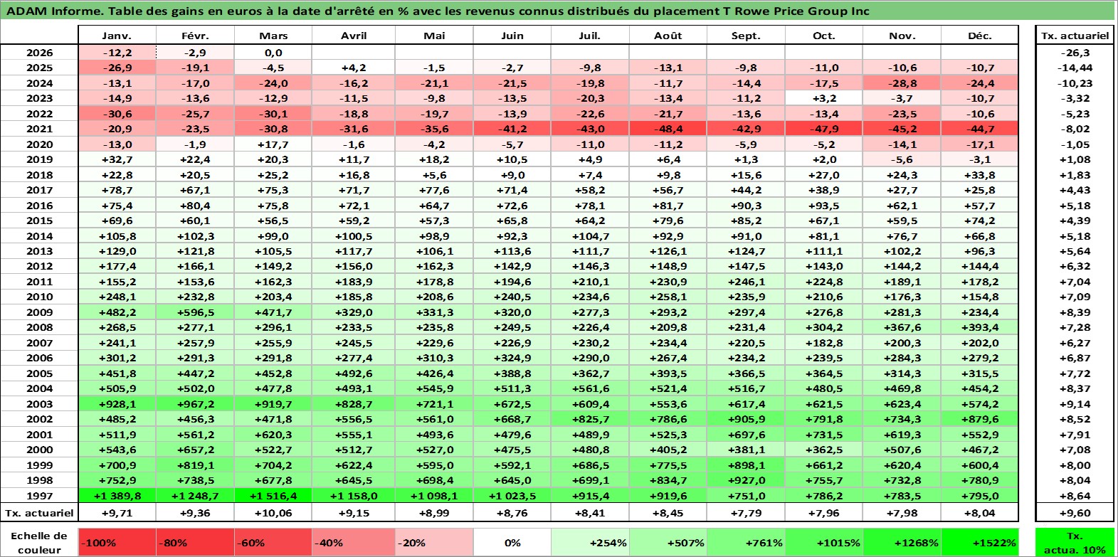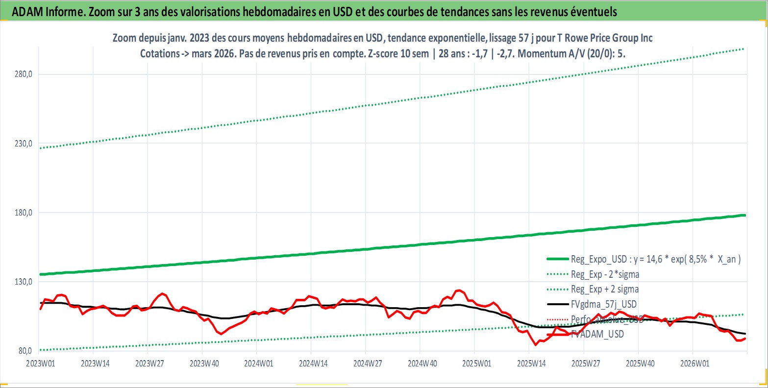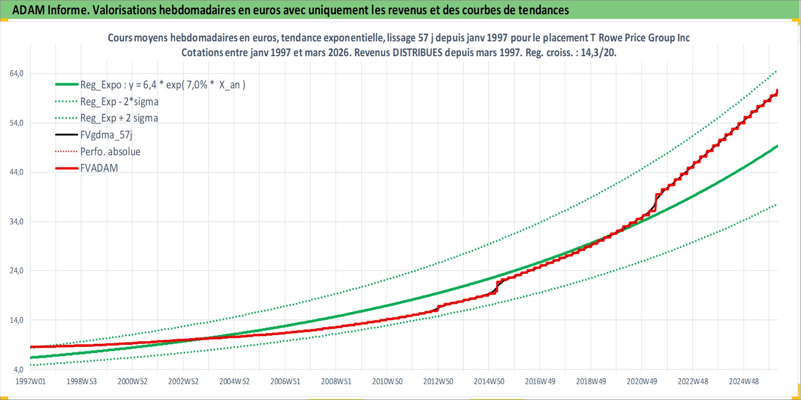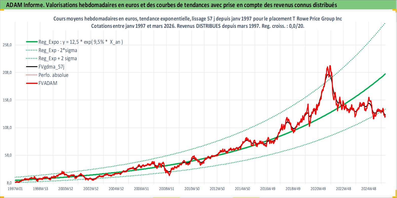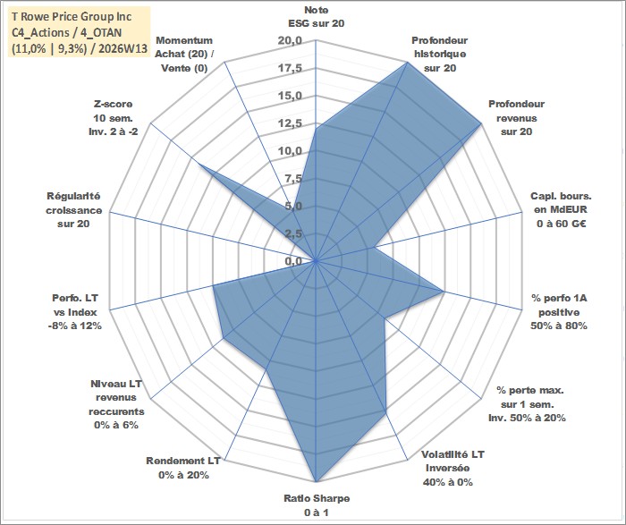 Site dédié aux investisseursPage dédiée sur site financeAnalyse des valorisations hebdomadaires de l'action T Rowe Price Group Inc. Cet actif est cote en USD. Les valorisations sont en contrevaleur EURO et couvrent les semaines 1997W01 a 2026W13. Les revenus de cet actif financier sont pris en compte depuis la semaine 1997W12. La note globale ESG de cet actif est estimee a 12.0 (apres rebasage entre 0 et 20).