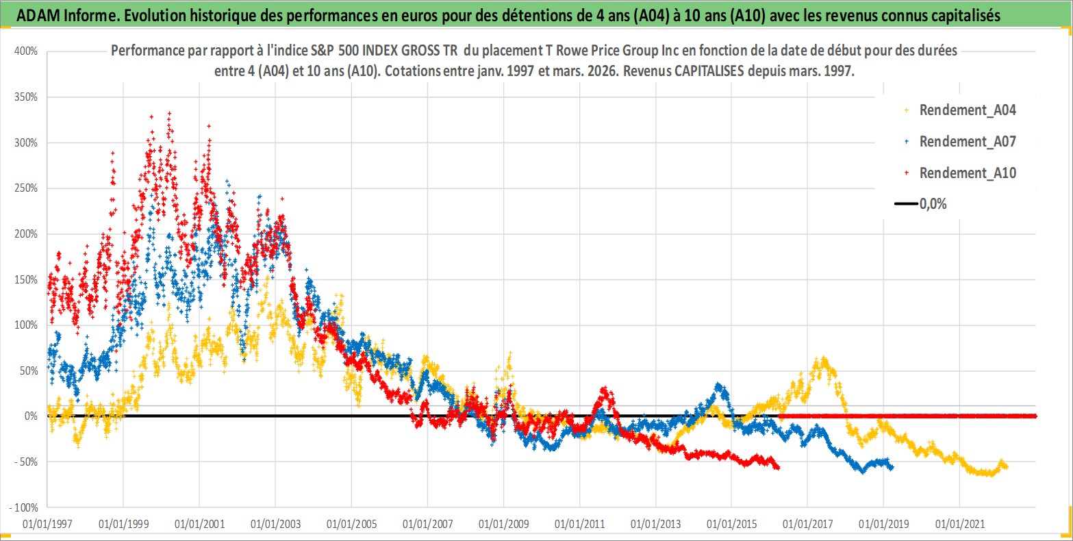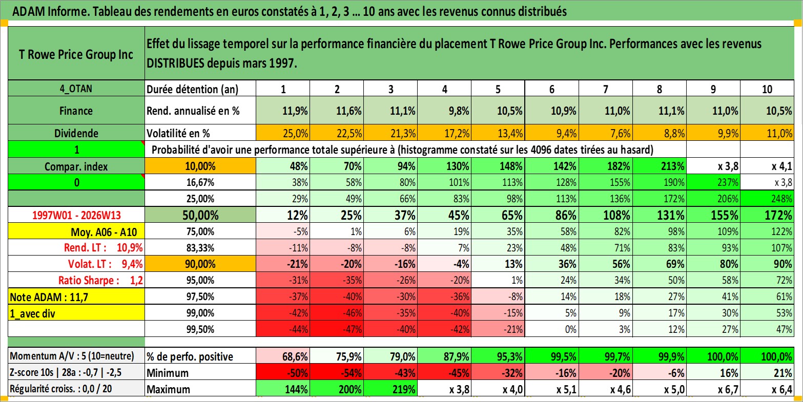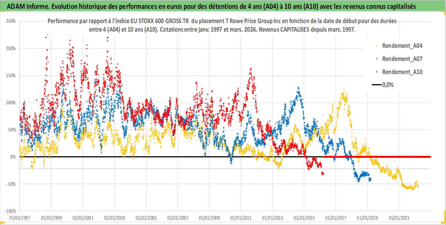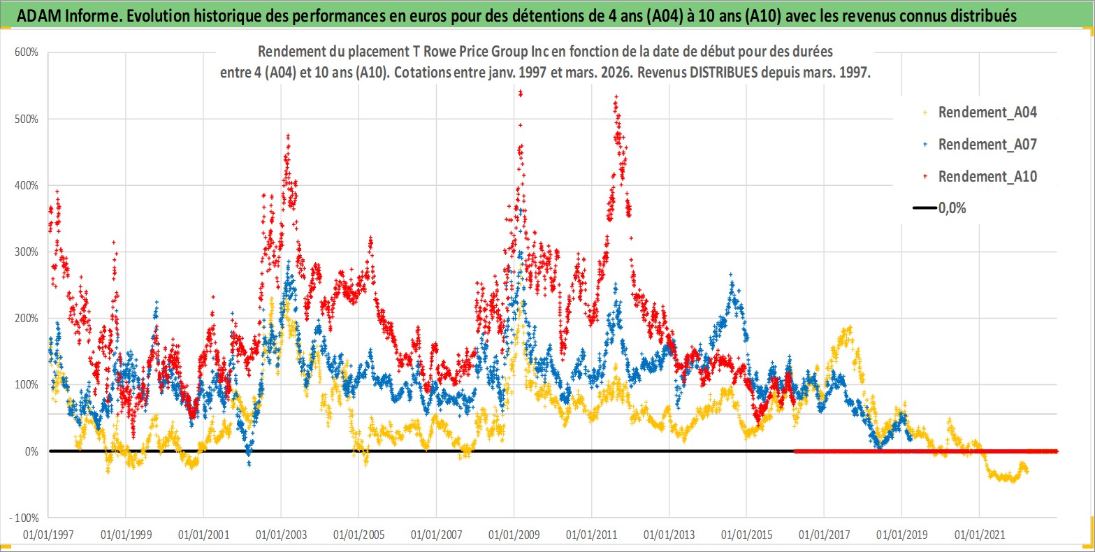 Site dédié aux investisseursPage dédiée sur site financeAnalyse des valorisations hebdomadaires de l'action T Rowe Price Group Inc. Cet actif est cote en USD. Les valorisations sont en contrevaleur EURO et couvrent les semaines 1997W01 a 2026W13. Les revenus de cet actif financier sont pris en compte depuis la semaine 1997W12. La note globale ESG de cet actif est estimee a 12.0 (apres rebasage entre 0 et 20).