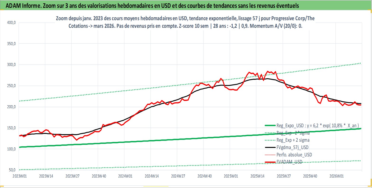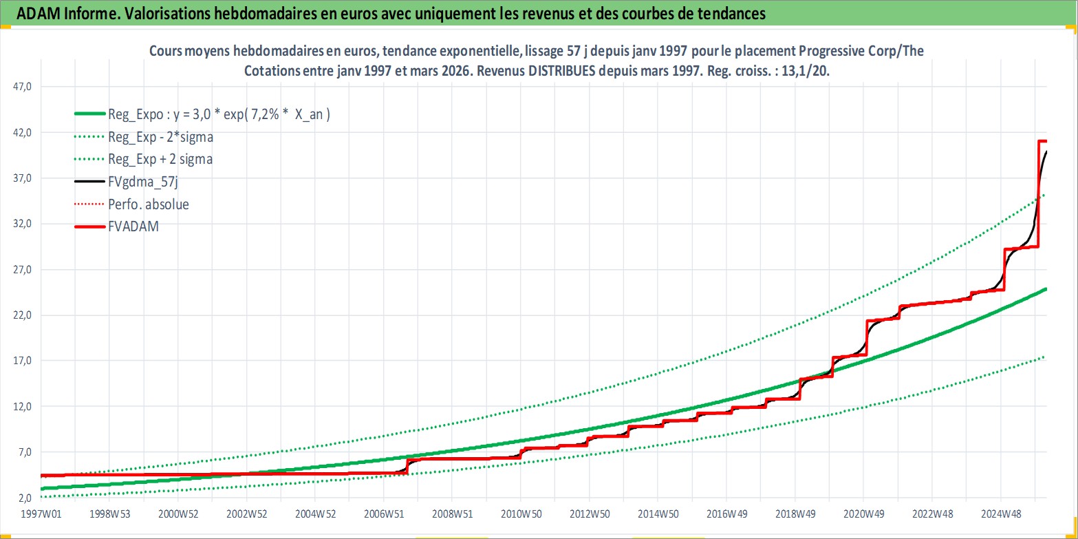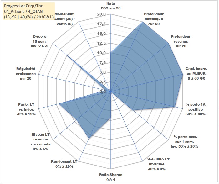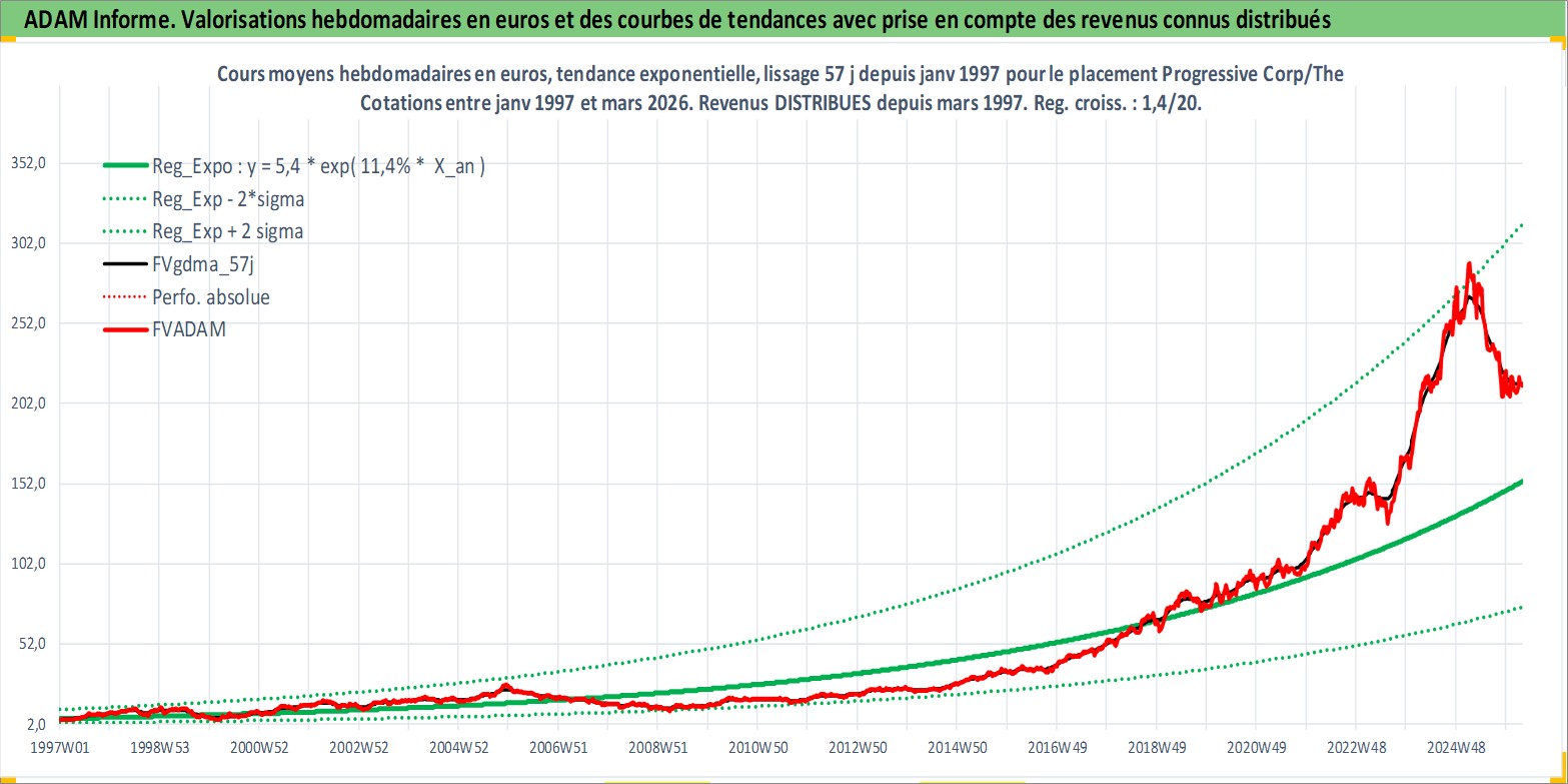 Site dédié aux investisseursPage dédiée sur site financeAnalyse des valorisations hebdomadaires de l'action Progressive Corp/The. Cet actif est cote en USD. Les valorisations sont en contrevaleur EURO et couvrent les semaines 1997W01 a 2026W13. Les revenus de cet actif financier sont pris en compte depuis la semaine 1997W11. La note globale ESG de cet actif est estimee a 10.0 (apres rebasage entre 0 et 20).