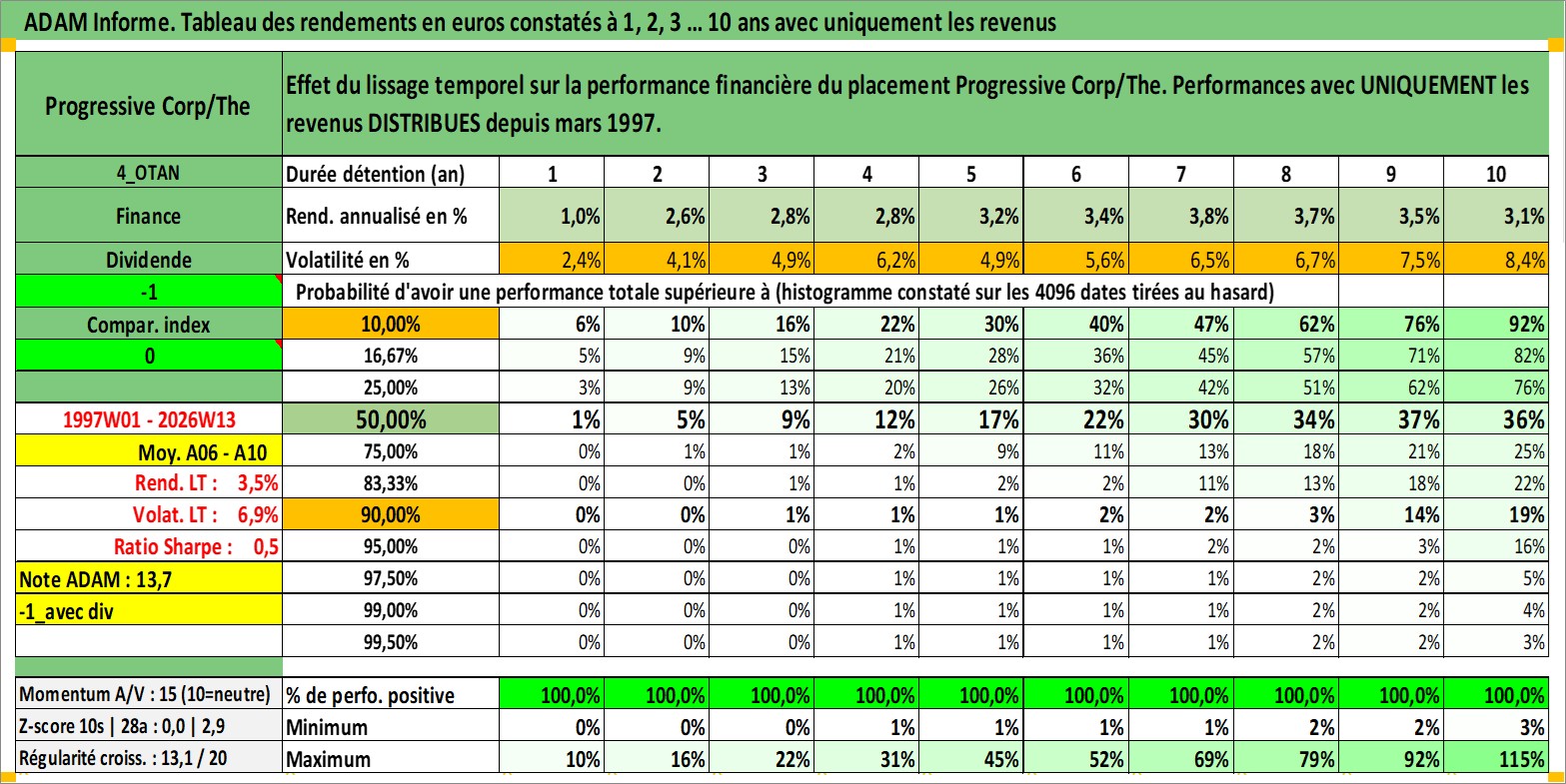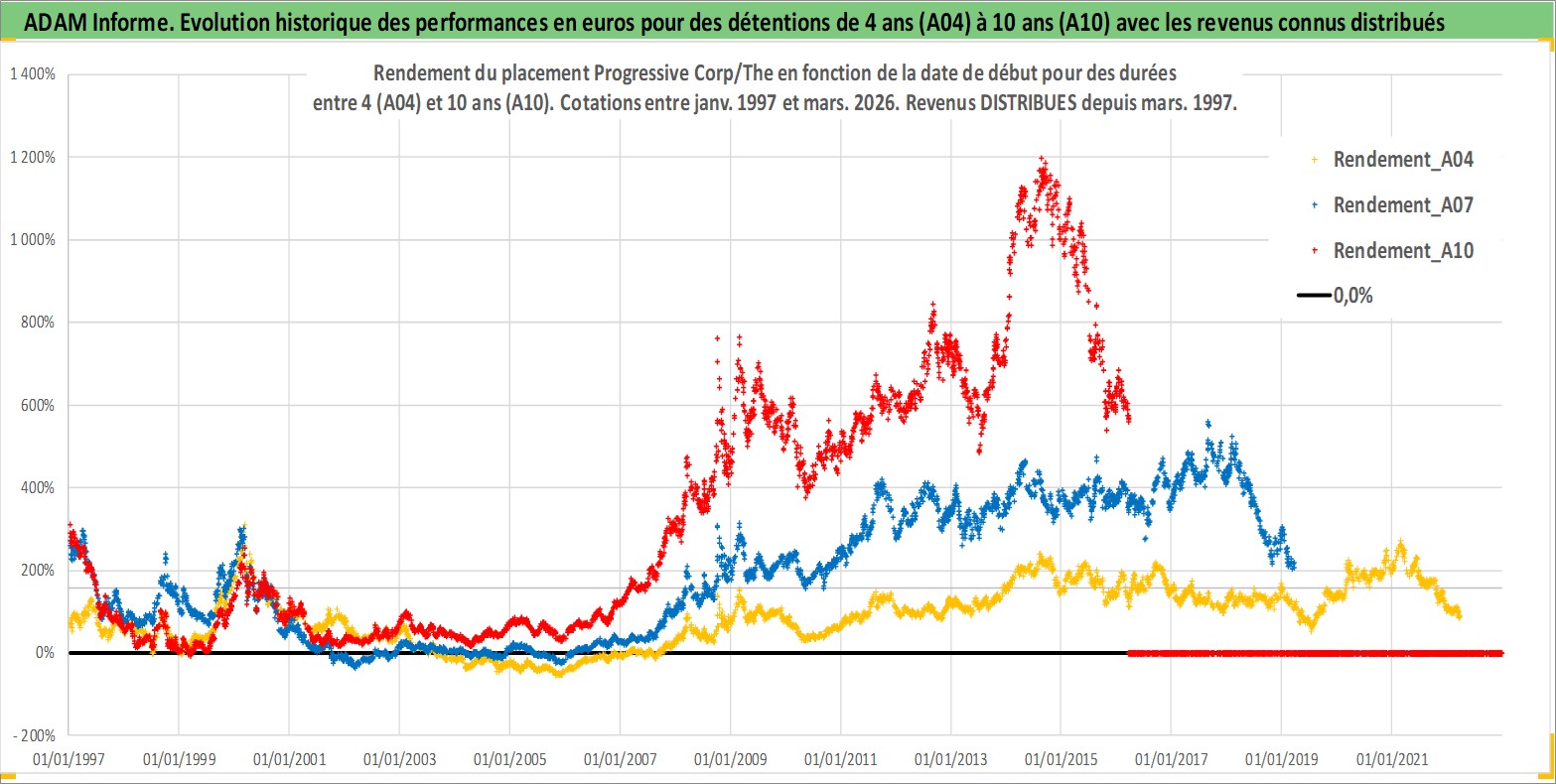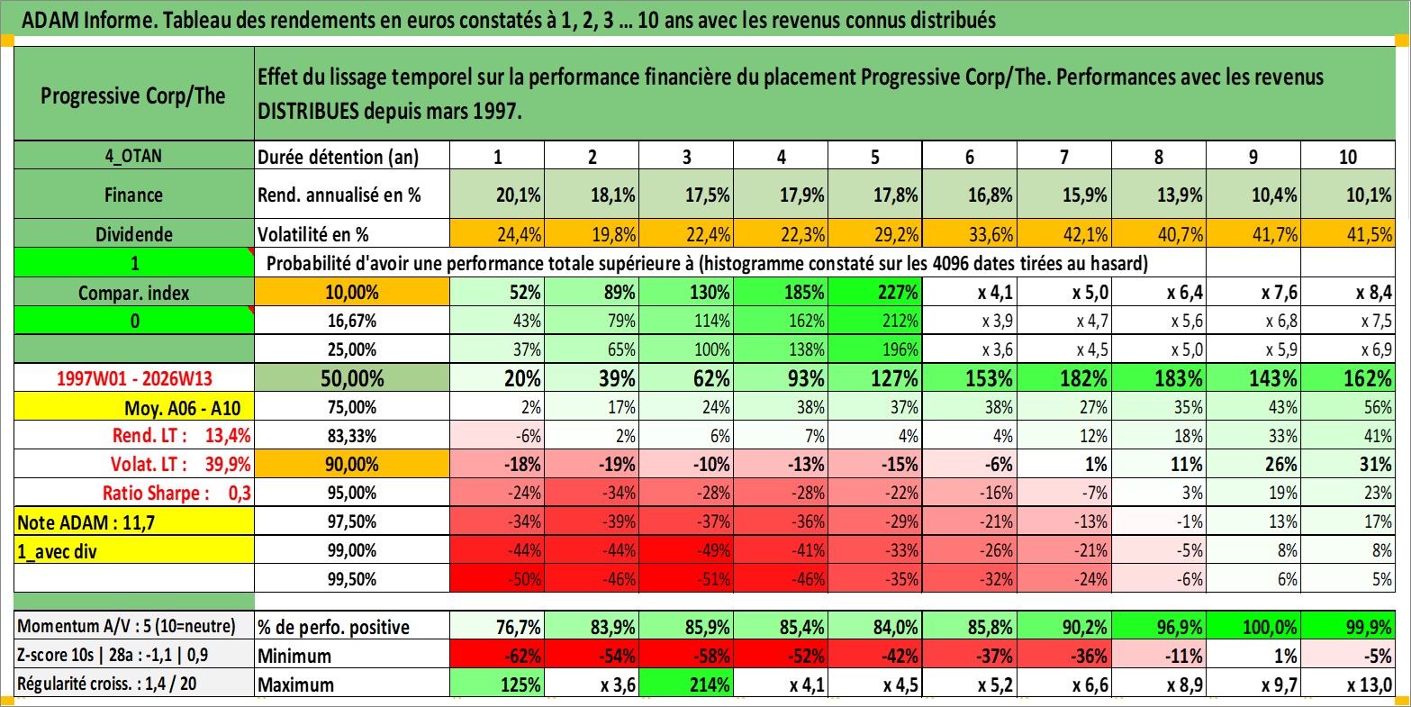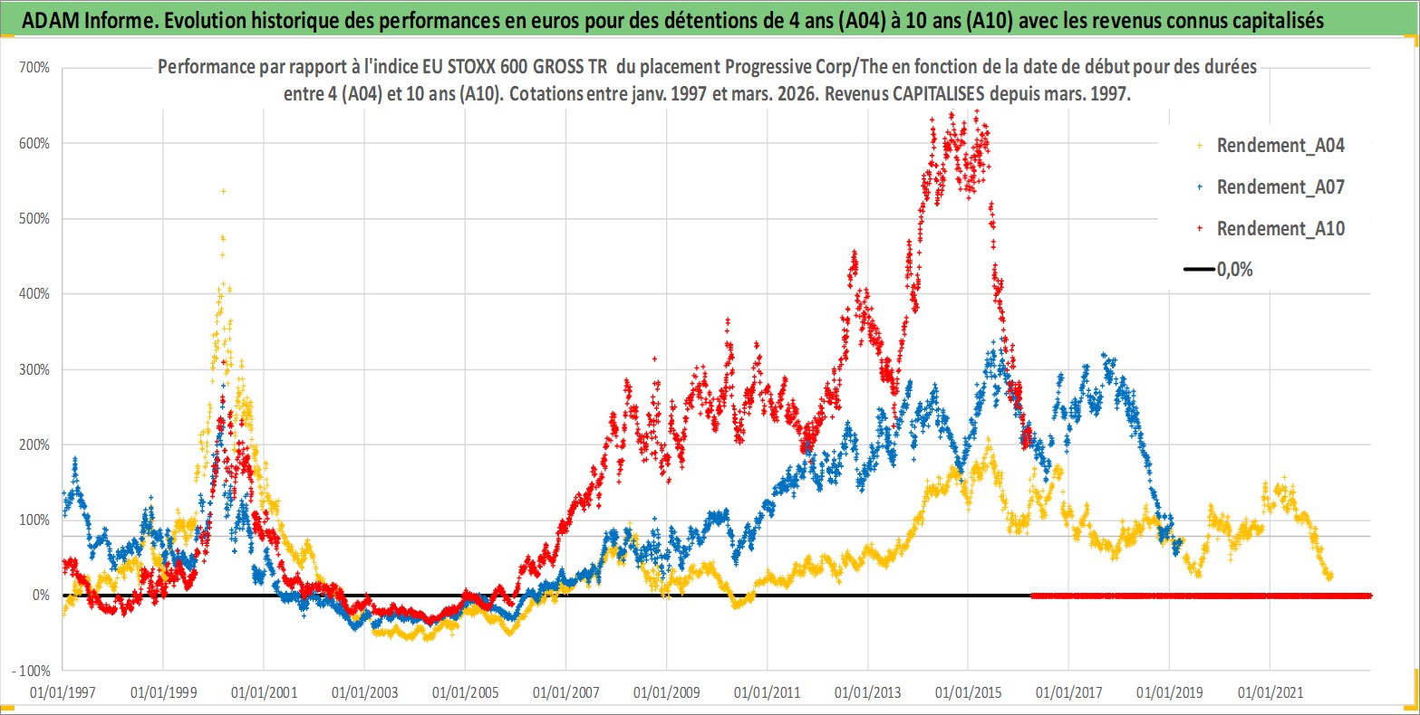Site dédié aux investisseursPage dédiée sur site financeAnalyse des valorisations hebdomadaires de l'action Progressive Corp/The. Cet actif est cote en USD. Les valorisations sont en contrevaleur EURO et couvrent les semaines 1997W01 a 2026W13. Les revenus de cet actif financier sont pris en compte depuis la semaine 1997W11. La note globale ESG de cet actif est estimee a 10.0 (apres rebasage entre 0 et 20).