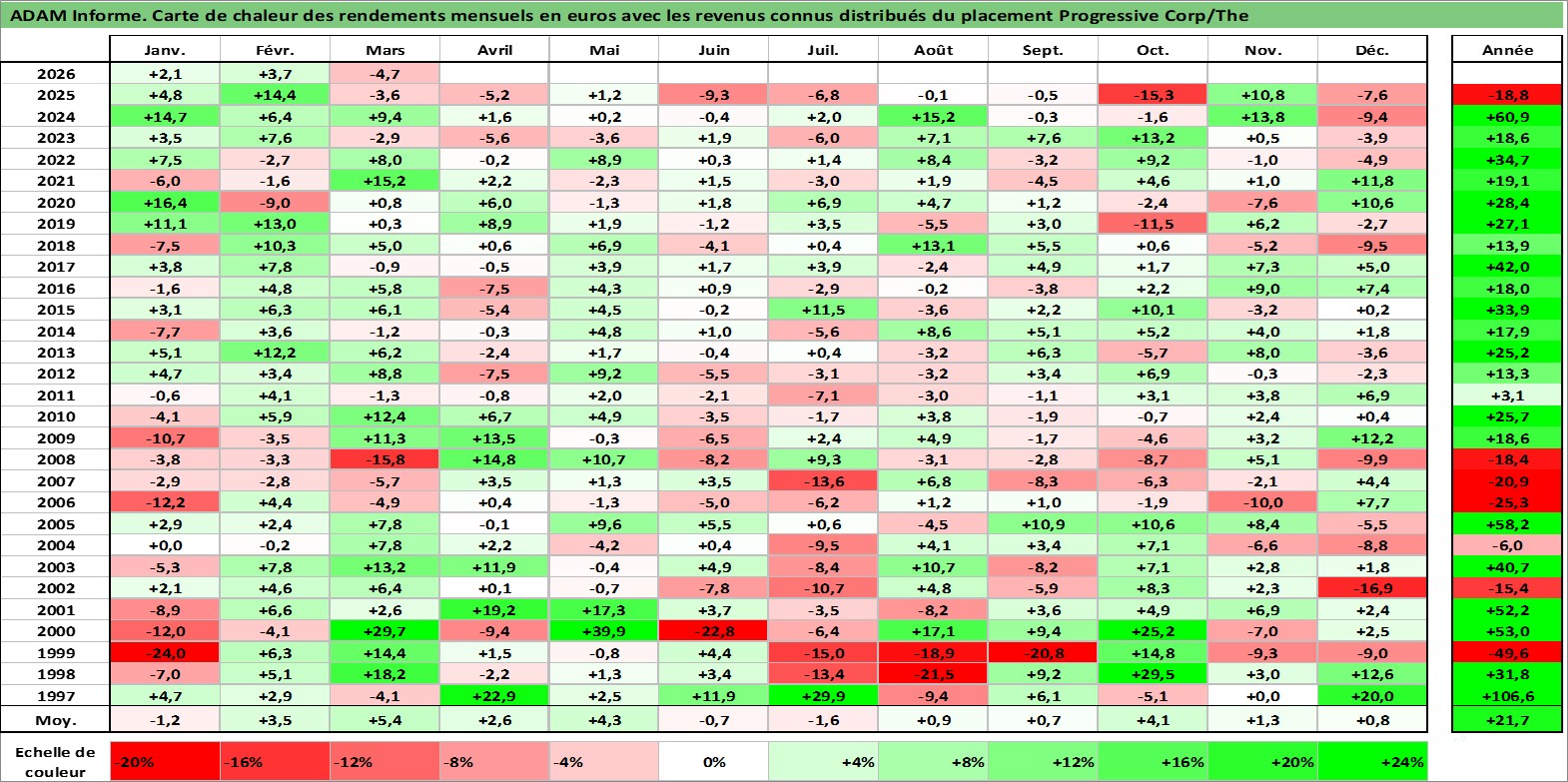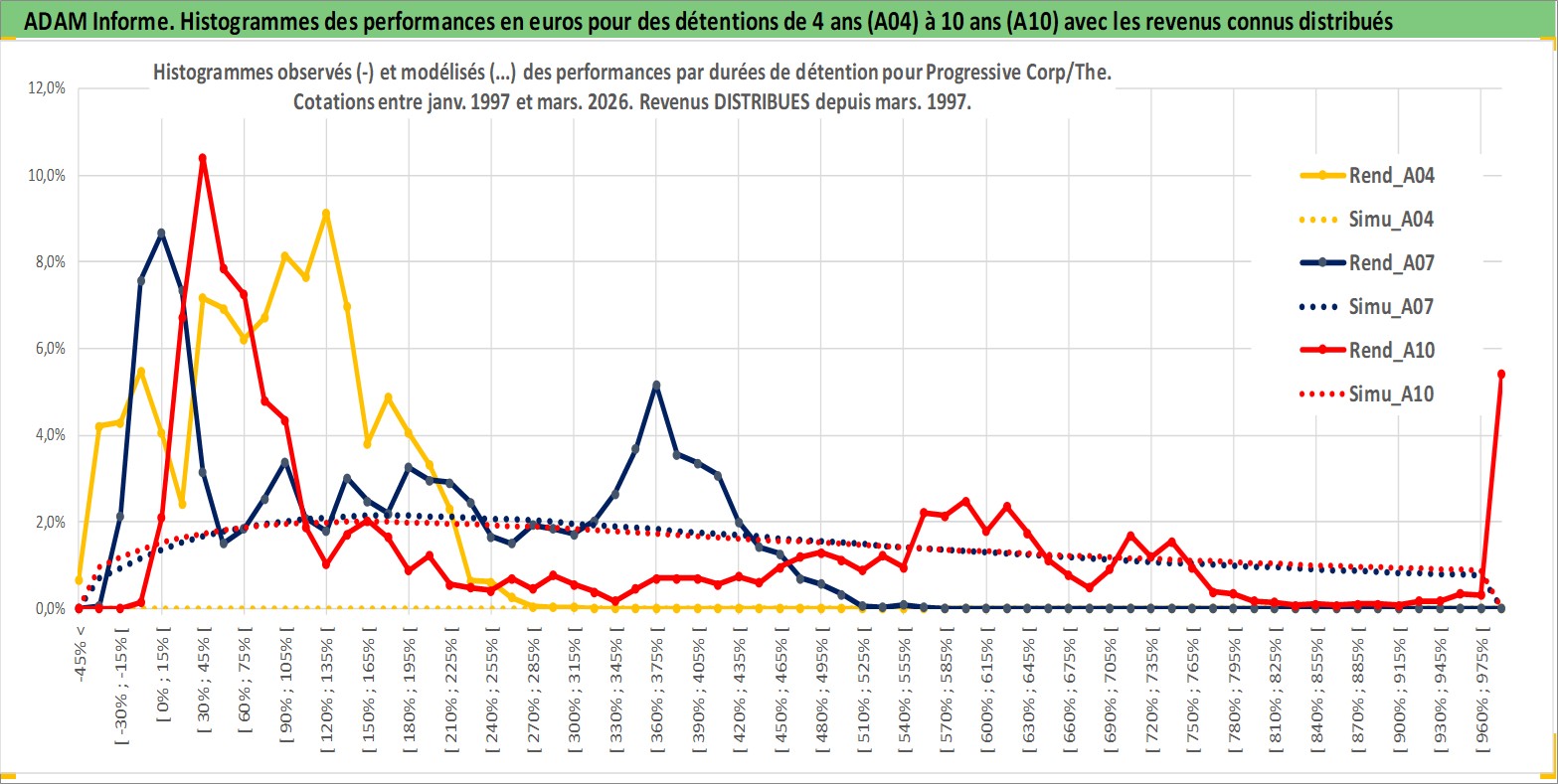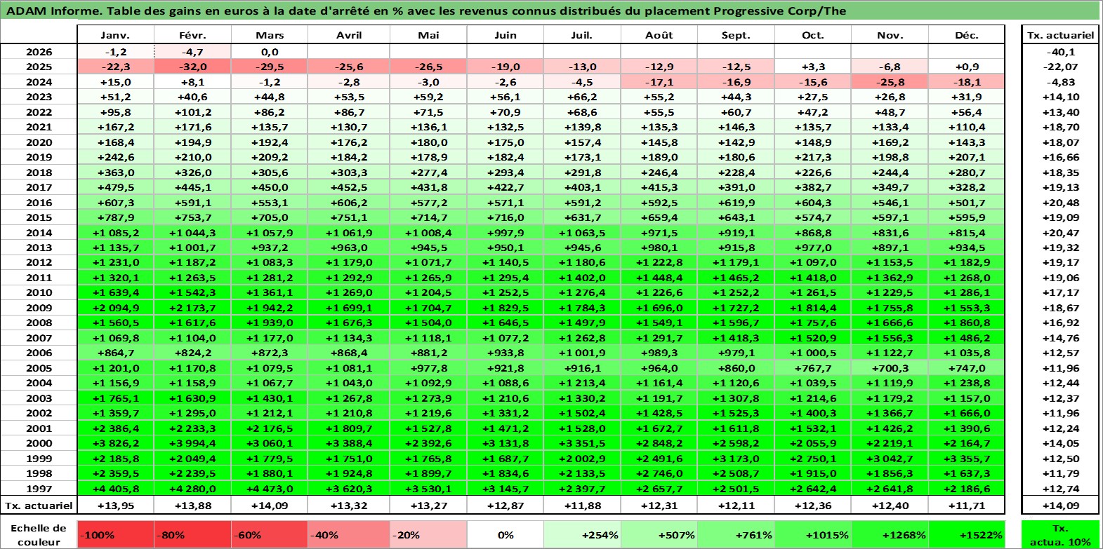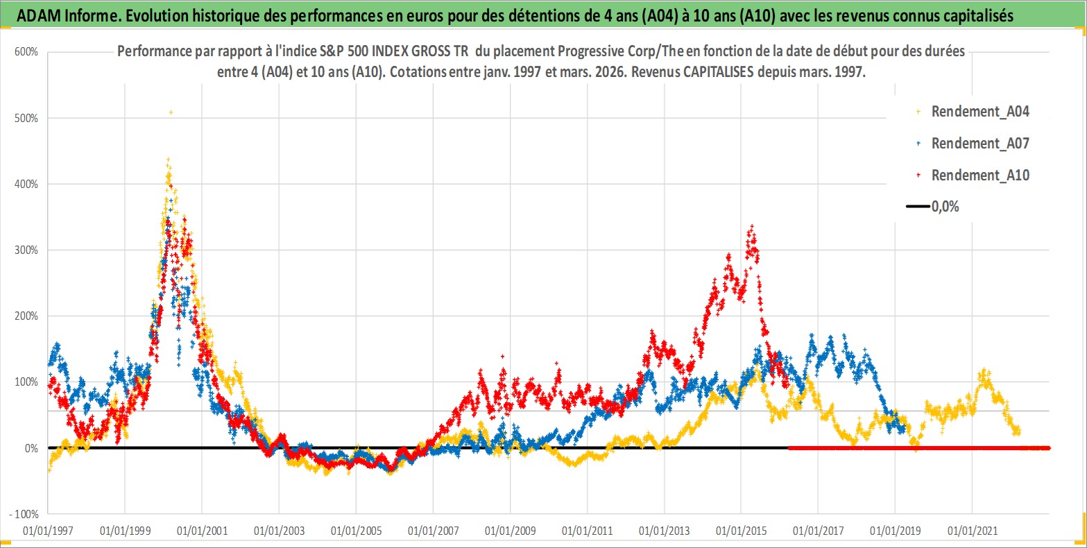 Site dédié aux investisseursPage dédiée sur site financeAnalyse des valorisations hebdomadaires de l'action Progressive Corp/The. Cet actif est cote en USD. Les valorisations sont en contrevaleur EURO et couvrent les semaines 1997W01 a 2026W13. Les revenus de cet actif financier sont pris en compte depuis la semaine 1997W11. La note globale ESG de cet actif est estimee a 10.0 (apres rebasage entre 0 et 20).