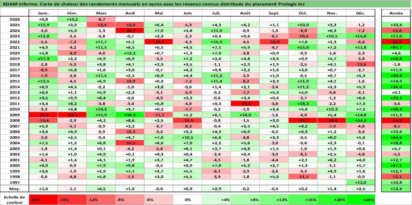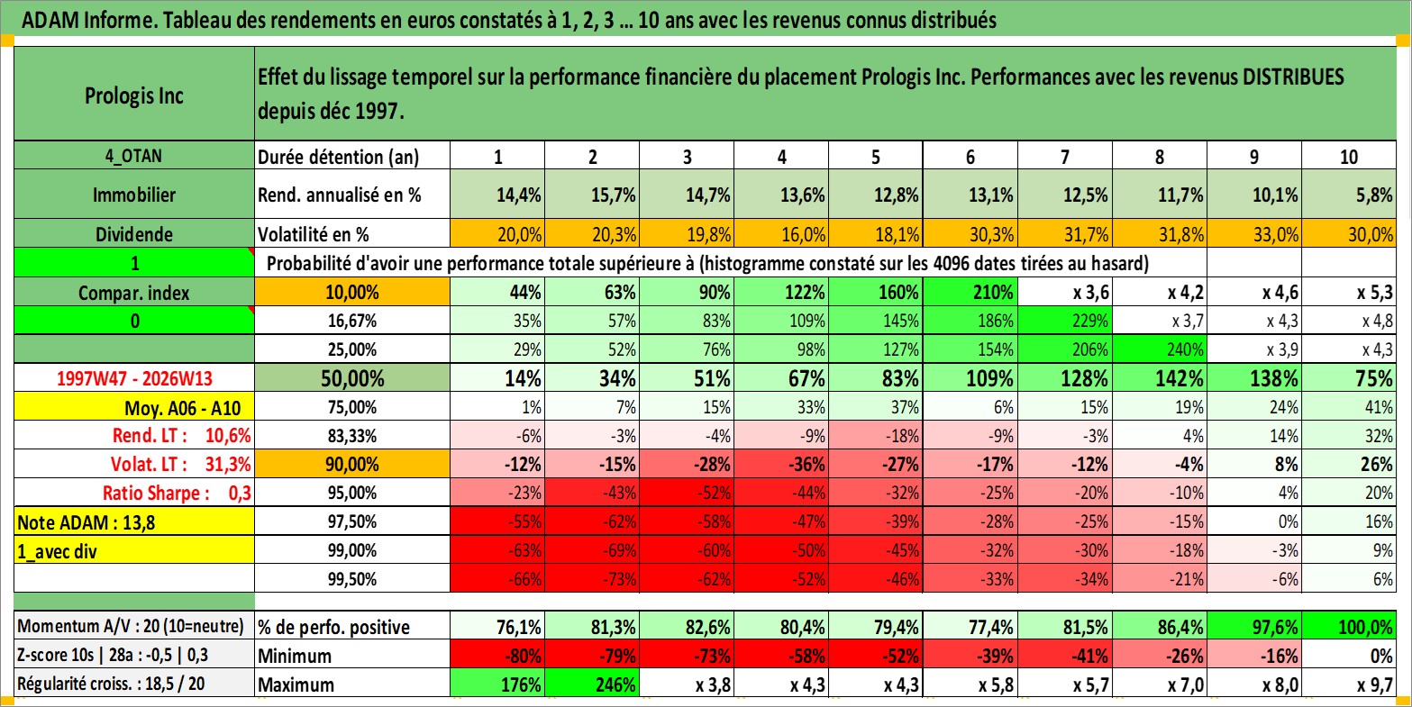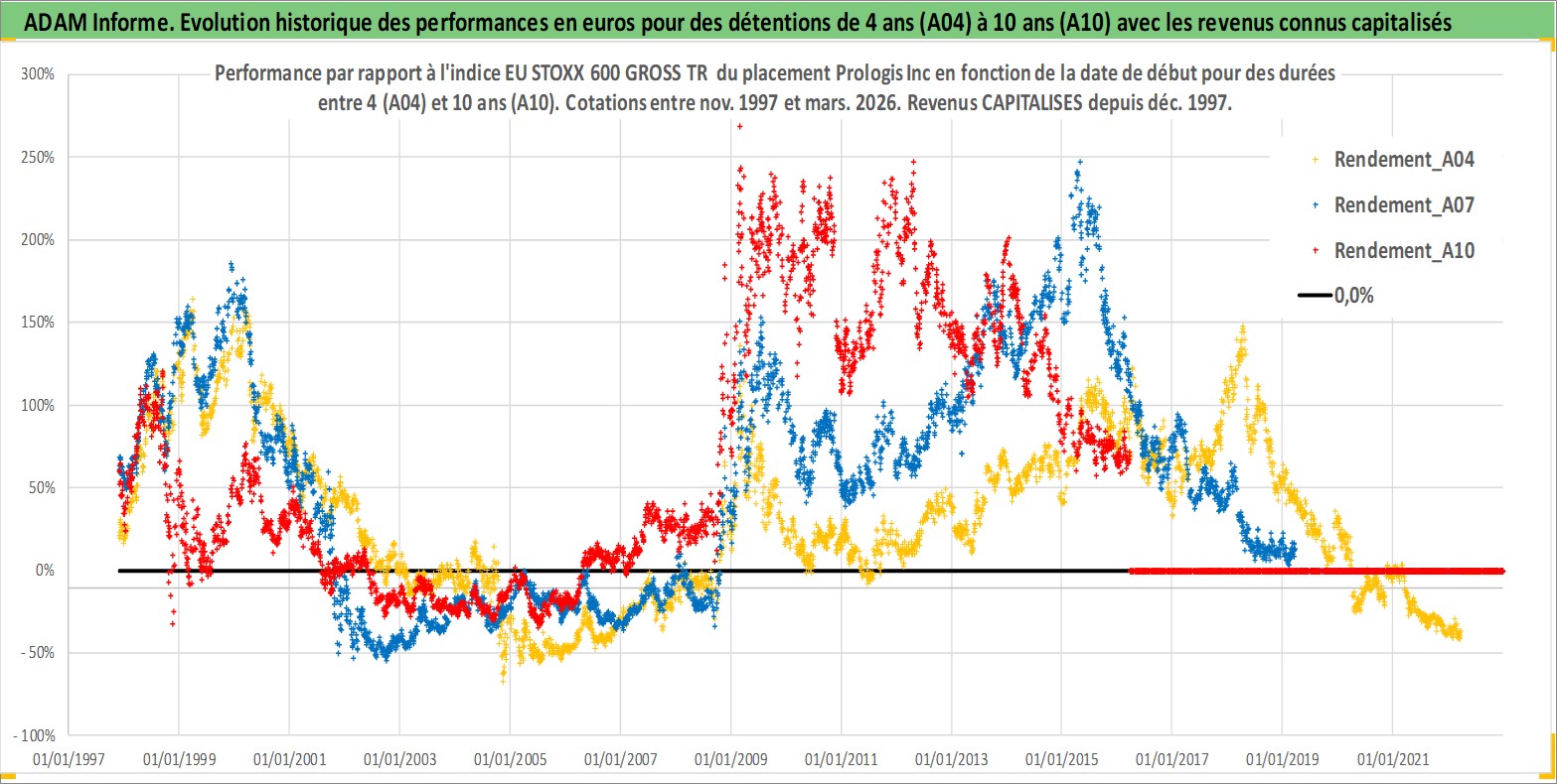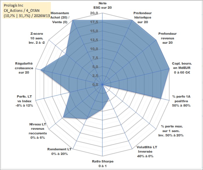 Site dédié aux investisseursPage dédiée sur site financeAnalyse des valorisations hebdomadaires de l'action Prologis Inc. Cet actif est cote en USD. Les valorisations sont en contrevaleur EURO et couvrent les semaines 1997W47 a 2026W13. Les revenus de cet actif financier sont pris en compte depuis la semaine 1997W51. La note globale ESG de cet actif est estimee a 18.0 (apres rebasage entre 0 et 20).