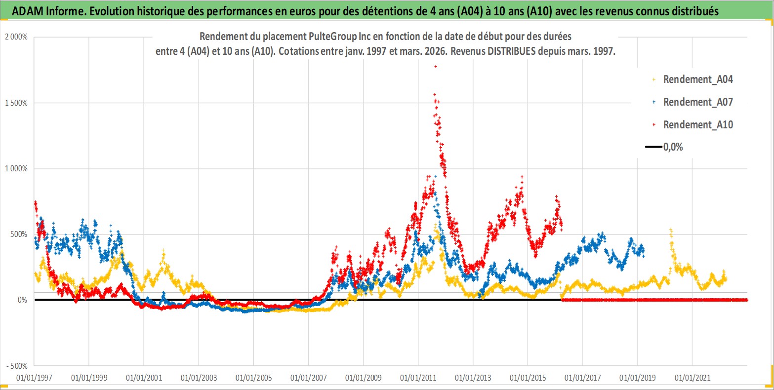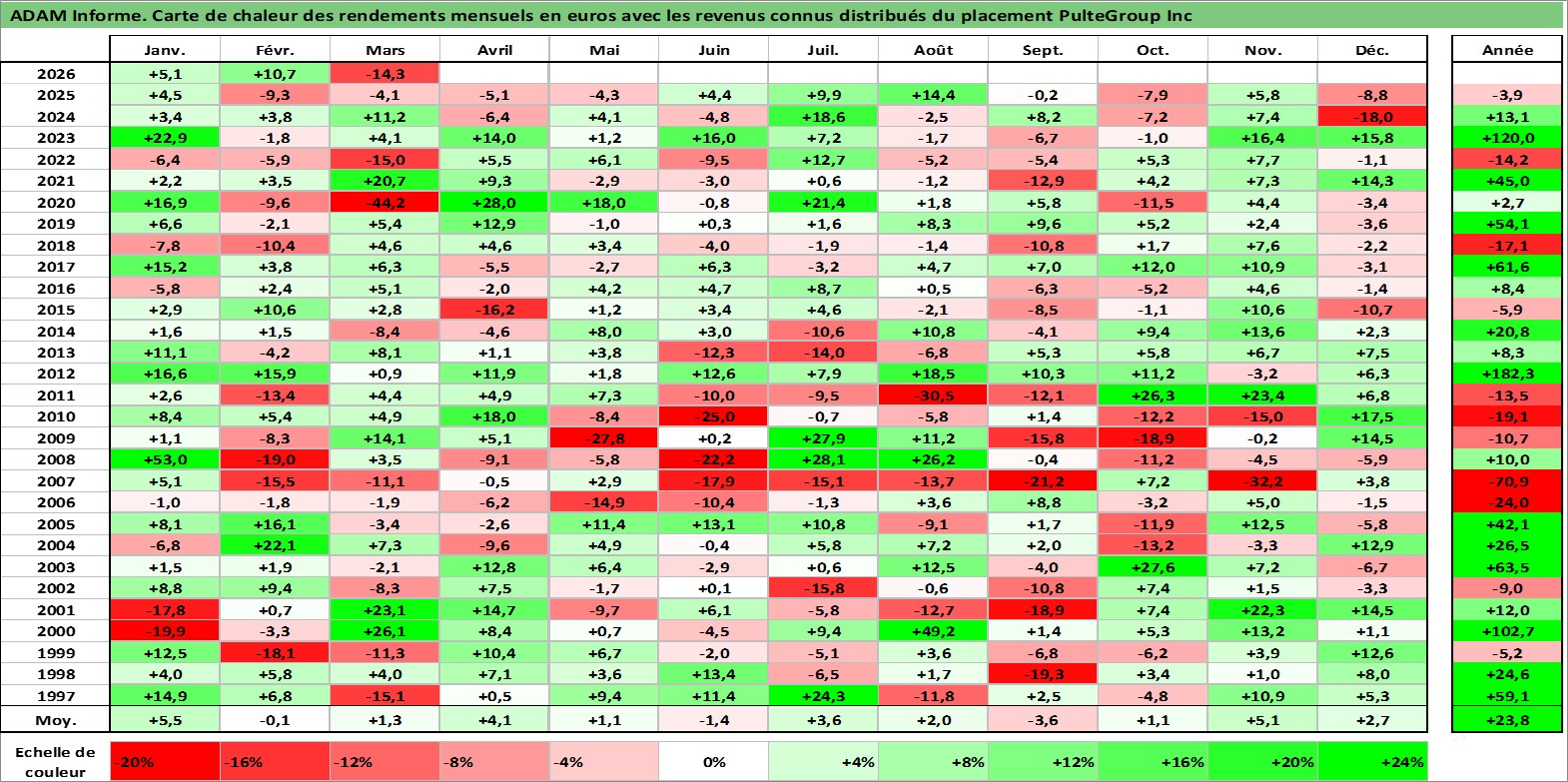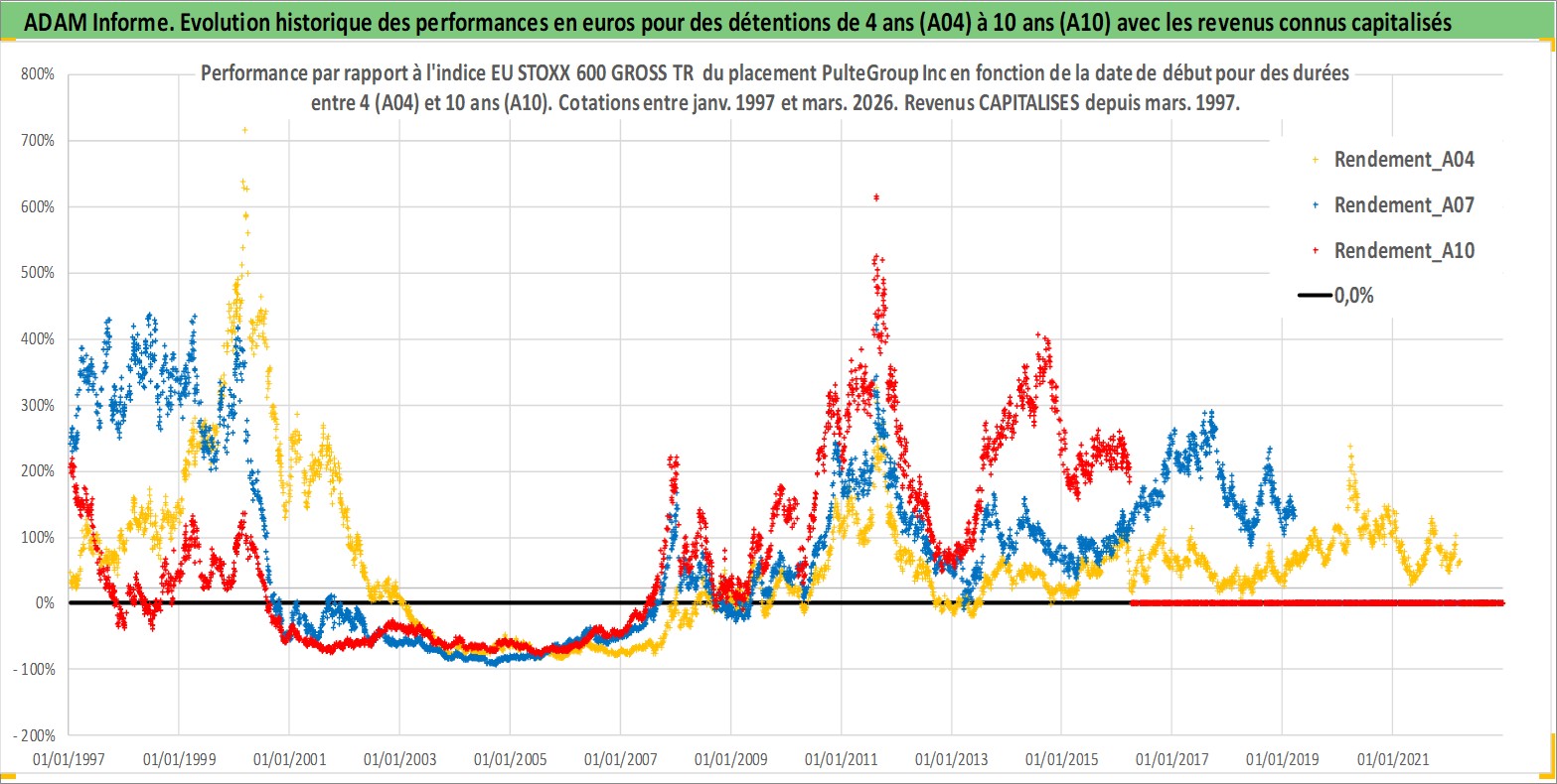 Site dédié aux investisseursPage dédiée sur site financeAnalyse des valorisations hebdomadaires de l'action PulteGroup Inc. Cet actif est cote en USD. Les valorisations sont en contrevaleur EURO et couvrent les semaines 1997W01 a 2026W13. Les revenus de cet actif financier sont pris en compte depuis la semaine 1997W13. La note globale ESG de cet actif est estimee a 10.0 (apres rebasage entre 0 et 20).