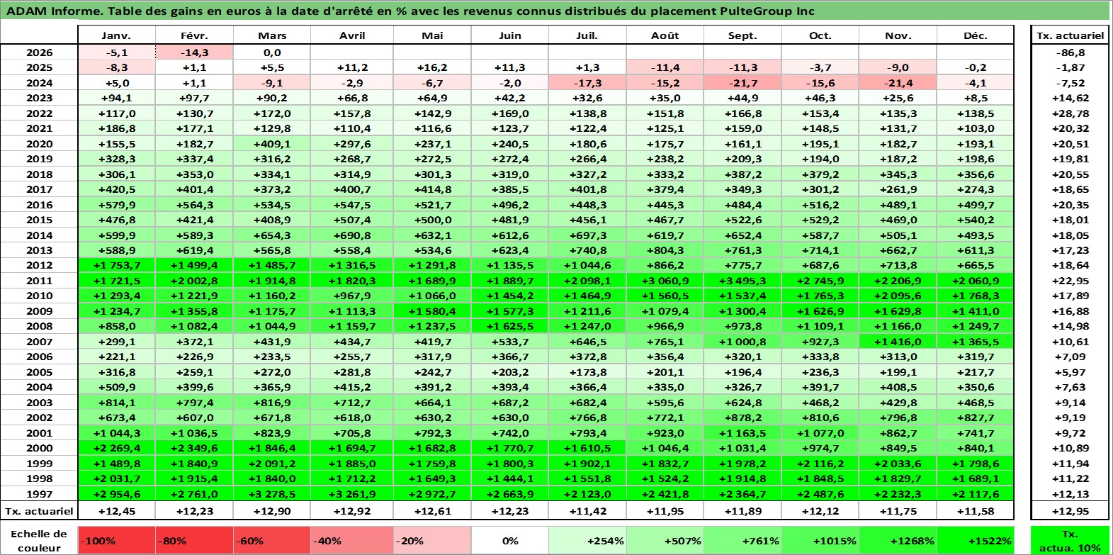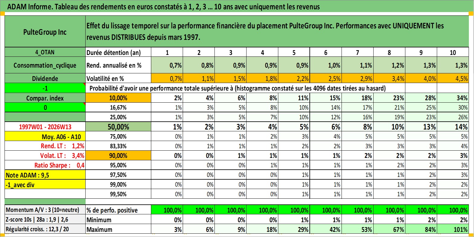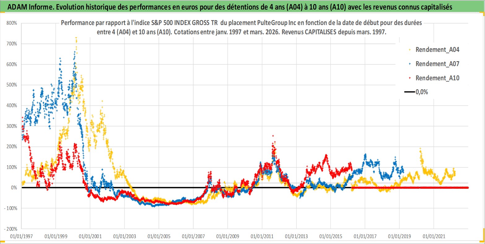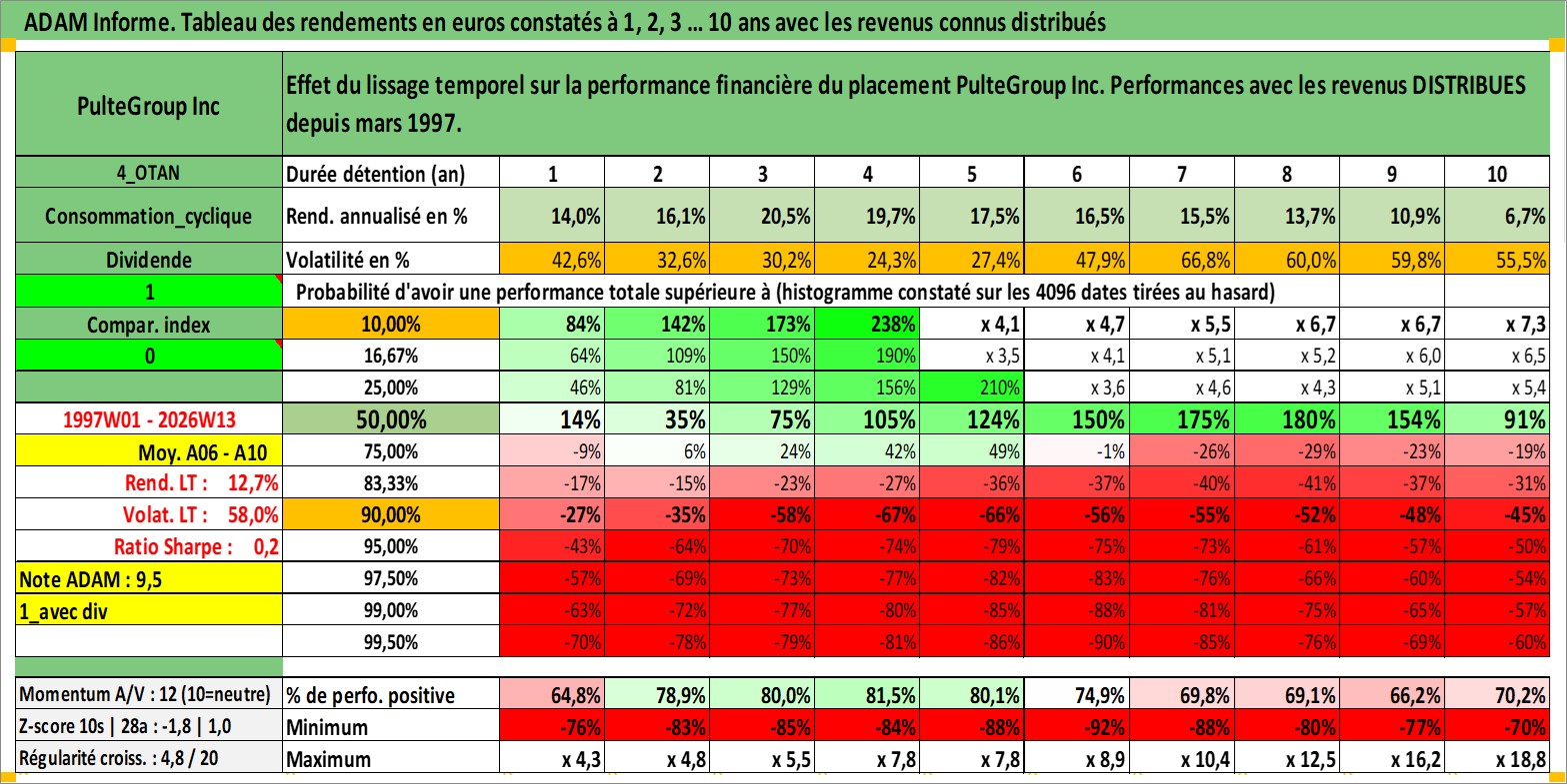 Site dédié aux investisseursPage dédiée sur site financeAnalyse des valorisations hebdomadaires de l'action PulteGroup Inc. Cet actif est cote en USD. Les valorisations sont en contrevaleur EURO et couvrent les semaines 1997W01 a 2026W13. Les revenus de cet actif financier sont pris en compte depuis la semaine 1997W13. La note globale ESG de cet actif est estimee a 10.0 (apres rebasage entre 0 et 20).