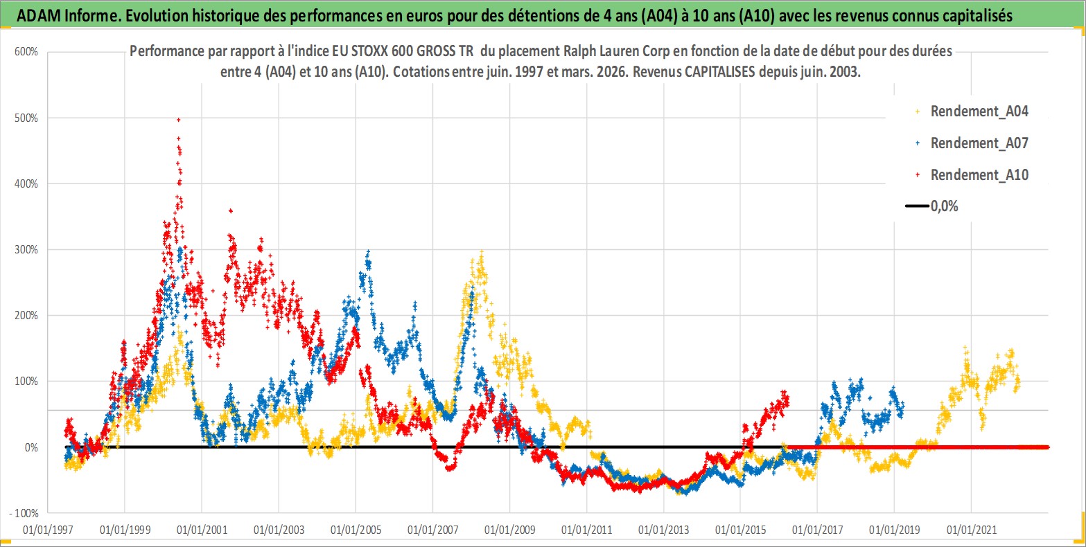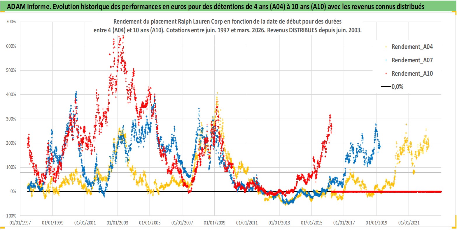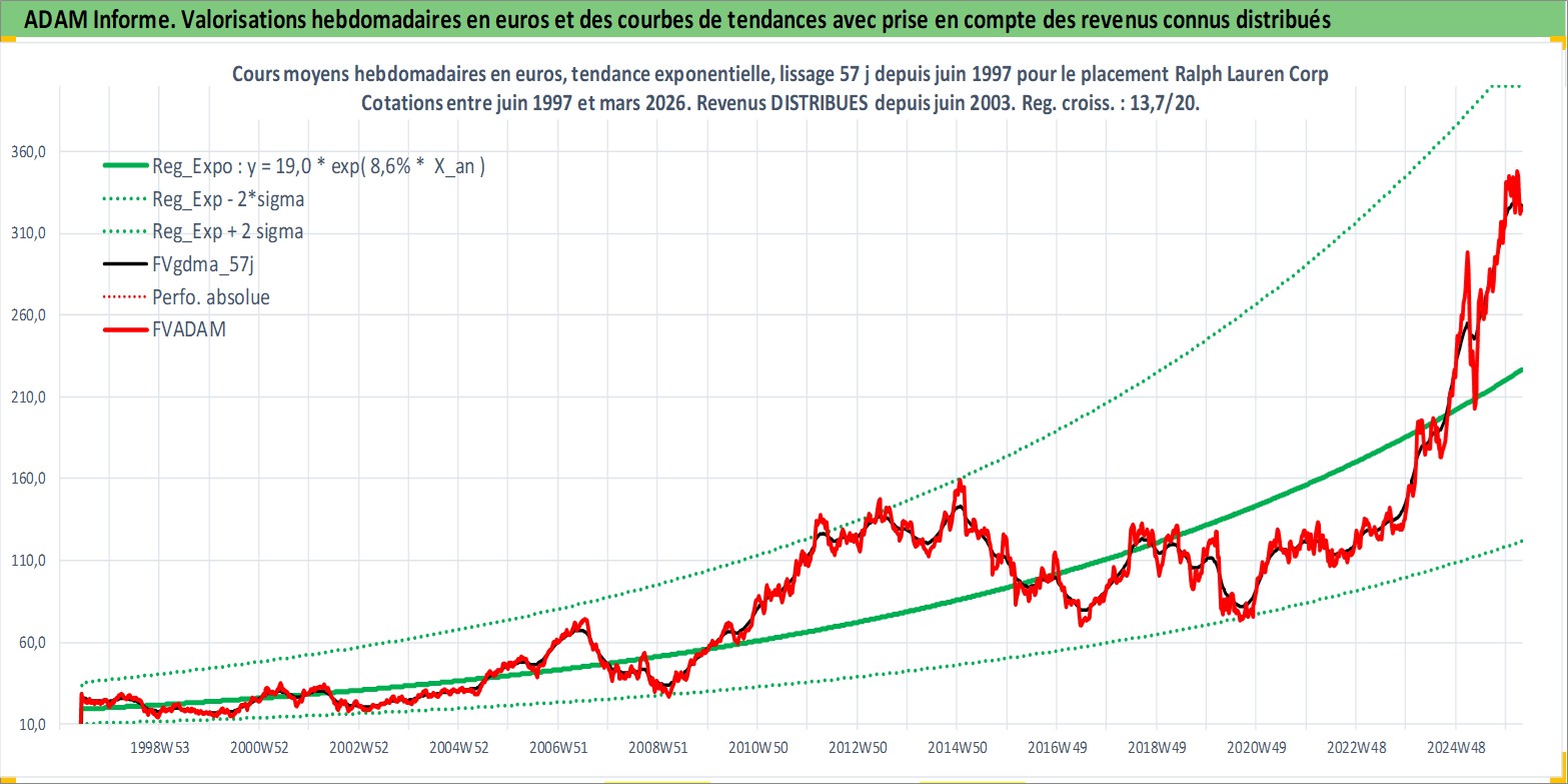 Site dédié aux investisseursPage dédiée sur site financeAnalyse des valorisations hebdomadaires de l'action Ralph Lauren Corp. Cet actif est cote en USD. Les valorisations sont en contrevaleur EURO et couvrent les semaines 1997W24 a 2026W13. Les revenus de cet actif financier sont pris en compte depuis la semaine 2003W26. La note globale ESG de cet actif est estimee a 15.0 (apres rebasage entre 0 et 20).