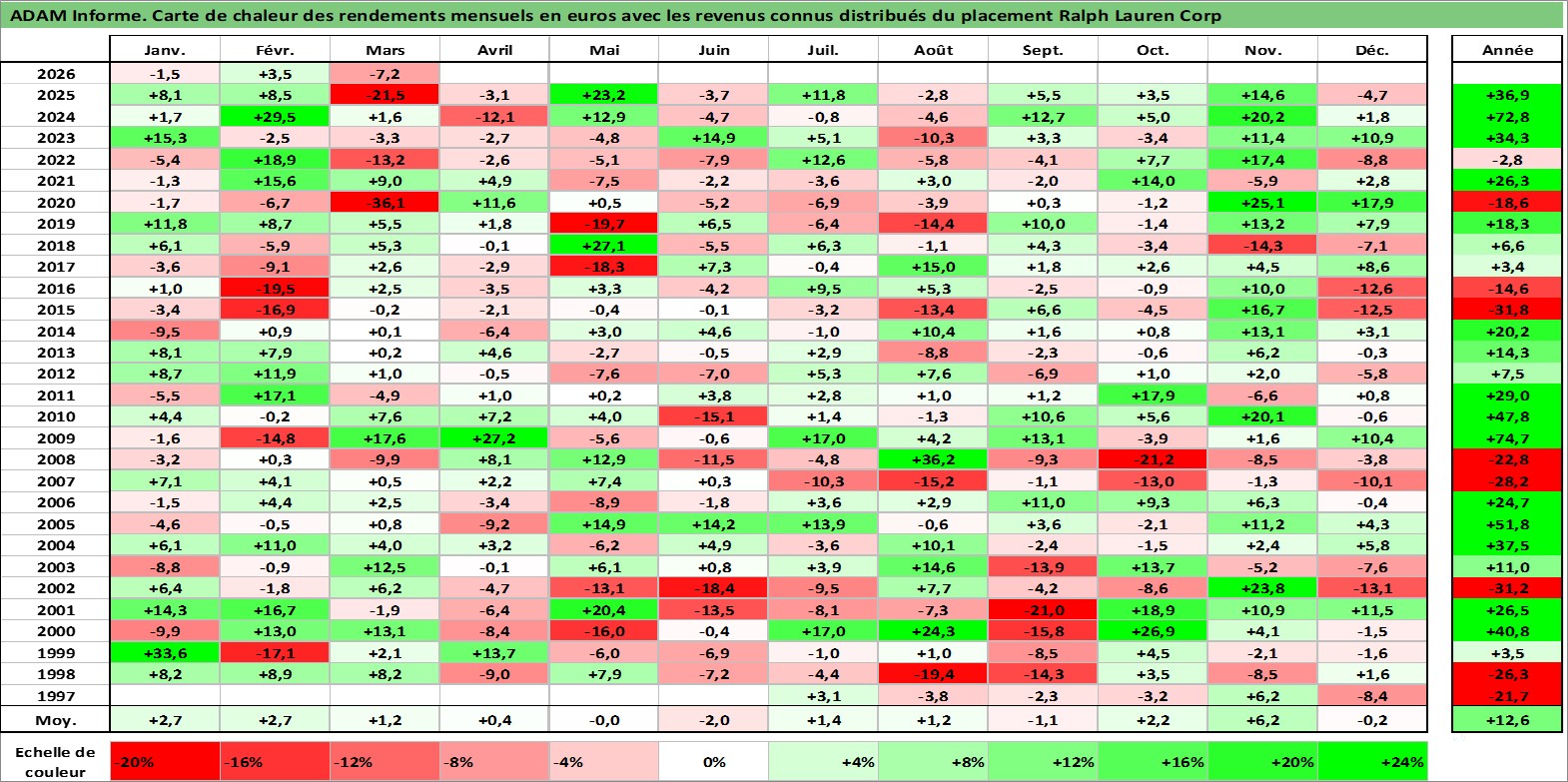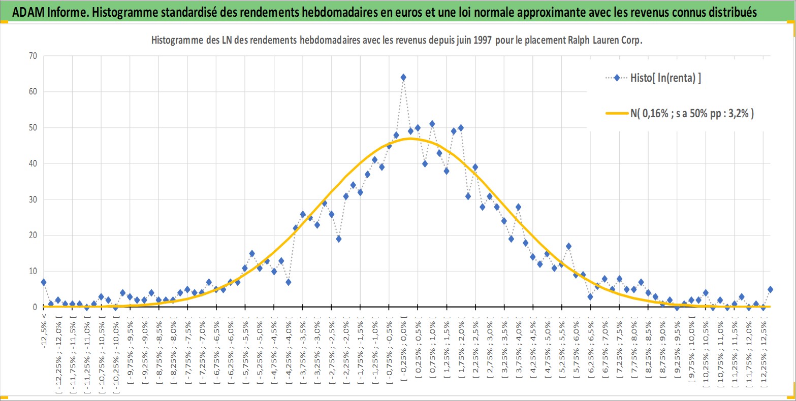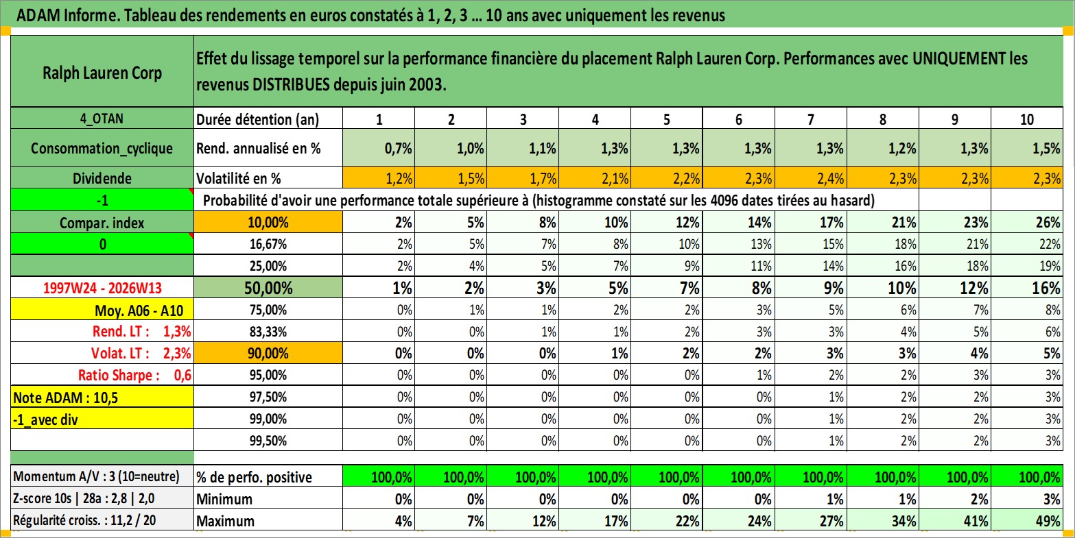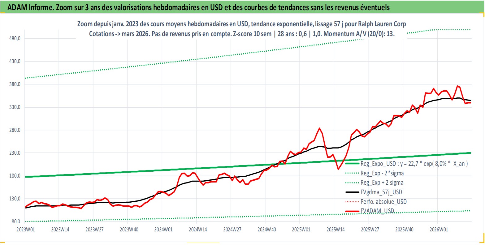 Site dédié aux investisseursPage dédiée sur site financeAnalyse des valorisations hebdomadaires de l'action Ralph Lauren Corp. Cet actif est cote en USD. Les valorisations sont en contrevaleur EURO et couvrent les semaines 1997W24 a 2026W13. Les revenus de cet actif financier sont pris en compte depuis la semaine 2003W26. La note globale ESG de cet actif est estimee a 15.0 (apres rebasage entre 0 et 20).