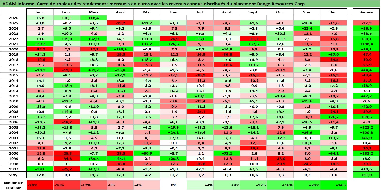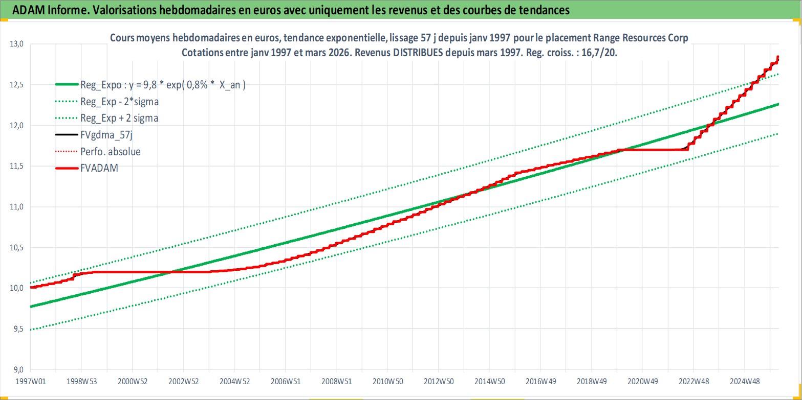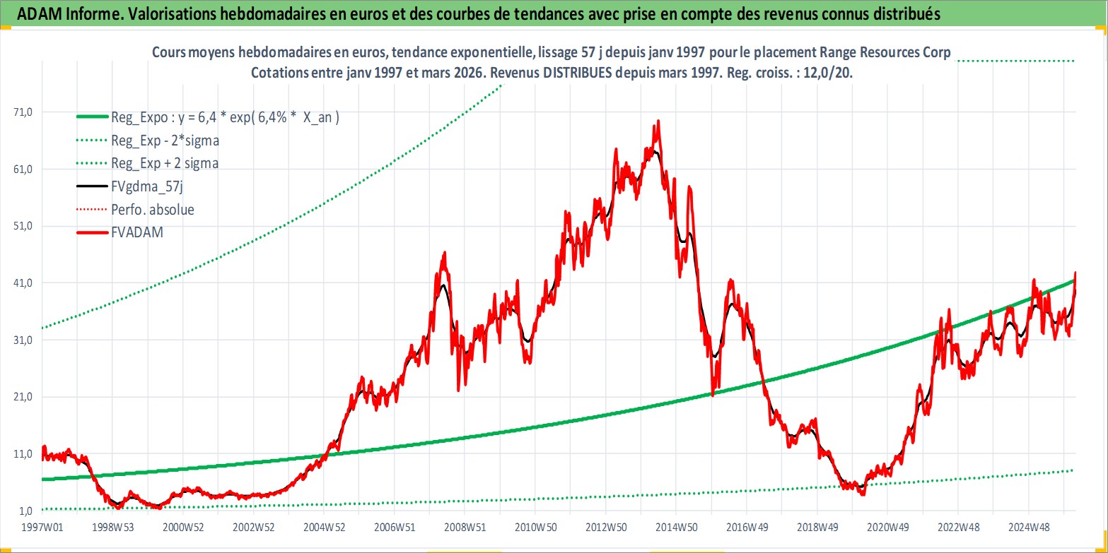 Site dédié aux investisseursPage dédiée sur site financeAnalyse des valorisations hebdomadaires de l'action Range Resources Corp. Cet actif est cote en USD. Les valorisations sont en contrevaleur EURO et couvrent les semaines 1997W01 a 2026W13. Les revenus de cet actif financier sont pris en compte depuis la semaine 1997W13. La note globale ESG de cet actif est estimee a 1.0 (apres rebasage entre 0 et 20).