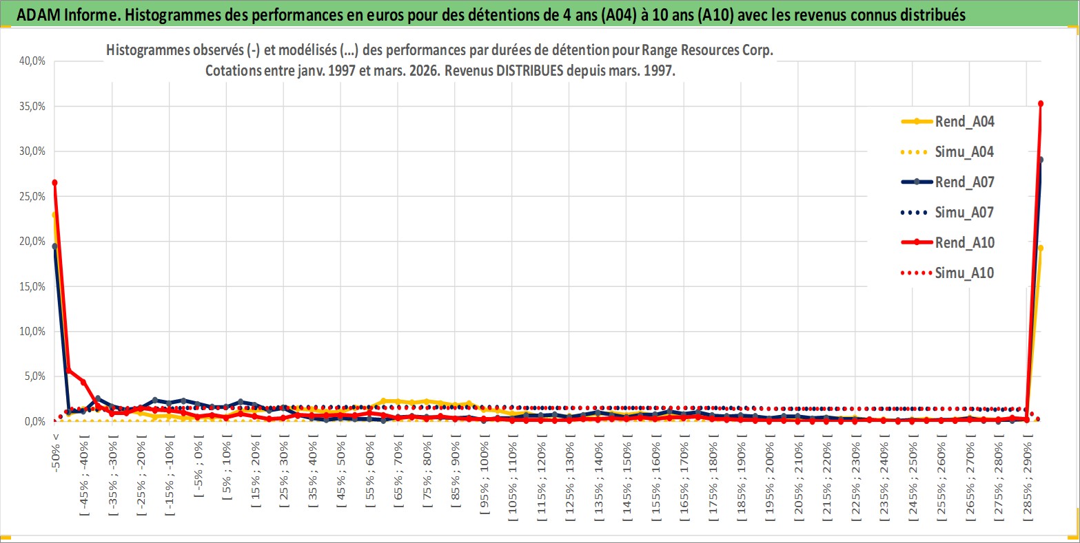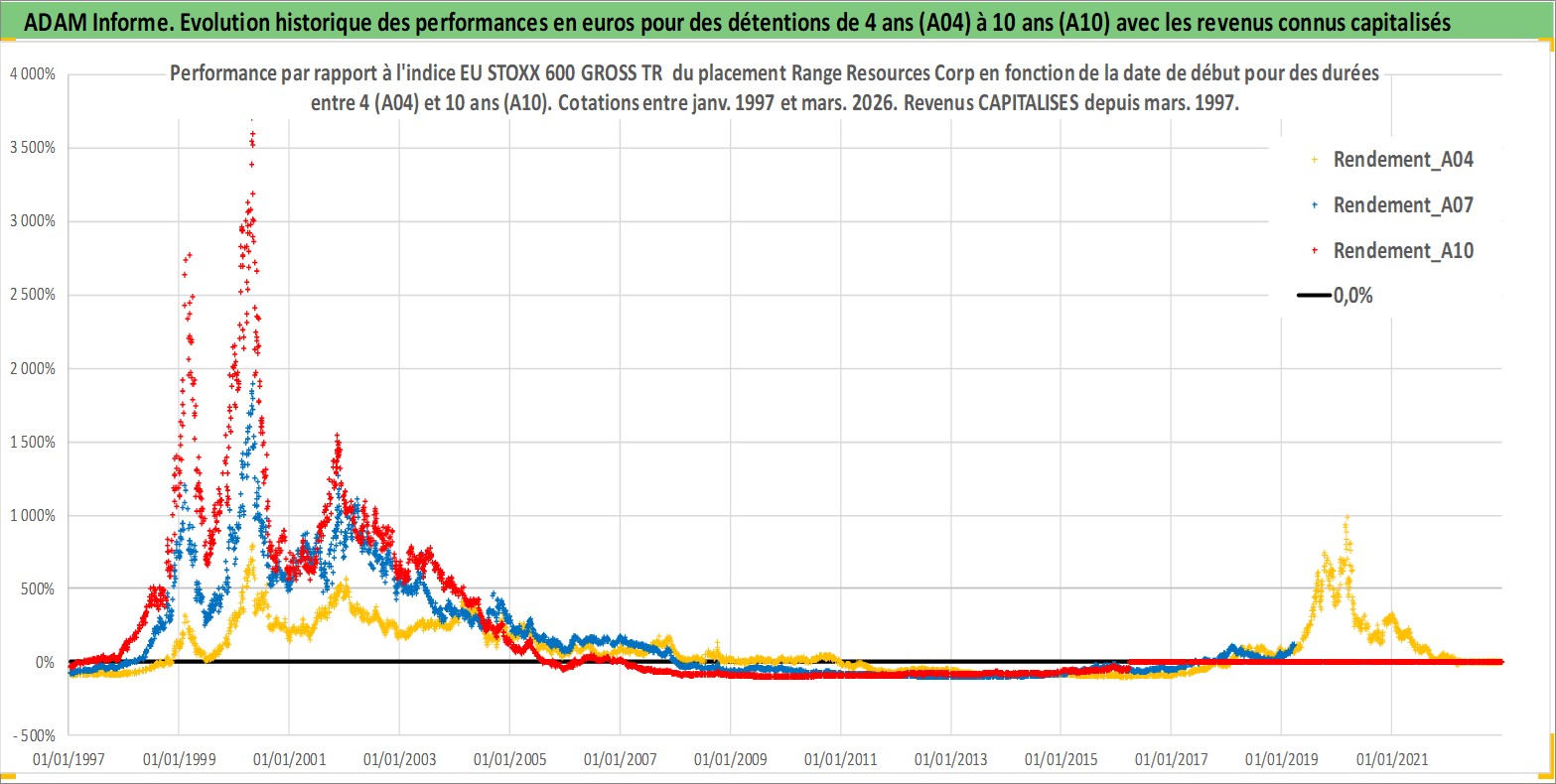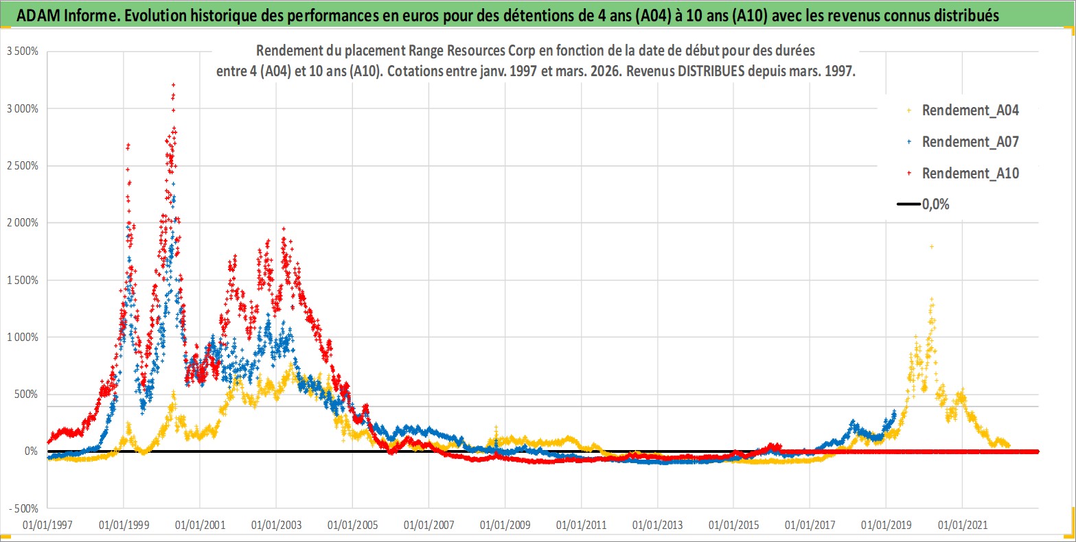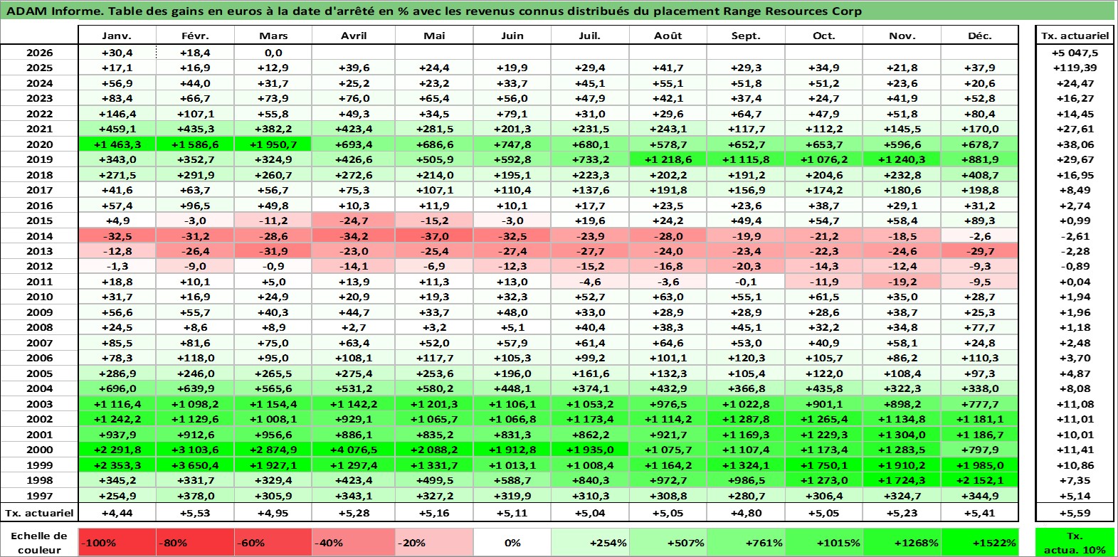 Site dédié aux investisseursPage dédiée sur site financeAnalyse des valorisations hebdomadaires de l'action Range Resources Corp. Cet actif est cote en USD. Les valorisations sont en contrevaleur EURO et couvrent les semaines 1997W01 a 2026W13. Les revenus de cet actif financier sont pris en compte depuis la semaine 1997W13. La note globale ESG de cet actif est estimee a 1.0 (apres rebasage entre 0 et 20).
