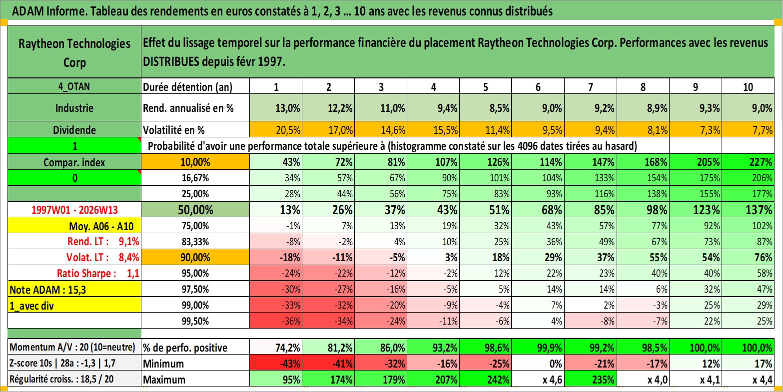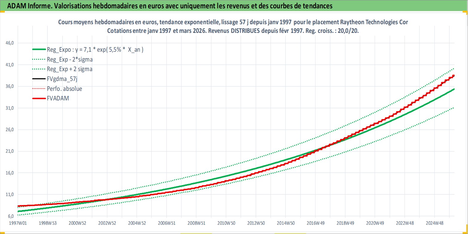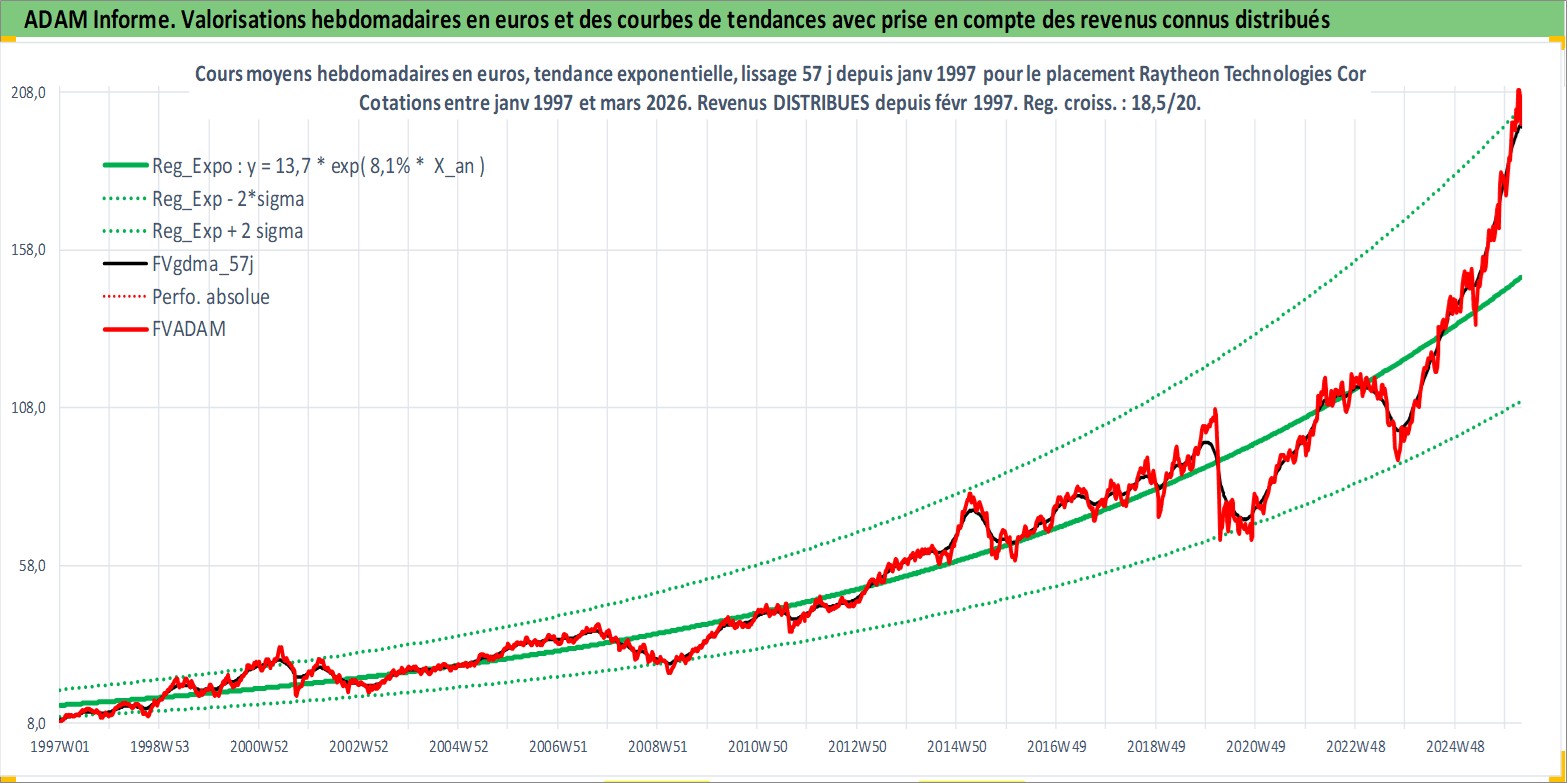 Site dédié aux investisseursPage dédiée sur site financeAnalyse des valorisations hebdomadaires de l'action Raytheon Technologies Corp. Cet actif est cote en USD. Les valorisations sont en contrevaleur EURO et couvrent les semaines 1997W01 a 2026W13. Les revenus de cet actif financier sont pris en compte depuis la semaine 1997W08. La note ESG de cet actif n'est pas connue.
